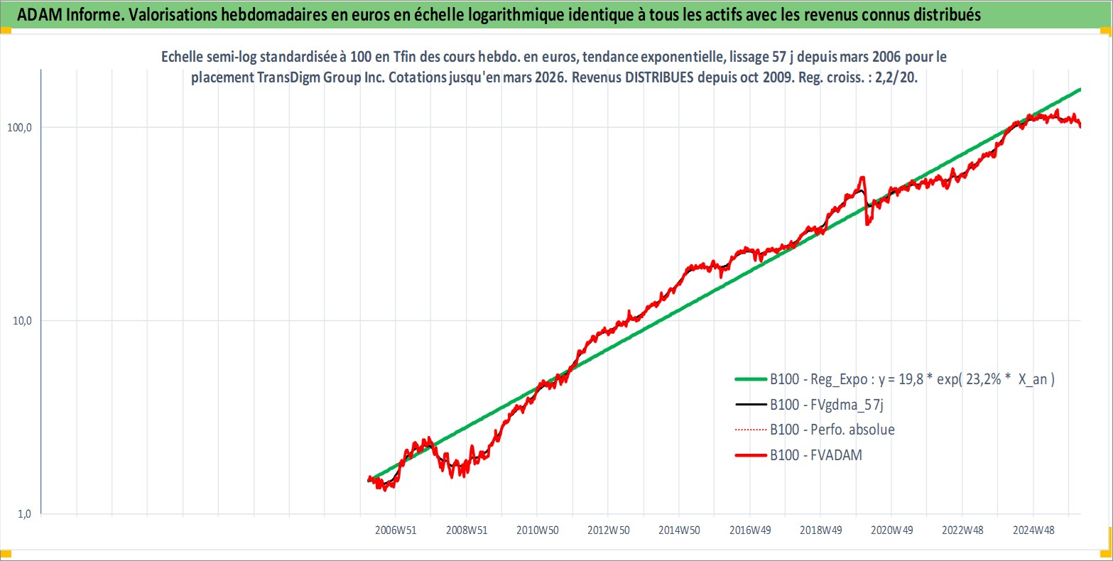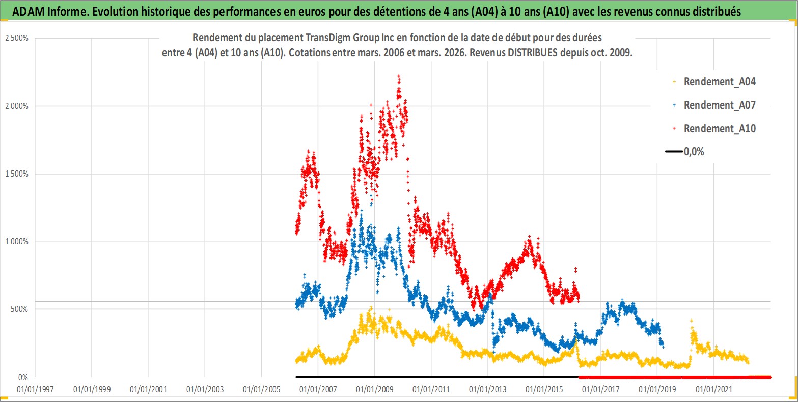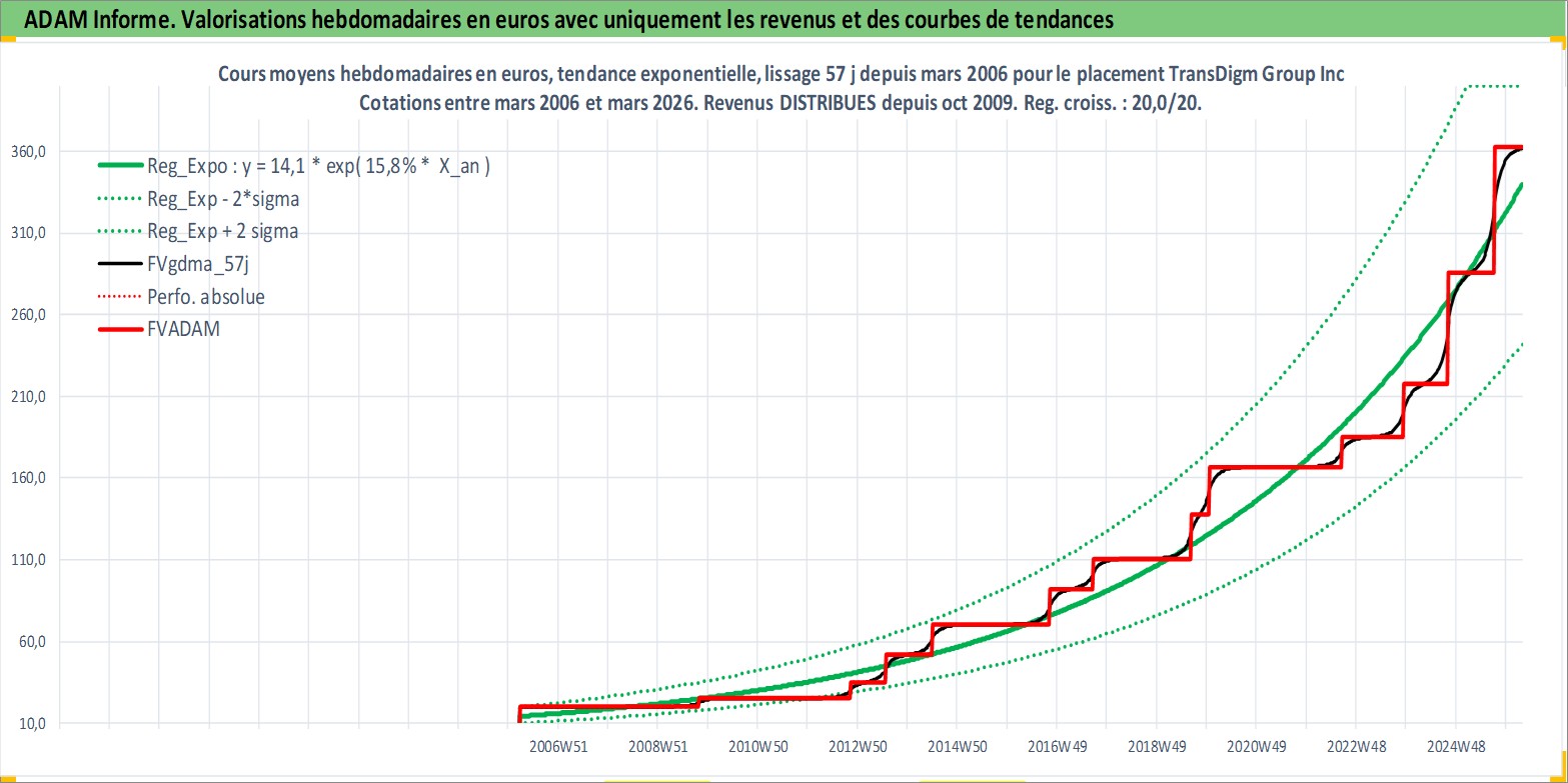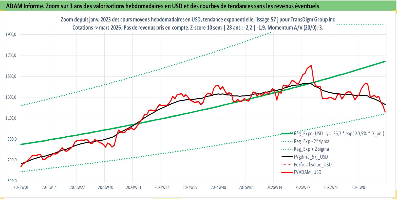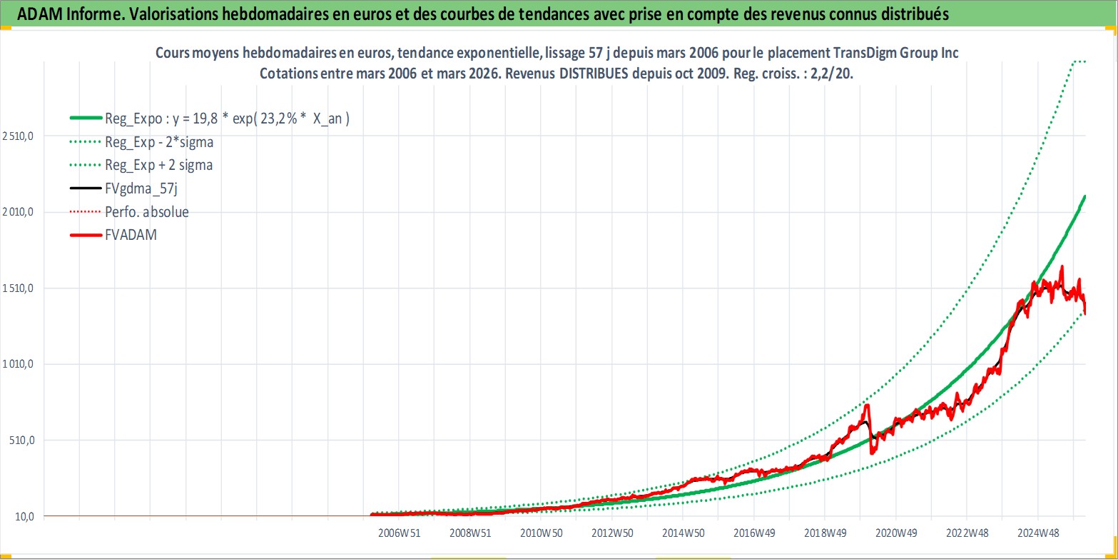 Site dédié aux investisseursPage dédiée sur site financeAnalyse des valorisations hebdomadaires de l'action TransDigm Group Inc. Cet actif est cote en USD. Les valorisations sont en contrevaleur EURO et couvrent les semaines 2006W11 a 2026W13. Les revenus de cet actif financier sont pris en compte depuis la semaine 2009W42. La note globale ESG de cet actif est estimee a 2.0 (apres rebasage entre 0 et 20).