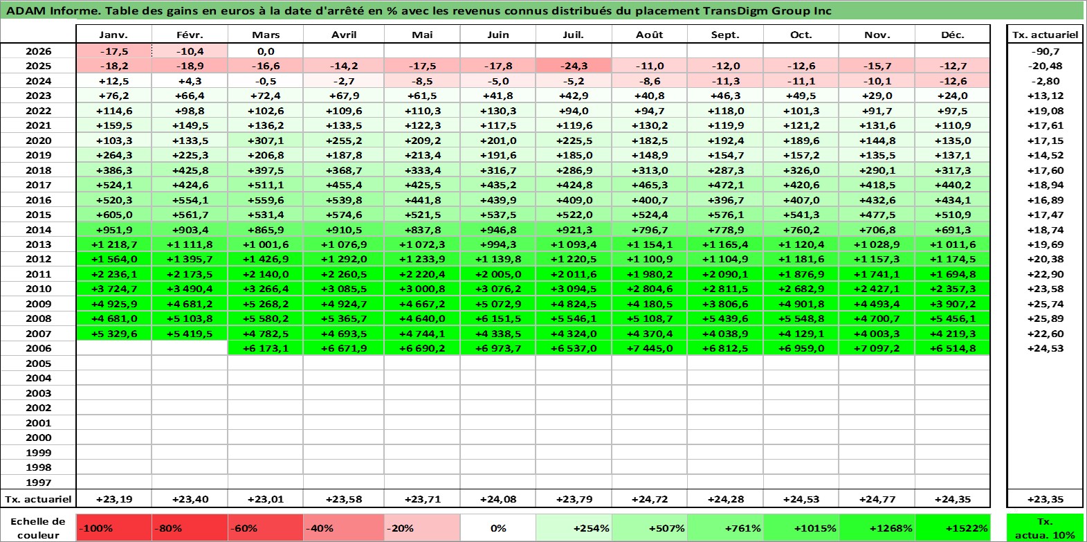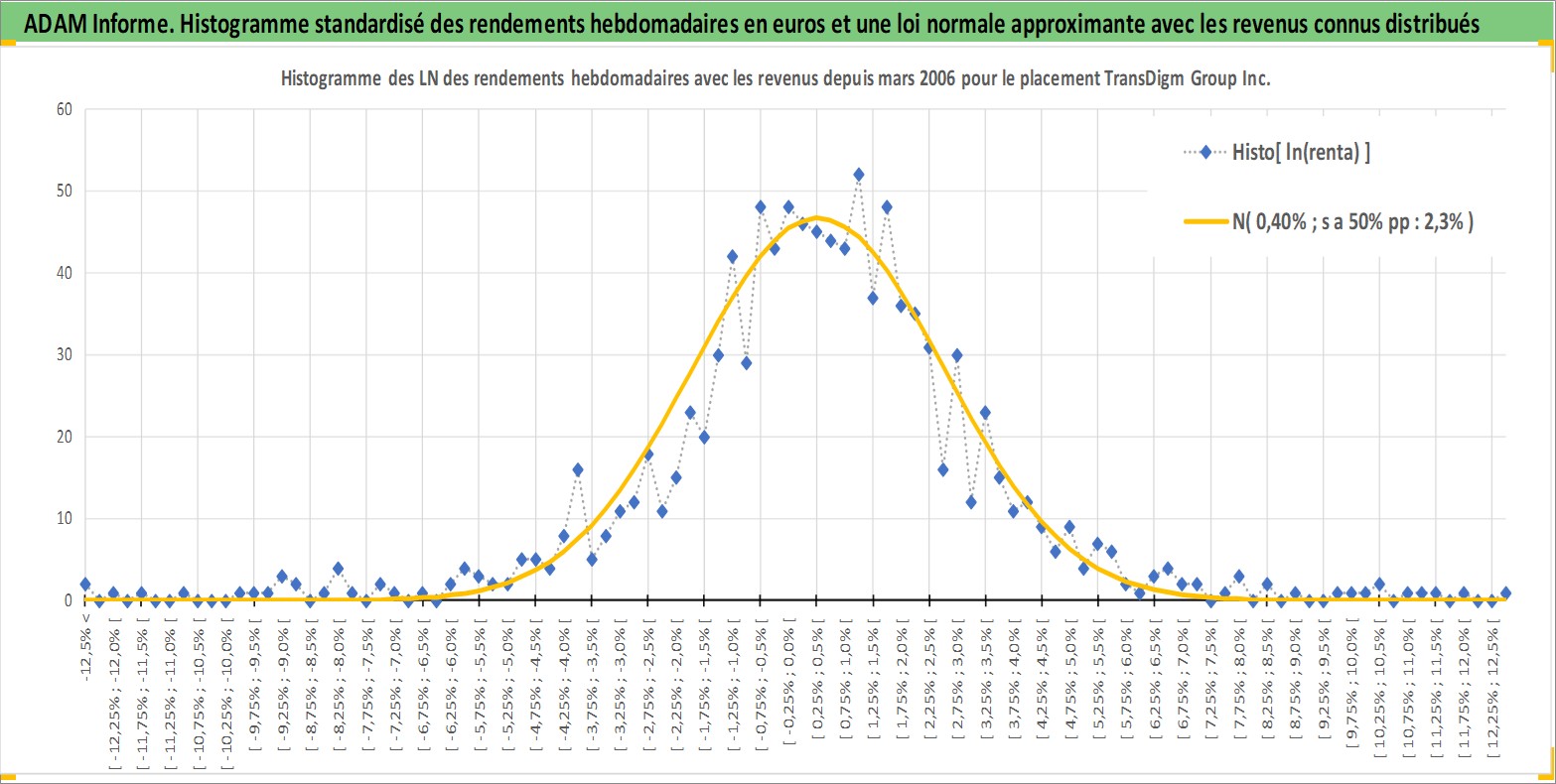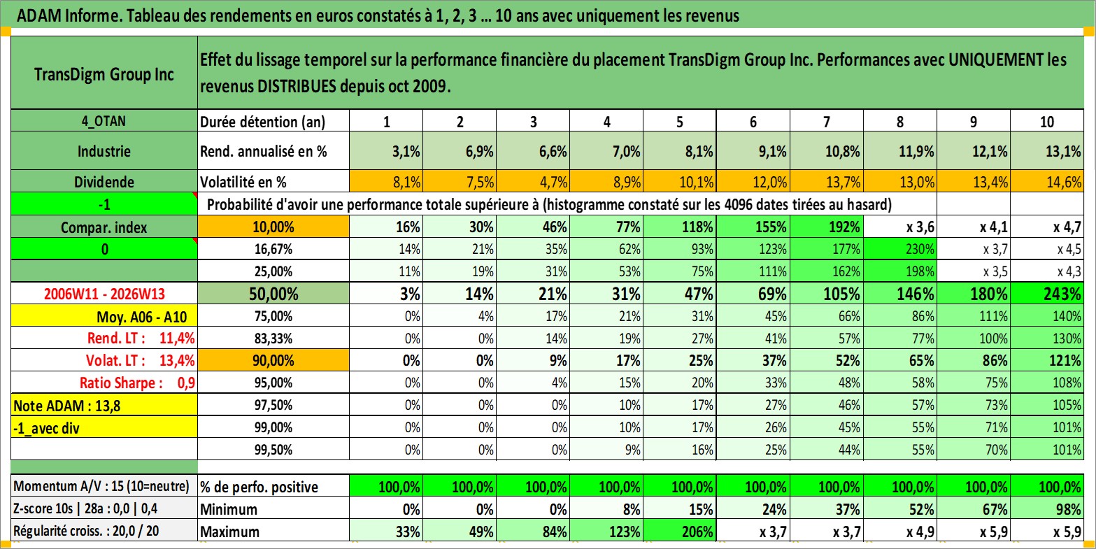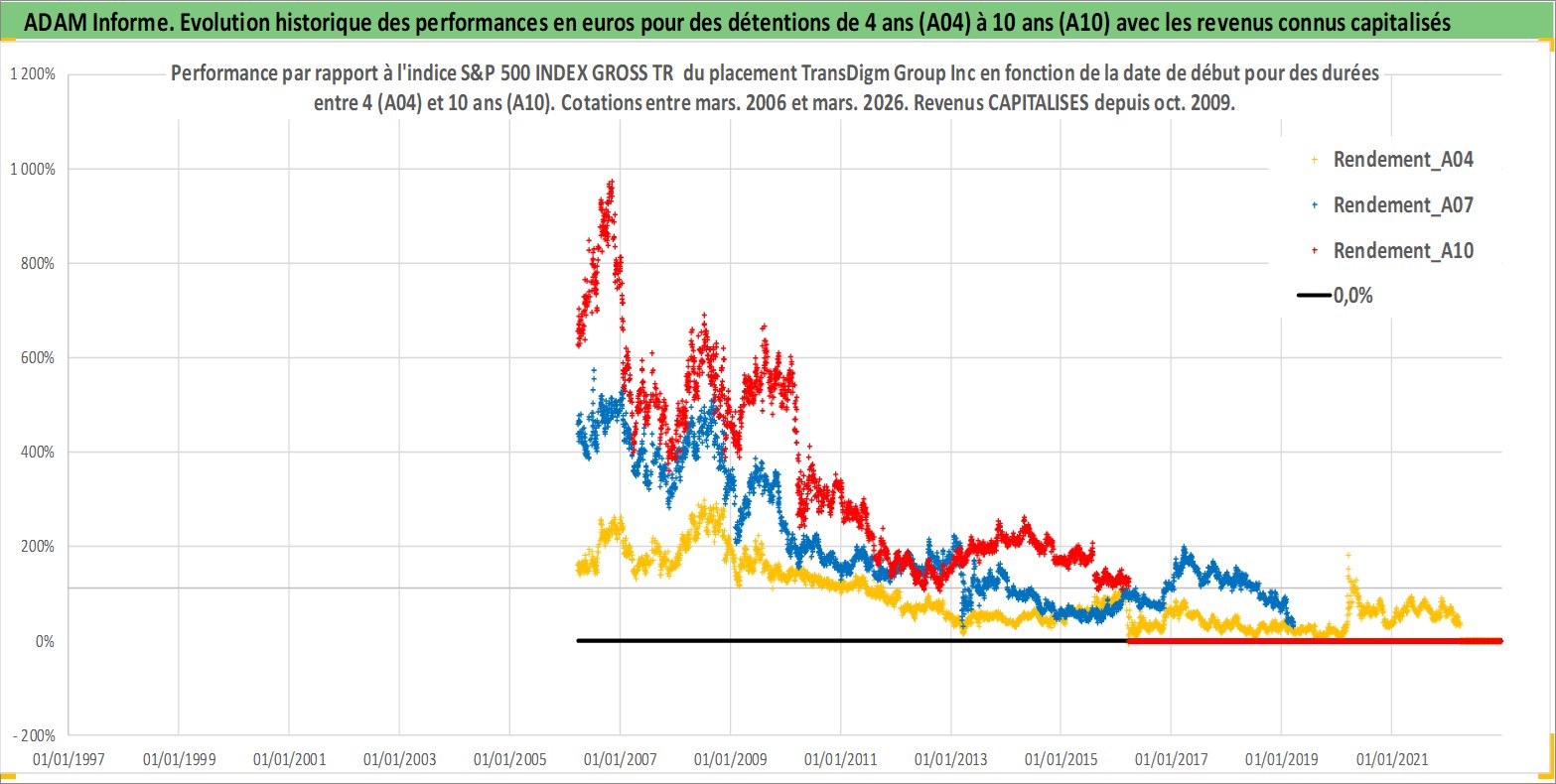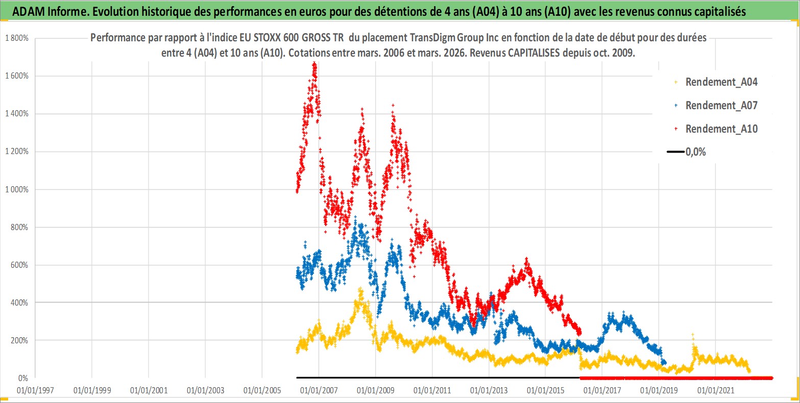 Site dédié aux investisseursPage dédiée sur site financeAnalyse des valorisations hebdomadaires de l'action TransDigm Group Inc. Cet actif est cote en USD. Les valorisations sont en contrevaleur EURO et couvrent les semaines 2006W11 a 2026W13. Les revenus de cet actif financier sont pris en compte depuis la semaine 2009W42. La note globale ESG de cet actif est estimee a 2.0 (apres rebasage entre 0 et 20).
