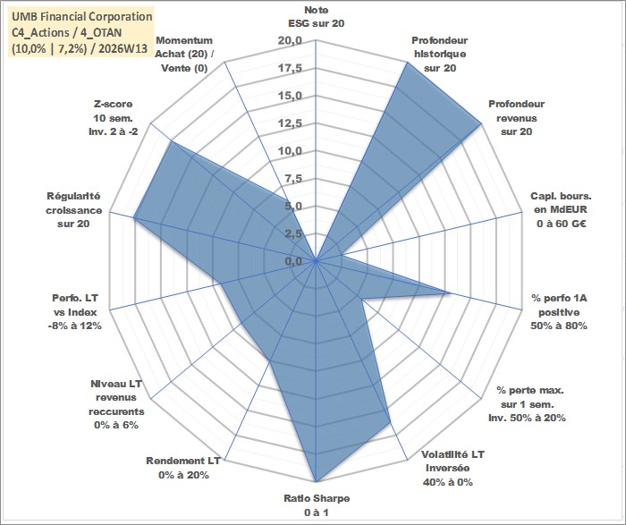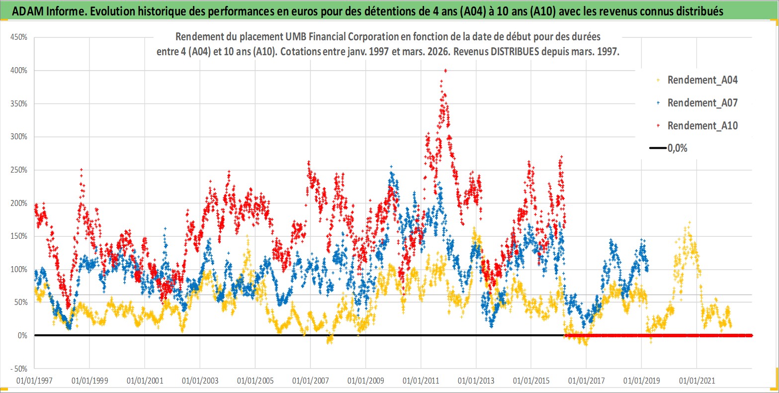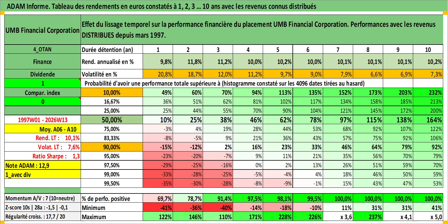 Site dédié aux investisseursPage dédiée sur site financeAnalyse des valorisations hebdomadaires de l'action UMB Financial Corporation. Cet actif est cote en USD. Les valorisations sont en contrevaleur EURO et couvrent les semaines 1997W01 a 2026W13. Les revenus de cet actif financier sont pris en compte depuis la semaine 1997W11. La note ESG de cet actif n'est pas connue.