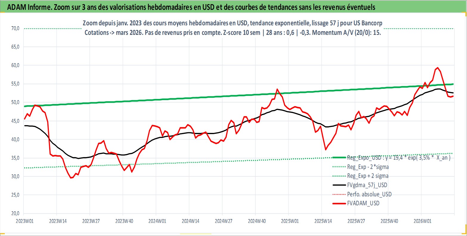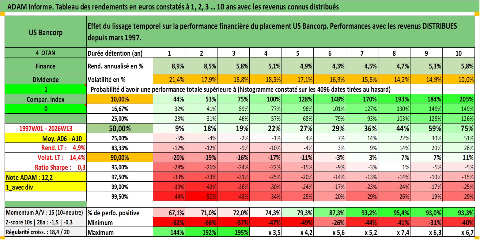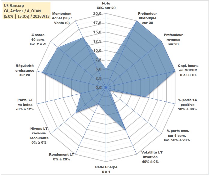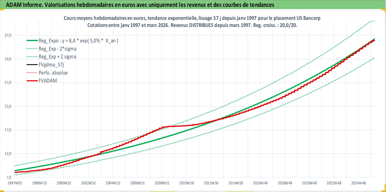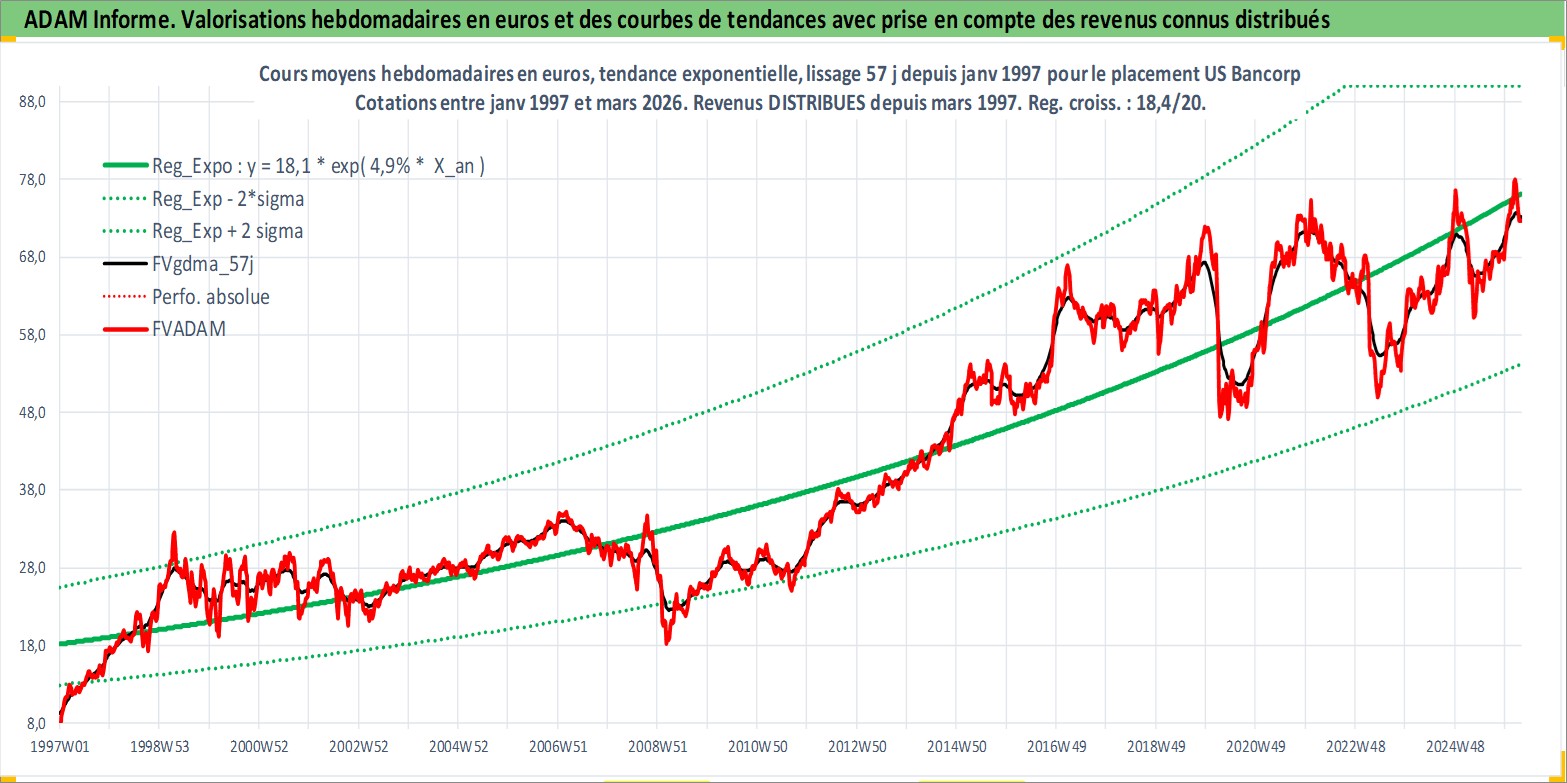 Site dédié aux investisseursPage dédiée sur site financeAnalyse des valorisations hebdomadaires de l'action US Bancorp. Cet actif est cote en USD. Les valorisations sont en contrevaleur EURO et couvrent les semaines 1997W01 a 2026W13. Les revenus de cet actif financier sont pris en compte depuis la semaine 1997W13. La note globale ESG de cet actif est estimee a 5.0 (apres rebasage entre 0 et 20).
