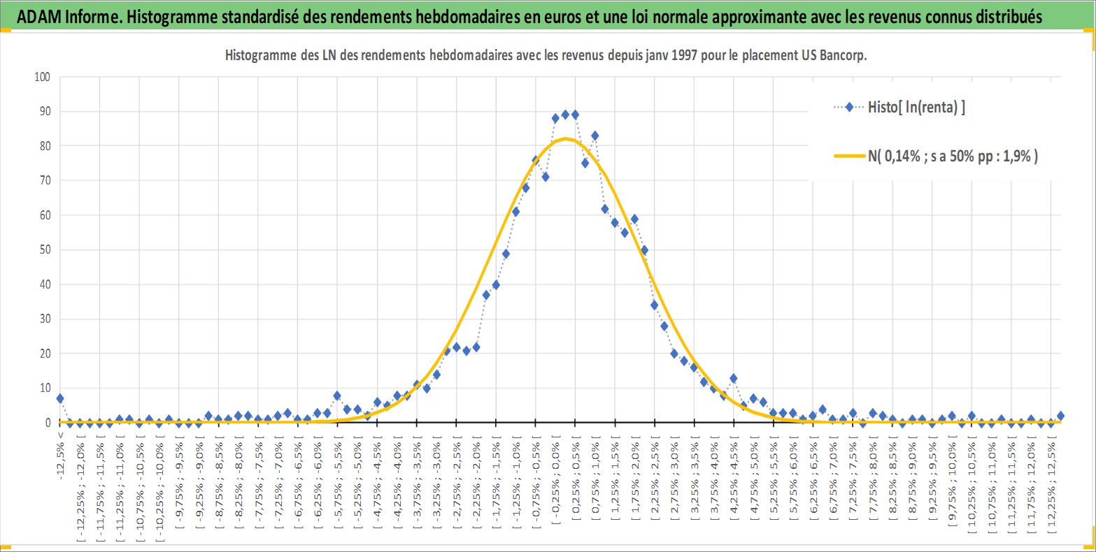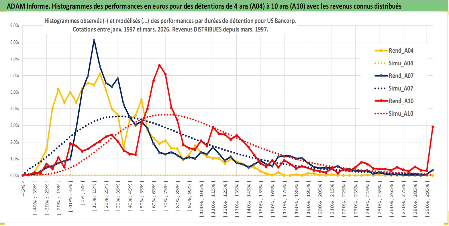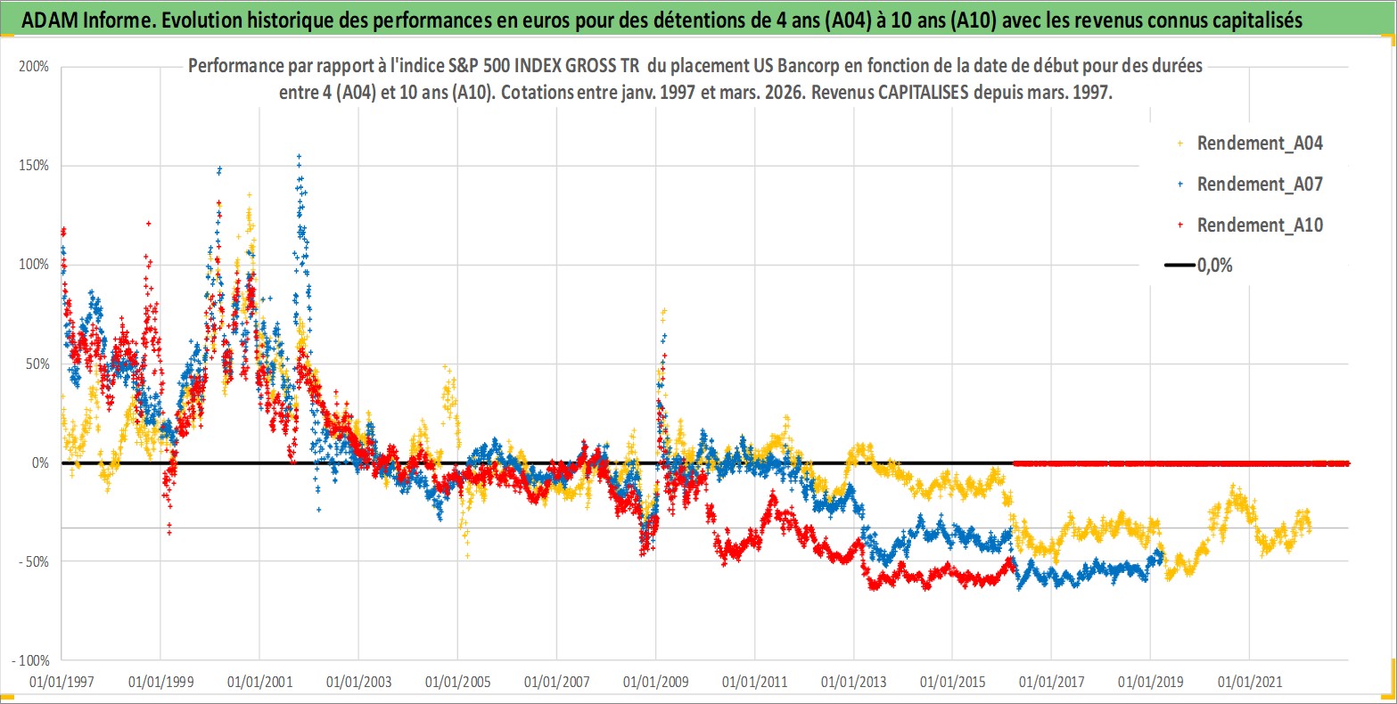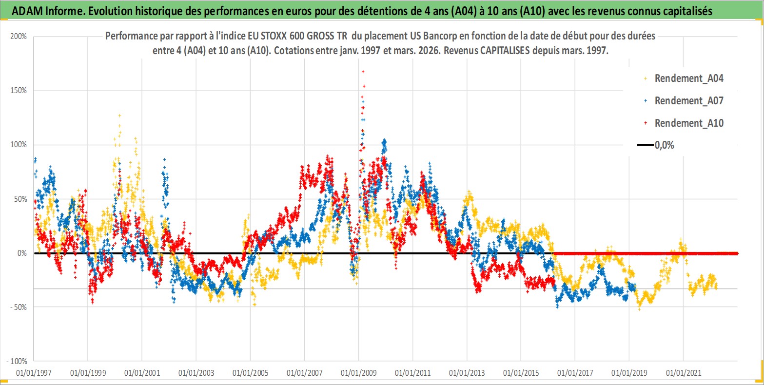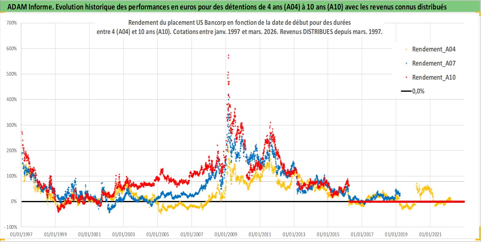 Site dédié aux investisseursPage dédiée sur site financeAnalyse des valorisations hebdomadaires de l'action US Bancorp. Cet actif est cote en USD. Les valorisations sont en contrevaleur EURO et couvrent les semaines 1997W01 a 2026W13. Les revenus de cet actif financier sont pris en compte depuis la semaine 1997W13. La note globale ESG de cet actif est estimee a 5.0 (apres rebasage entre 0 et 20).