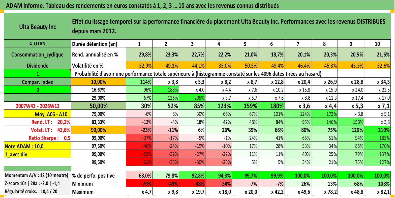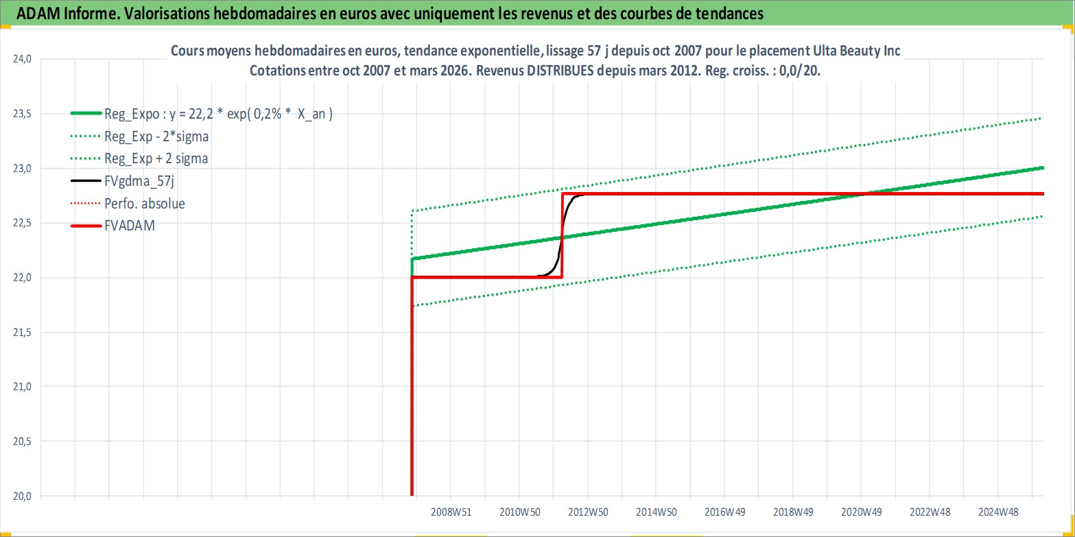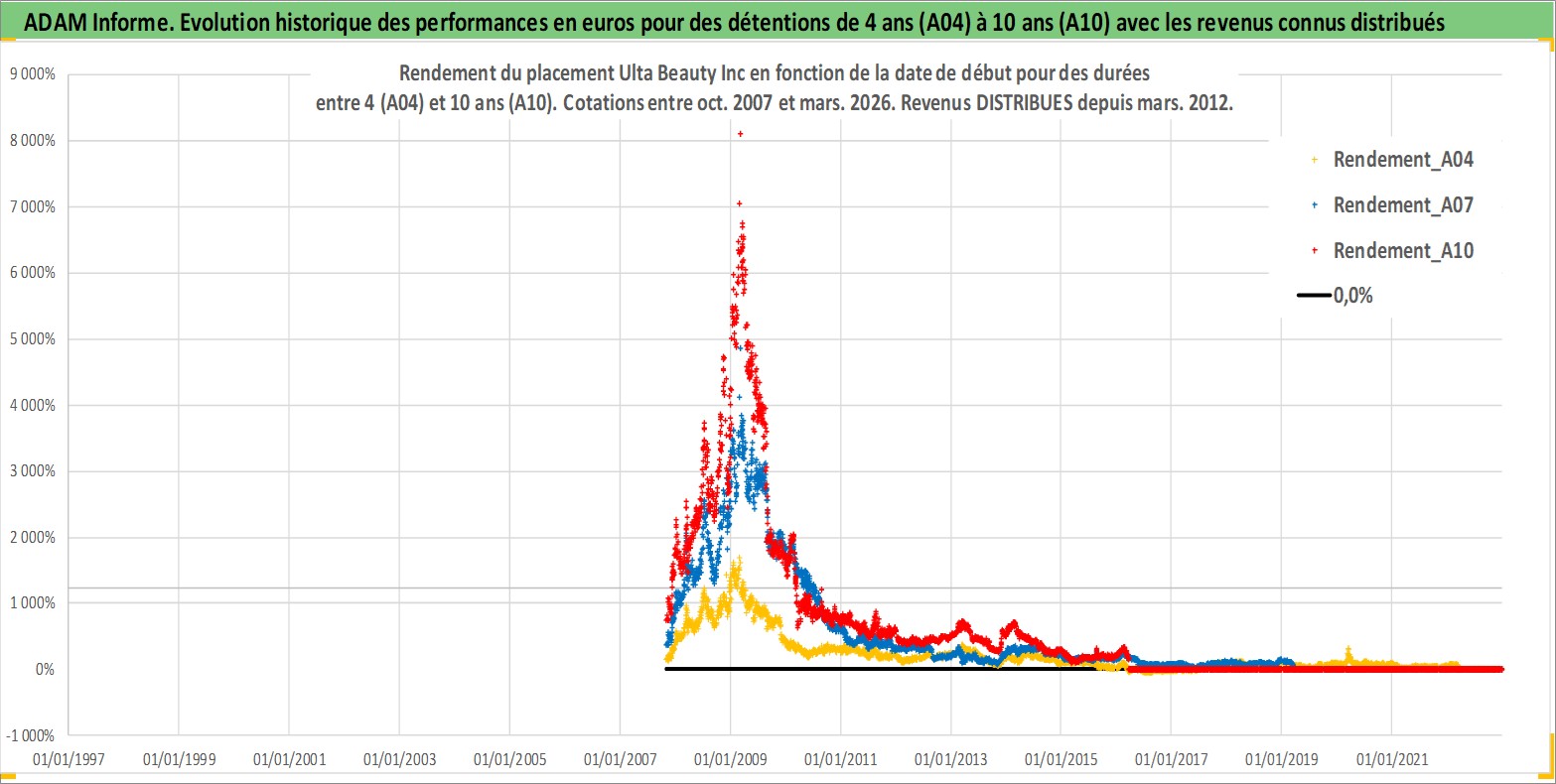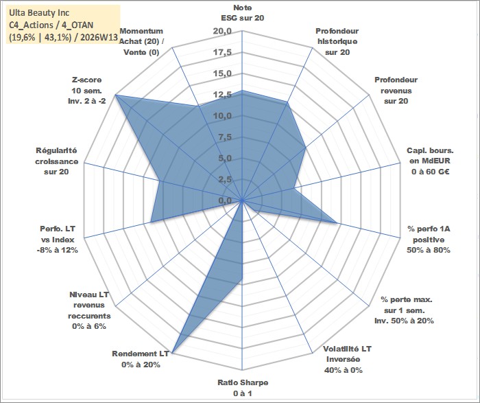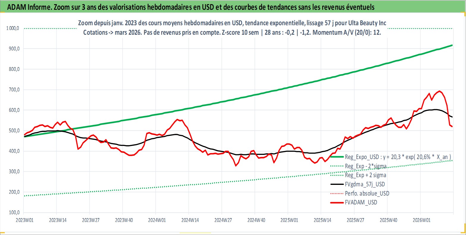 Site dédié aux investisseursPage dédiée sur site financeAnalyse des valorisations hebdomadaires de l'action Ulta Beauty Inc. Cet actif est cote en USD. Les valorisations sont en contrevaleur EURO et couvrent les semaines 2007W43 a 2026W13. Les revenus de cet actif financier sont pris en compte depuis la semaine 2012W11. La note globale ESG de cet actif est estimee a 13.0 (apres rebasage entre 0 et 20).