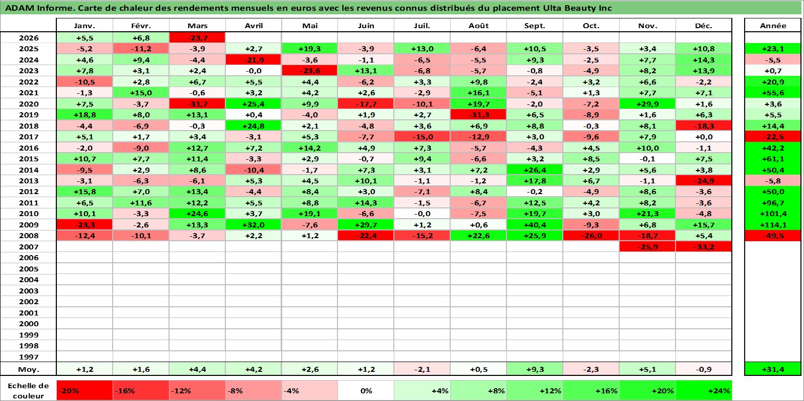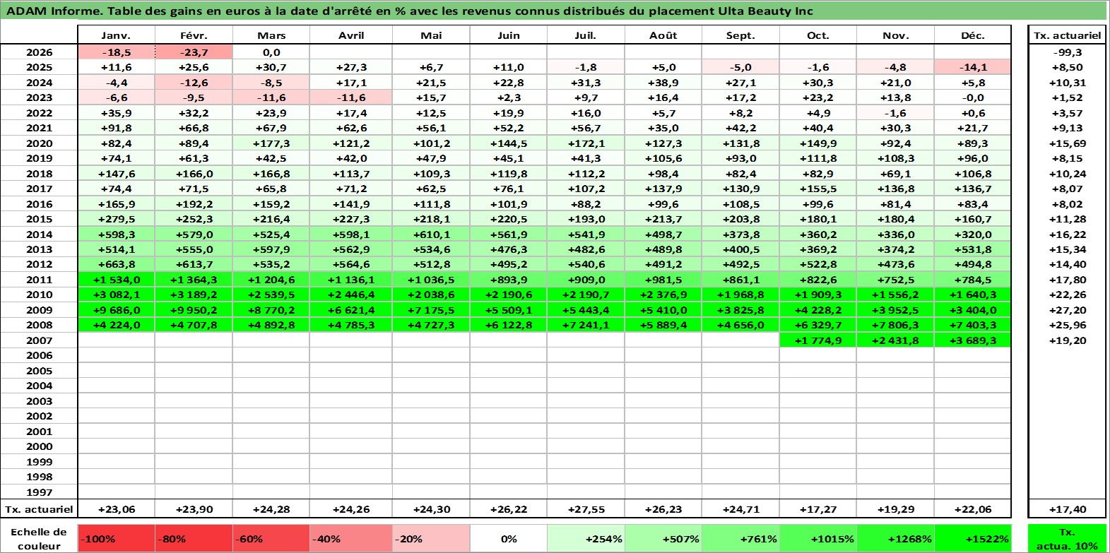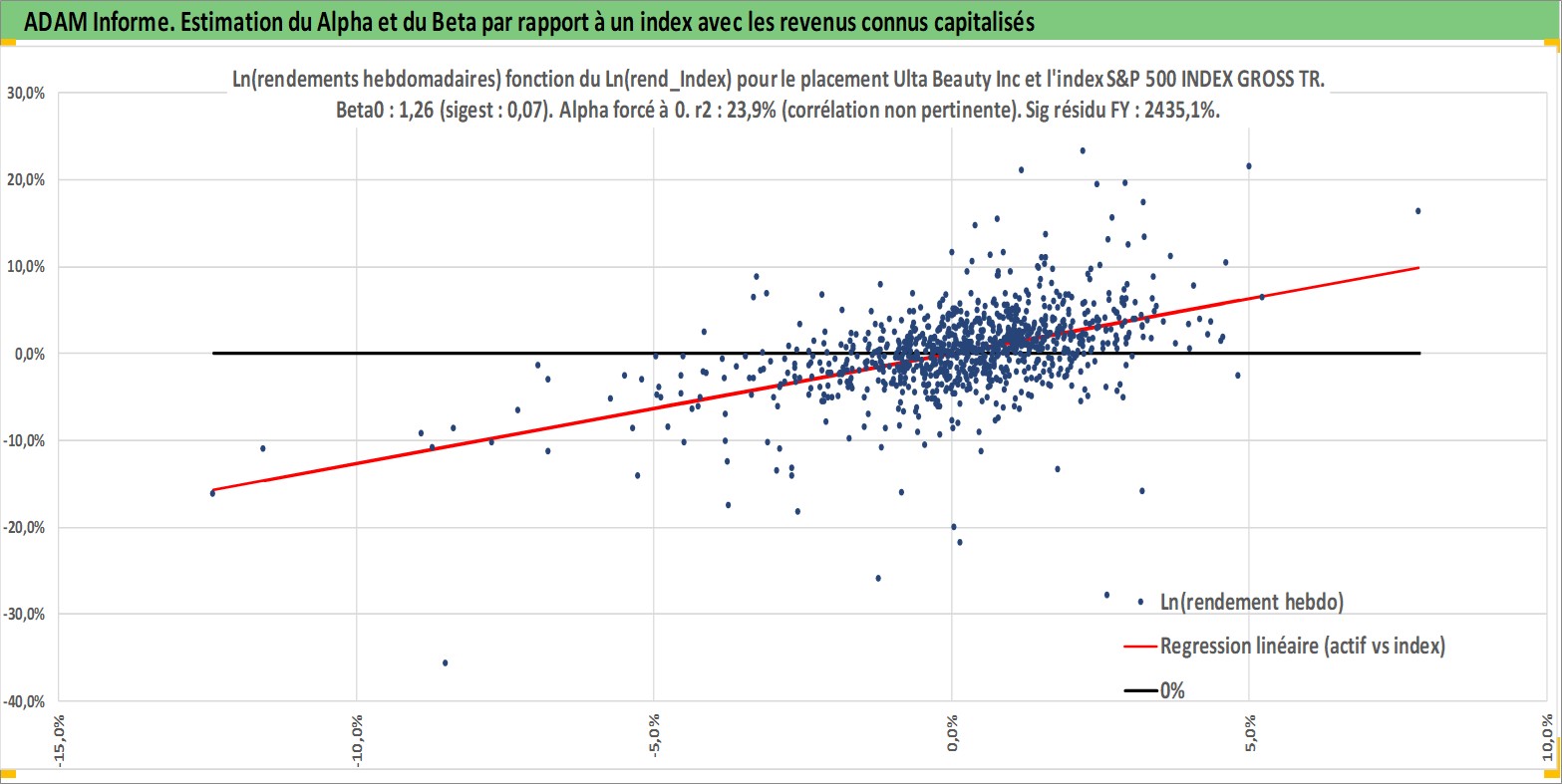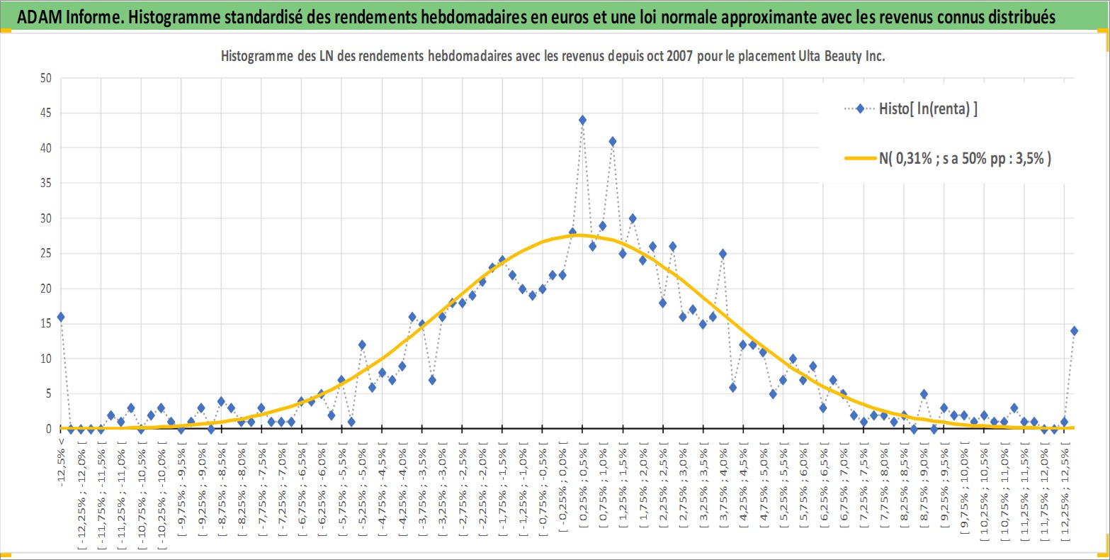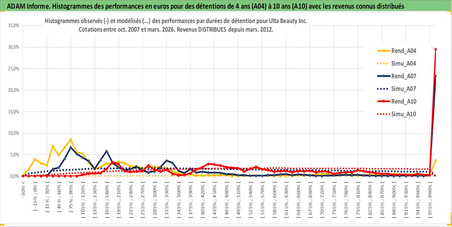 Site dédié aux investisseursPage dédiée sur site financeAnalyse des valorisations hebdomadaires de l'action Ulta Beauty Inc. Cet actif est cote en USD. Les valorisations sont en contrevaleur EURO et couvrent les semaines 2007W43 a 2026W13. Les revenus de cet actif financier sont pris en compte depuis la semaine 2012W11. La note globale ESG de cet actif est estimee a 13.0 (apres rebasage entre 0 et 20).