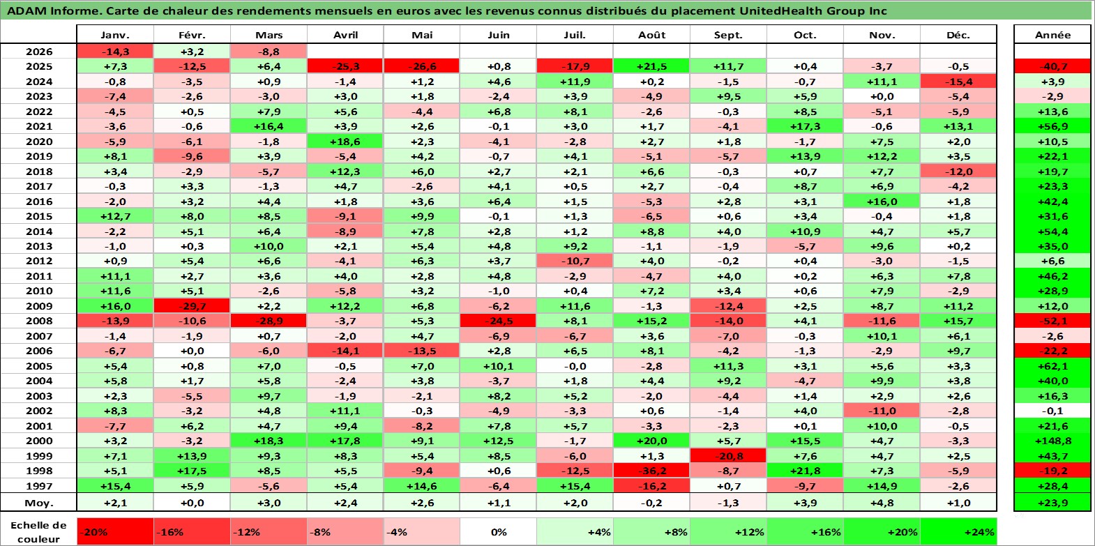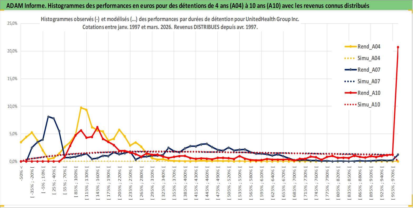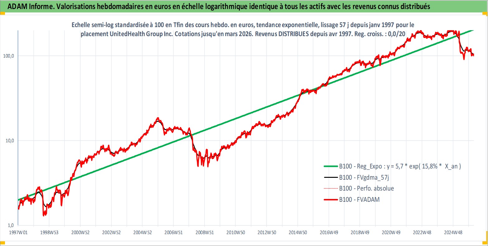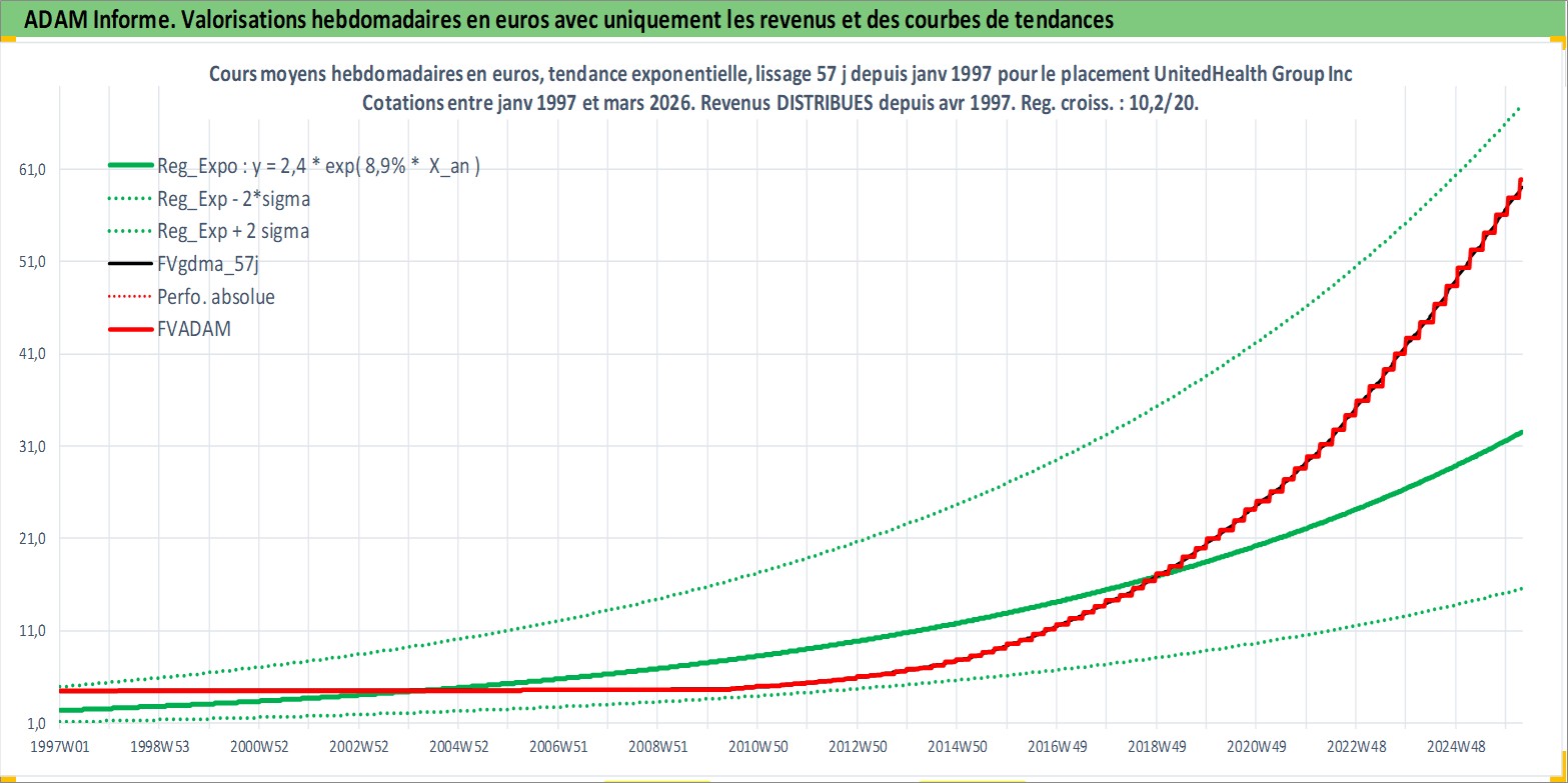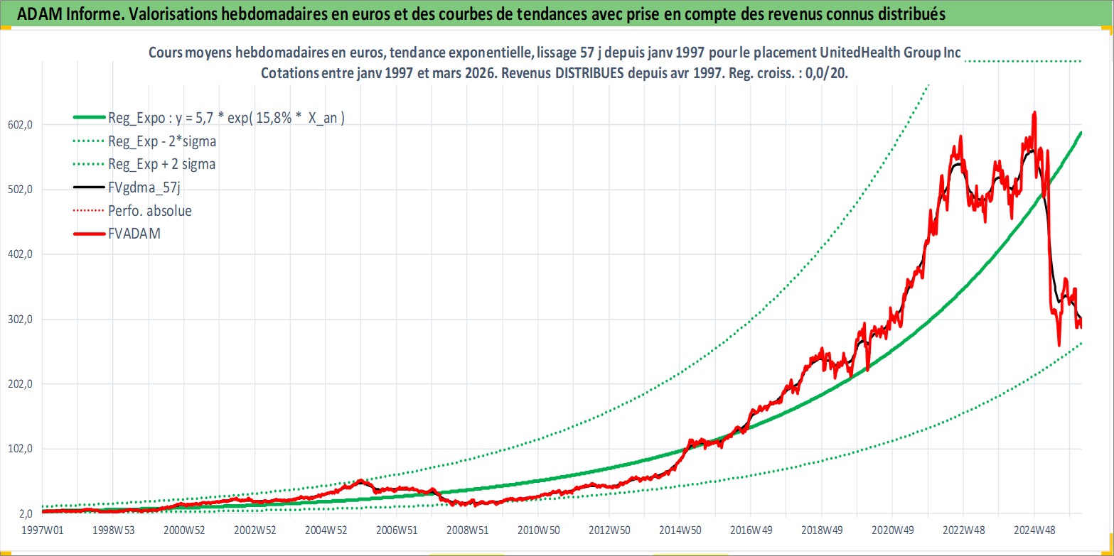 Site dédié aux investisseursPage dédiée sur site financeAnalyse des valorisations hebdomadaires de l'action UnitedHealth Group Inc. Cet actif est cote en USD. Les valorisations sont en contrevaleur EURO et couvrent les semaines 1997W01 a 2026W13. Les revenus de cet actif financier sont pris en compte depuis la semaine 1997W14. La note globale ESG de cet actif est estimee a 11.0 (apres rebasage entre 0 et 20).