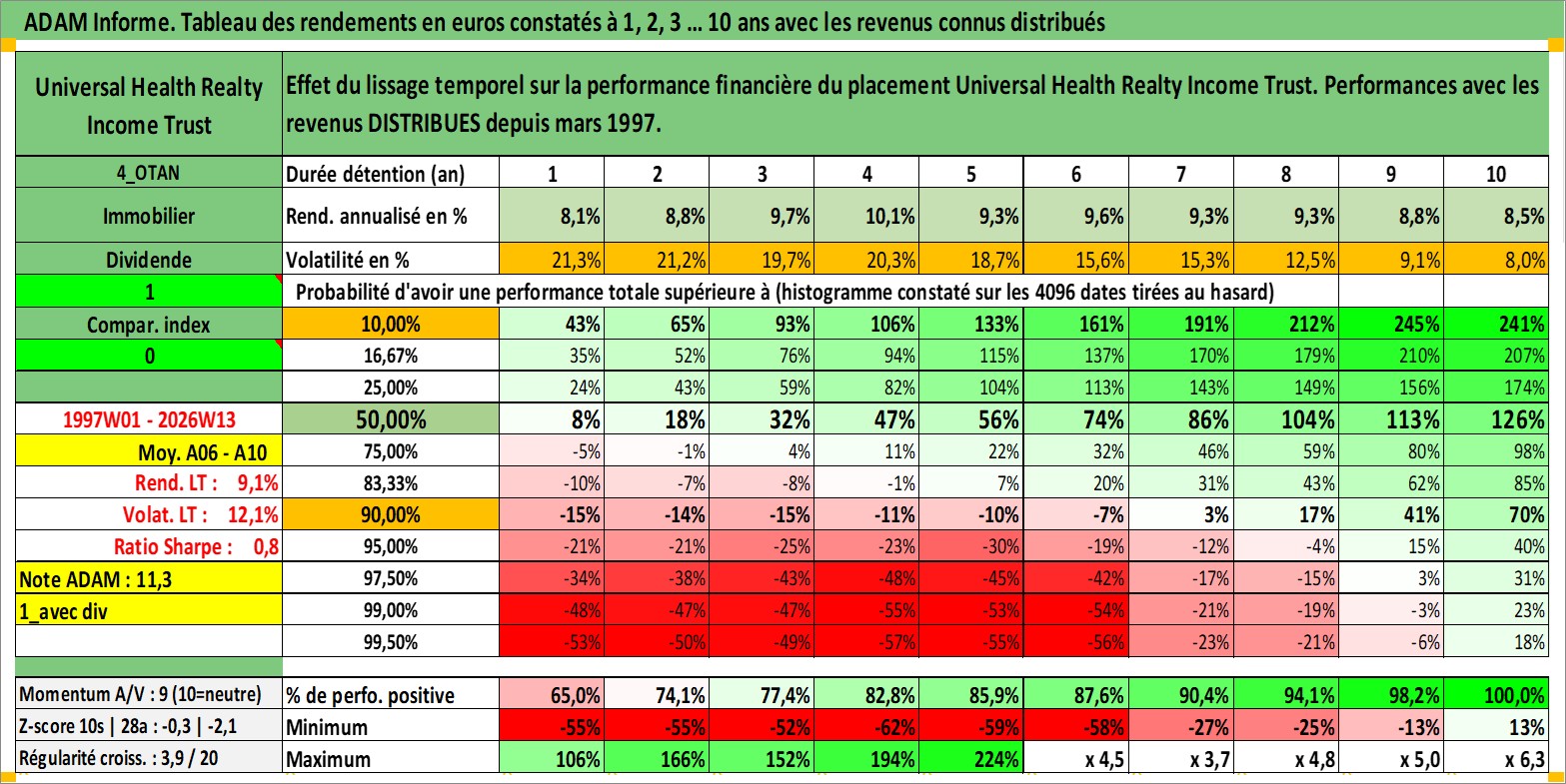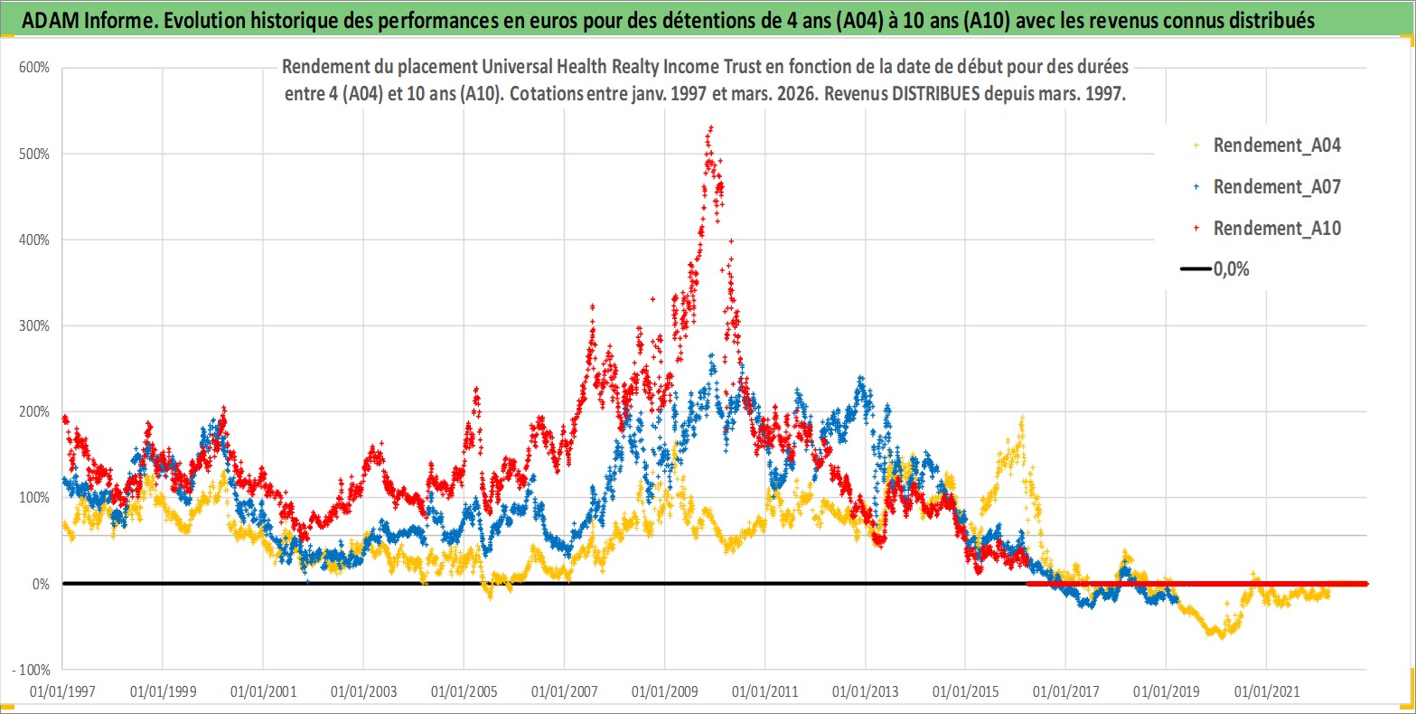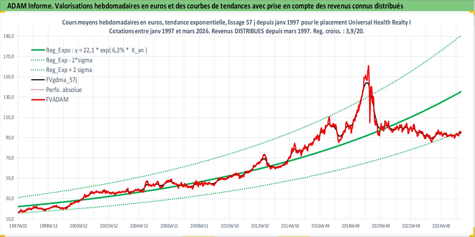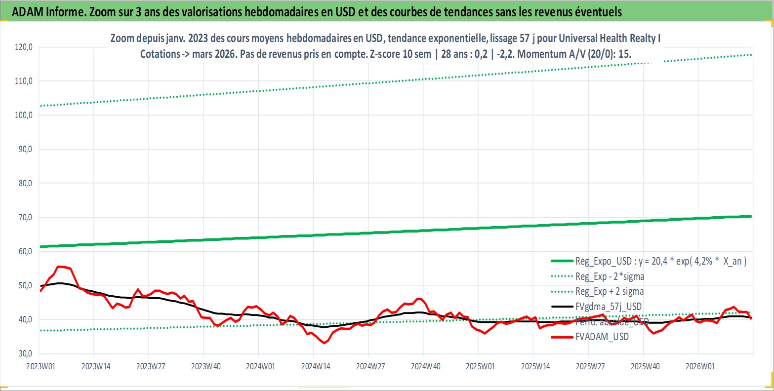 Site dédié aux investisseursPage dédiée sur site financeAnalyse des valorisations hebdomadaires de l'action Universal Health Realty Income Trust. Cet actif est cote en USD. Les valorisations sont en contrevaleur EURO et couvrent les semaines 1997W01 a 2026W13. Les revenus de cet actif financier sont pris en compte depuis la semaine 1997W11. La note ESG de cet actif n'est pas connue.