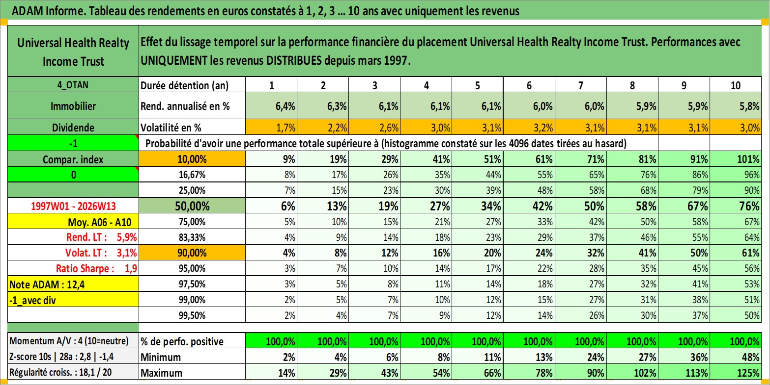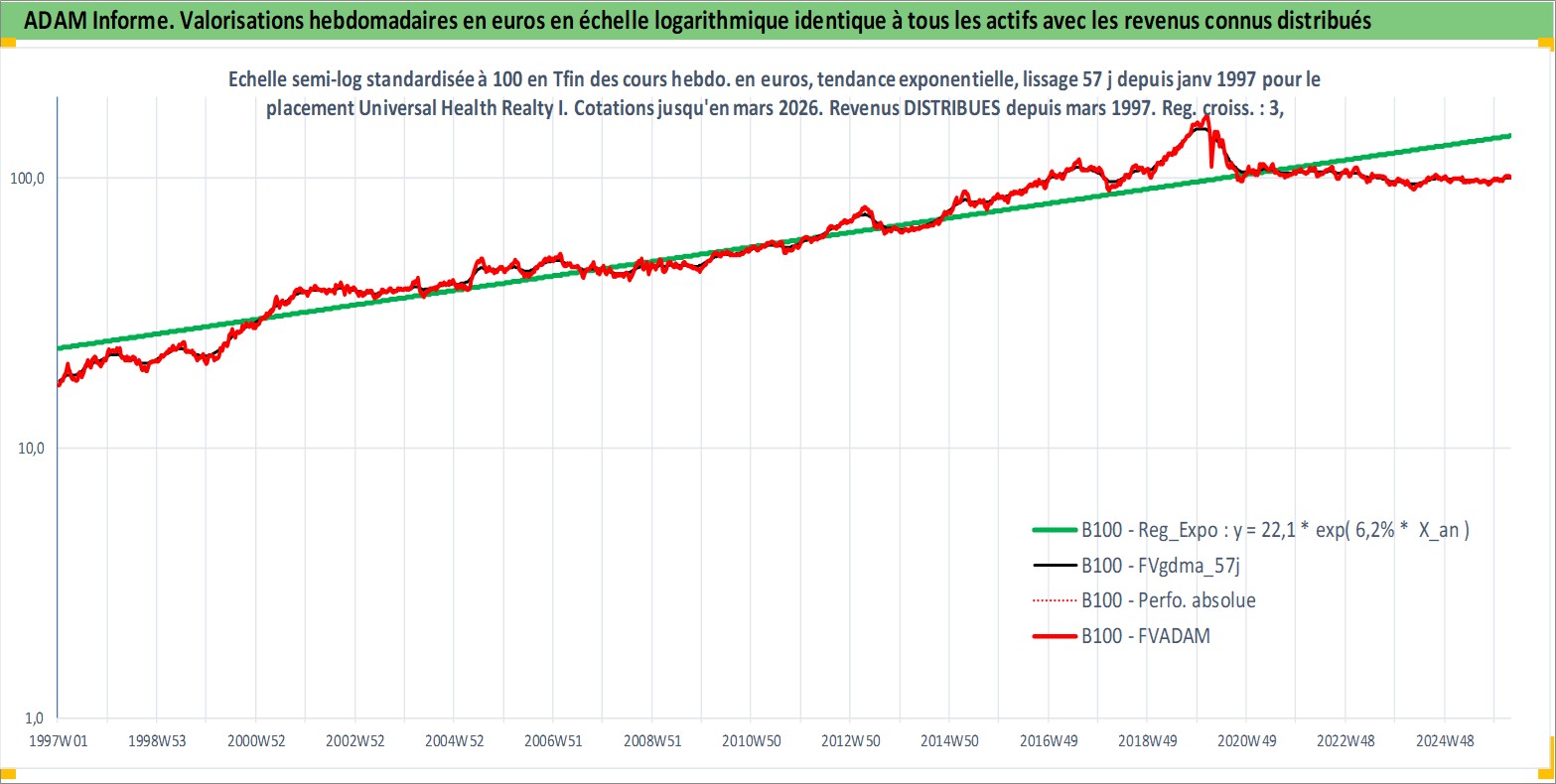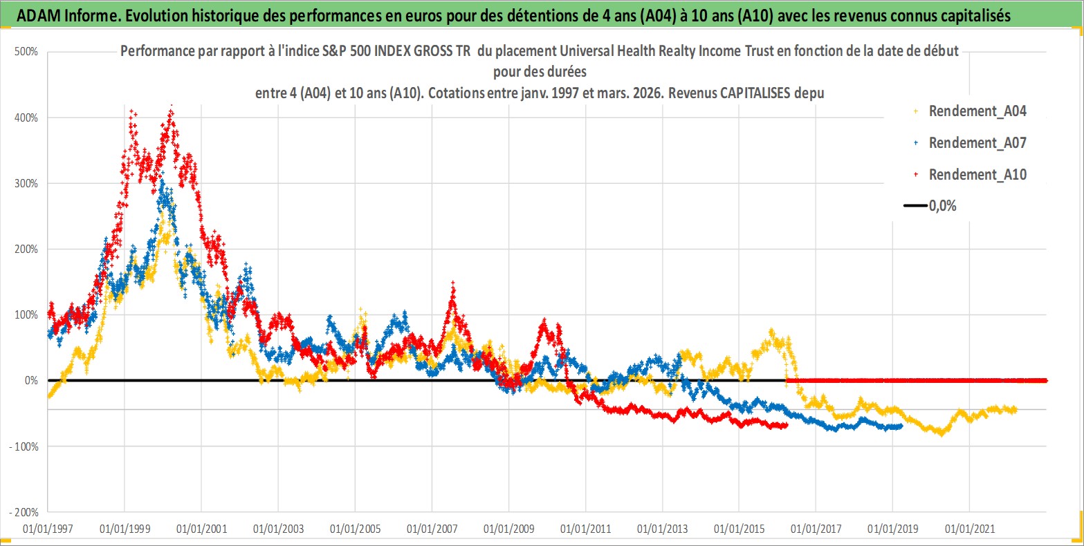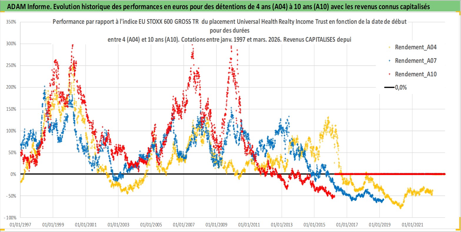 Site dédié aux investisseursPage dédiée sur site financeAnalyse des valorisations hebdomadaires de l'action Universal Health Realty Income Trust. Cet actif est cote en USD. Les valorisations sont en contrevaleur EURO et couvrent les semaines 1997W01 a 2026W13. Les revenus de cet actif financier sont pris en compte depuis la semaine 1997W11. La note ESG de cet actif n'est pas connue.