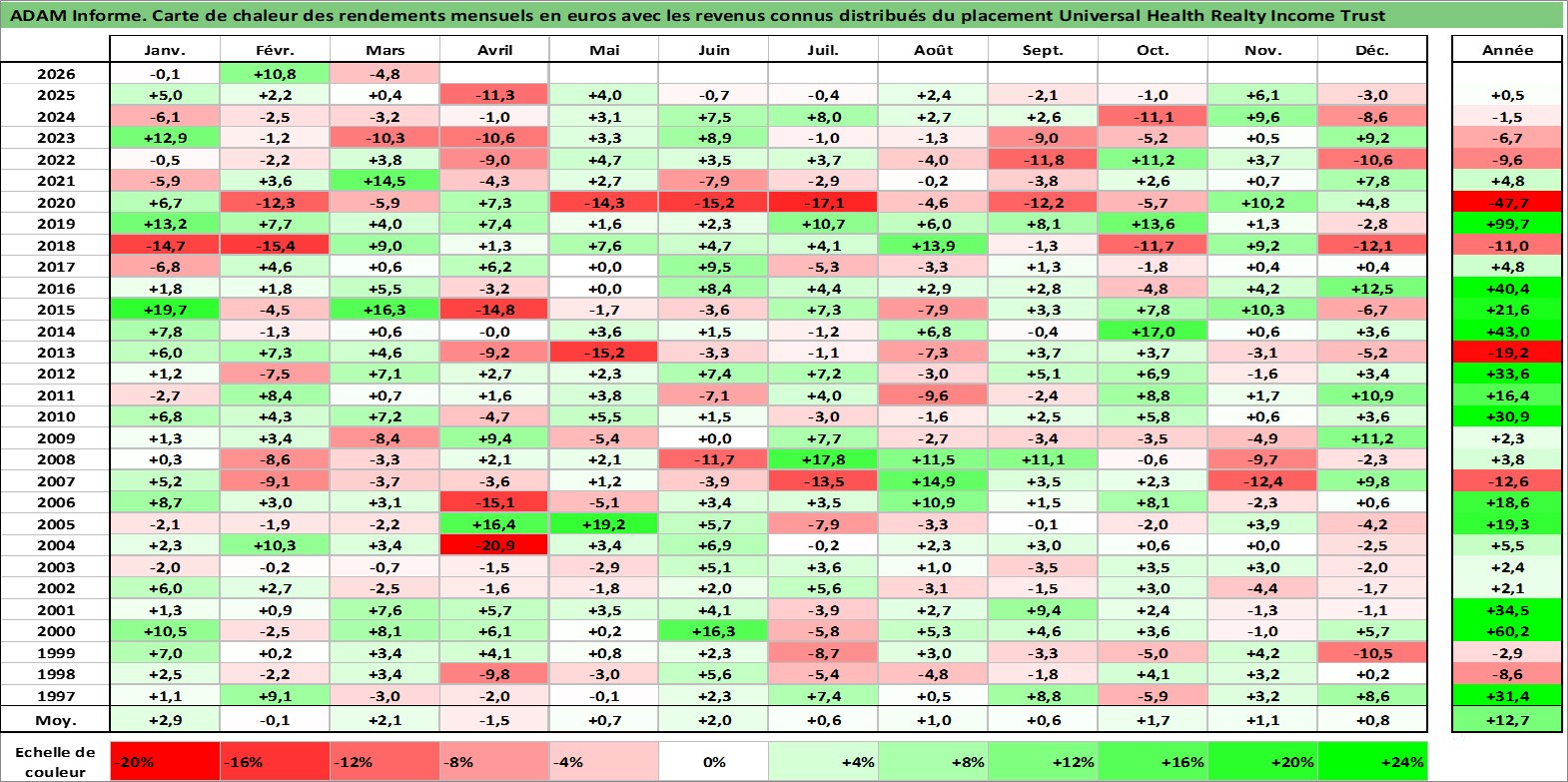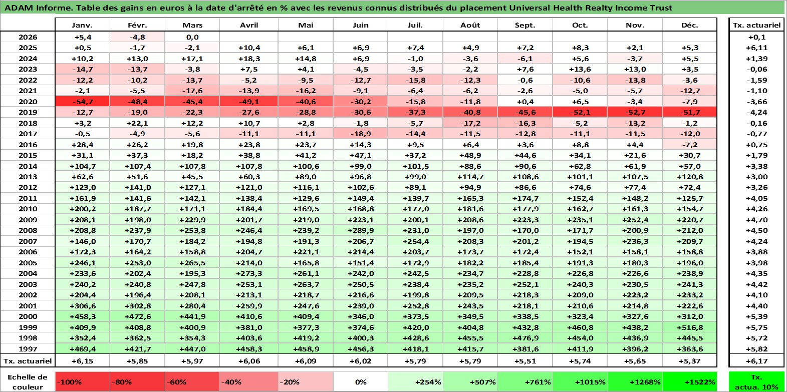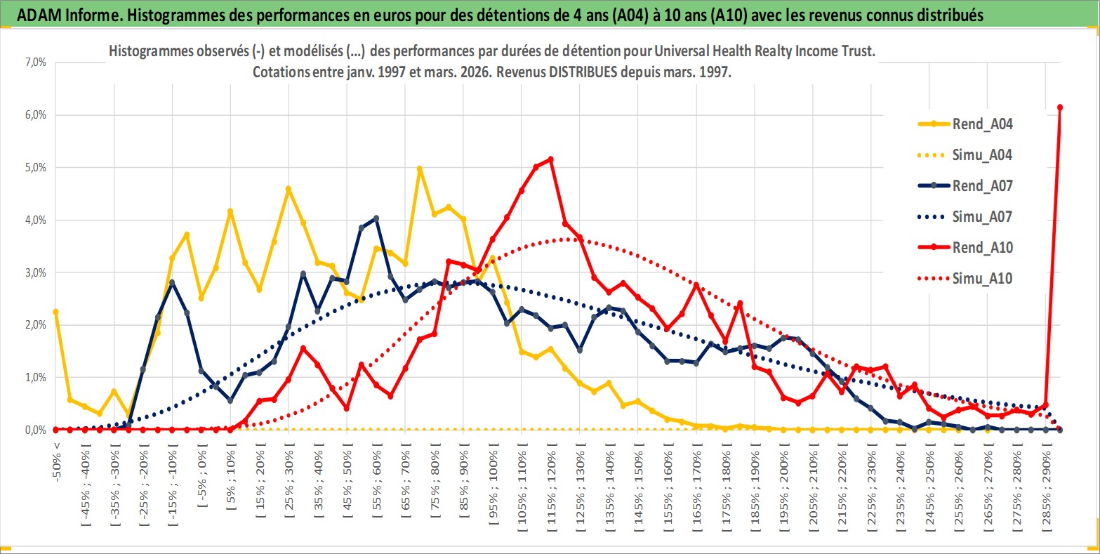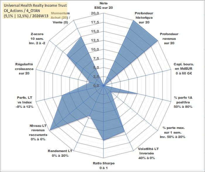Site dédié aux investisseursPage dédiée sur site financeAnalyse des valorisations hebdomadaires de l'action Universal Health Realty Income Trust. Cet actif est cote en USD. Les valorisations sont en contrevaleur EURO et couvrent les semaines 1997W01 a 2026W13. Les revenus de cet actif financier sont pris en compte depuis la semaine 1997W11. La note ESG de cet actif n'est pas connue.