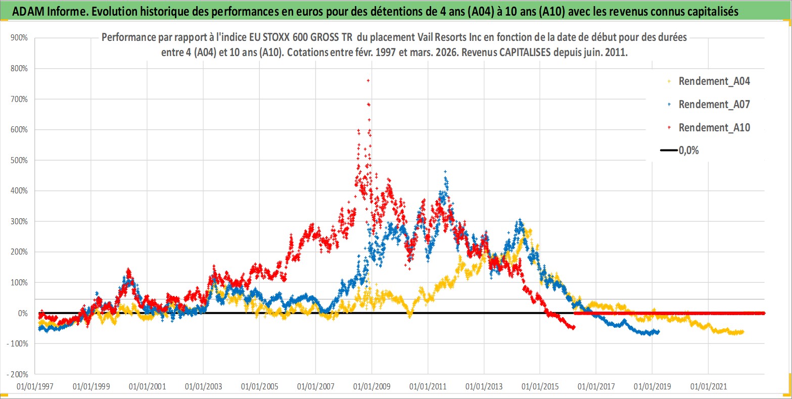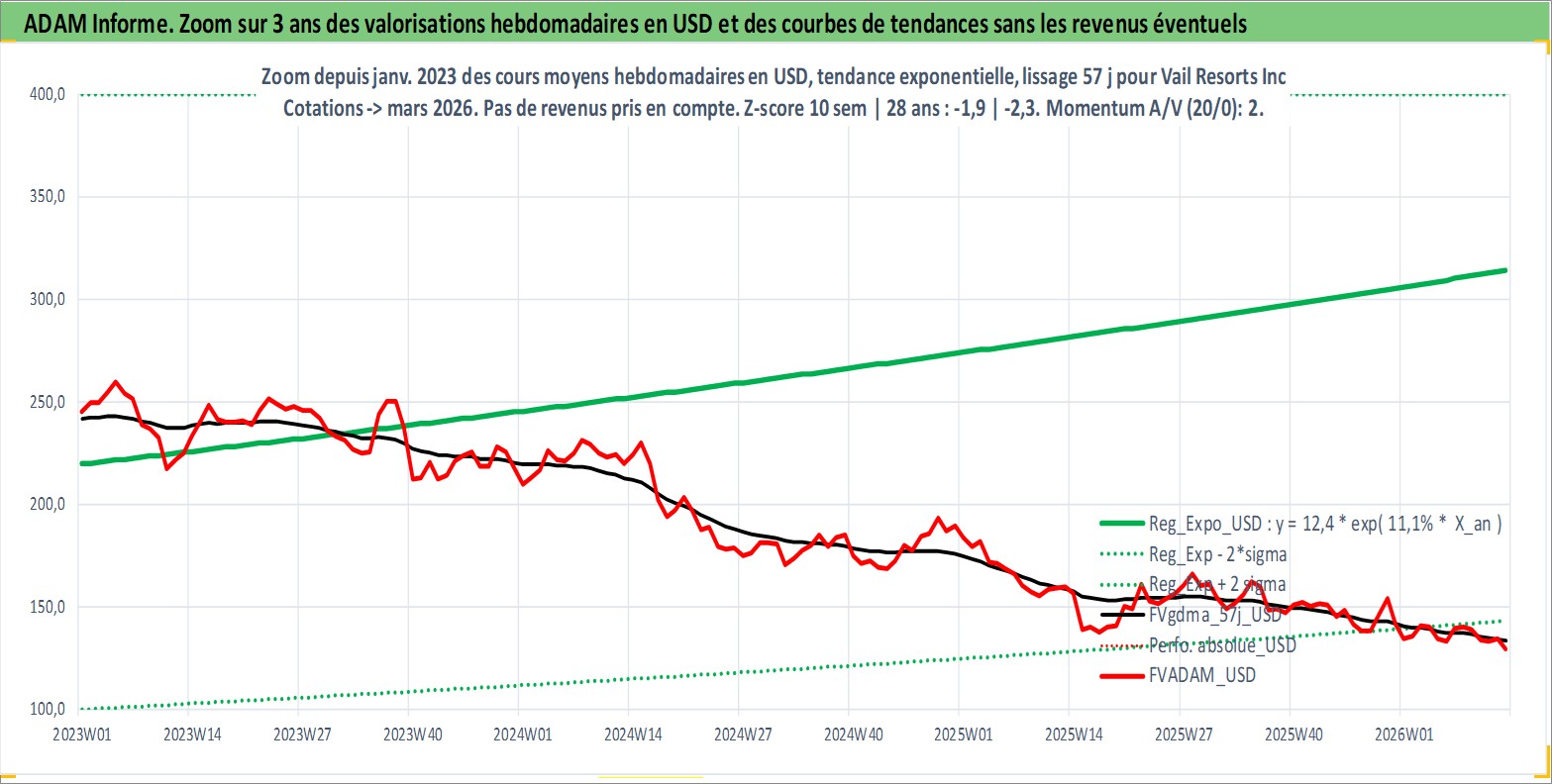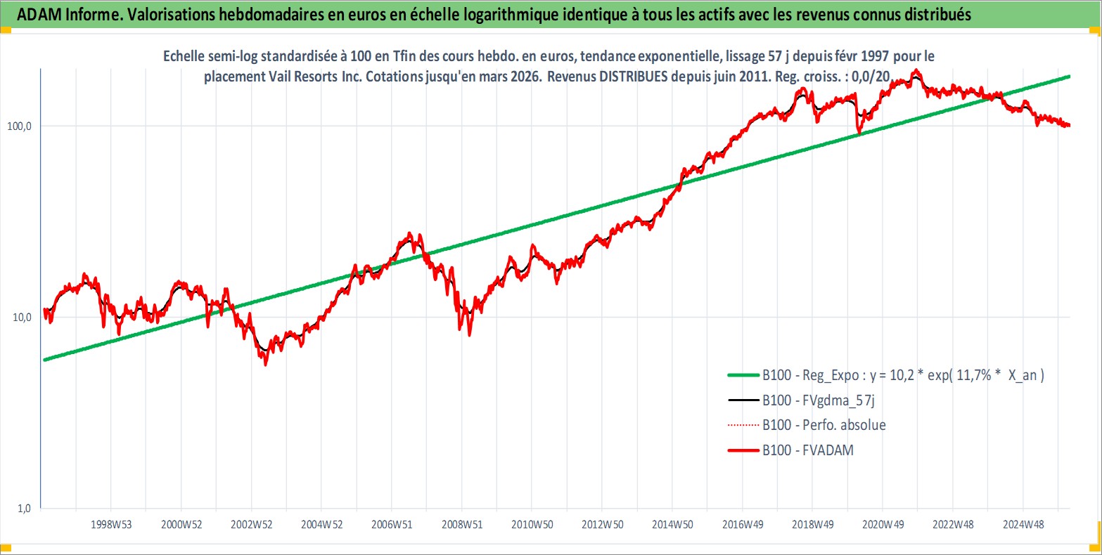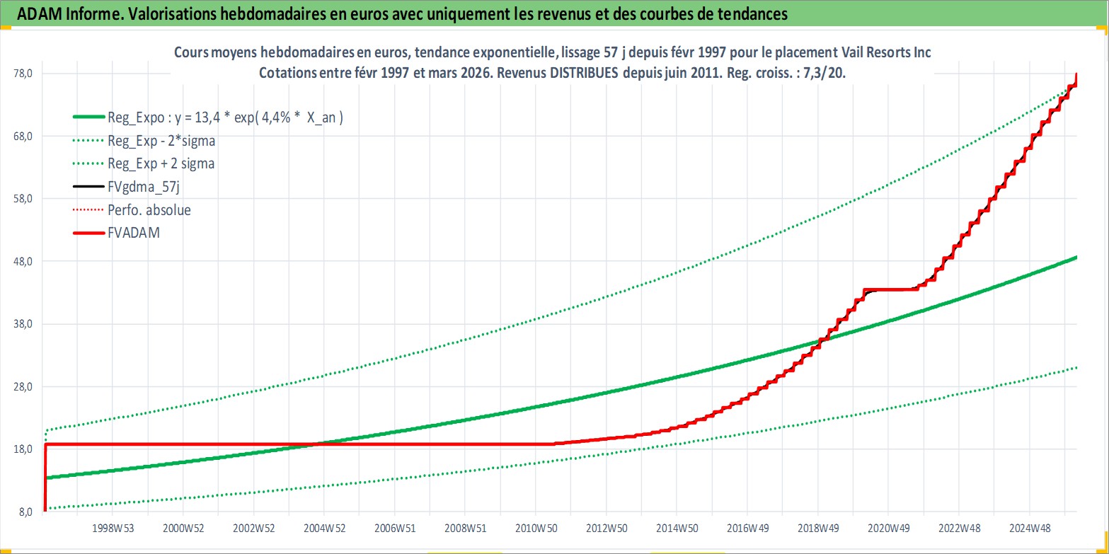 Site dédié aux investisseursPage dédiée sur site financeAnalyse des valorisations hebdomadaires de l'action Vail Resorts Inc. Cet actif est cote en USD. Les valorisations sont en contrevaleur EURO et couvrent les semaines 1997W06 a 2026W13. Les revenus de cet actif financier sont pris en compte depuis la semaine 2011W26. La note ESG de cet actif n'est pas connue.