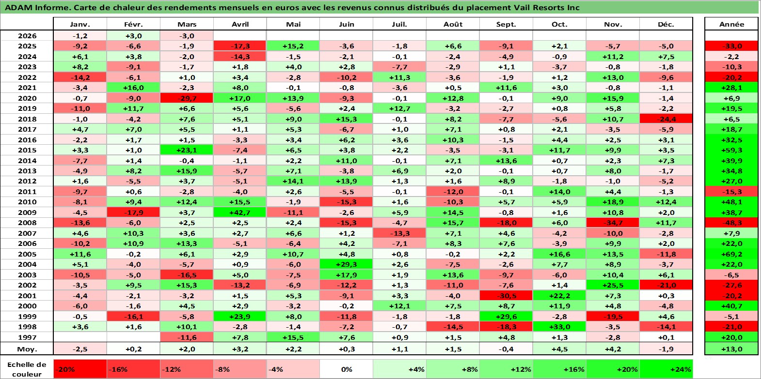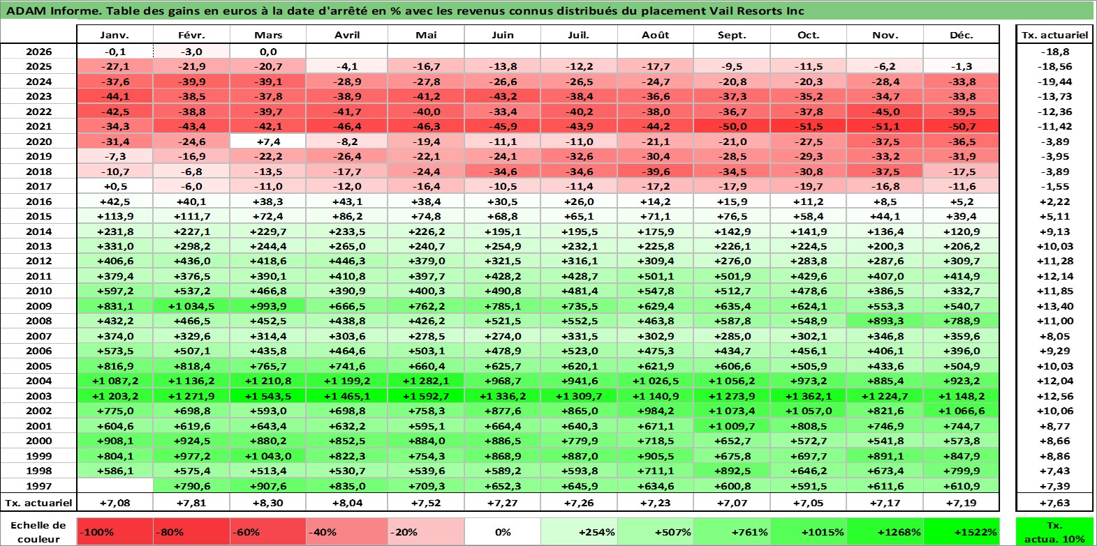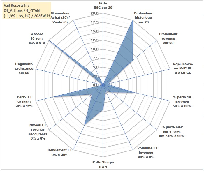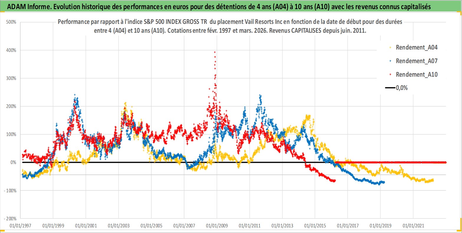 Site dédié aux investisseursPage dédiée sur site financeAnalyse des valorisations hebdomadaires de l'action Vail Resorts Inc. Cet actif est cote en USD. Les valorisations sont en contrevaleur EURO et couvrent les semaines 1997W06 a 2026W13. Les revenus de cet actif financier sont pris en compte depuis la semaine 2011W26. La note ESG de cet actif n'est pas connue.