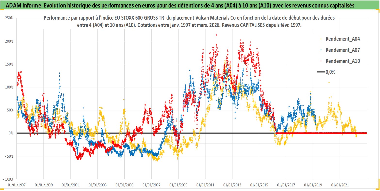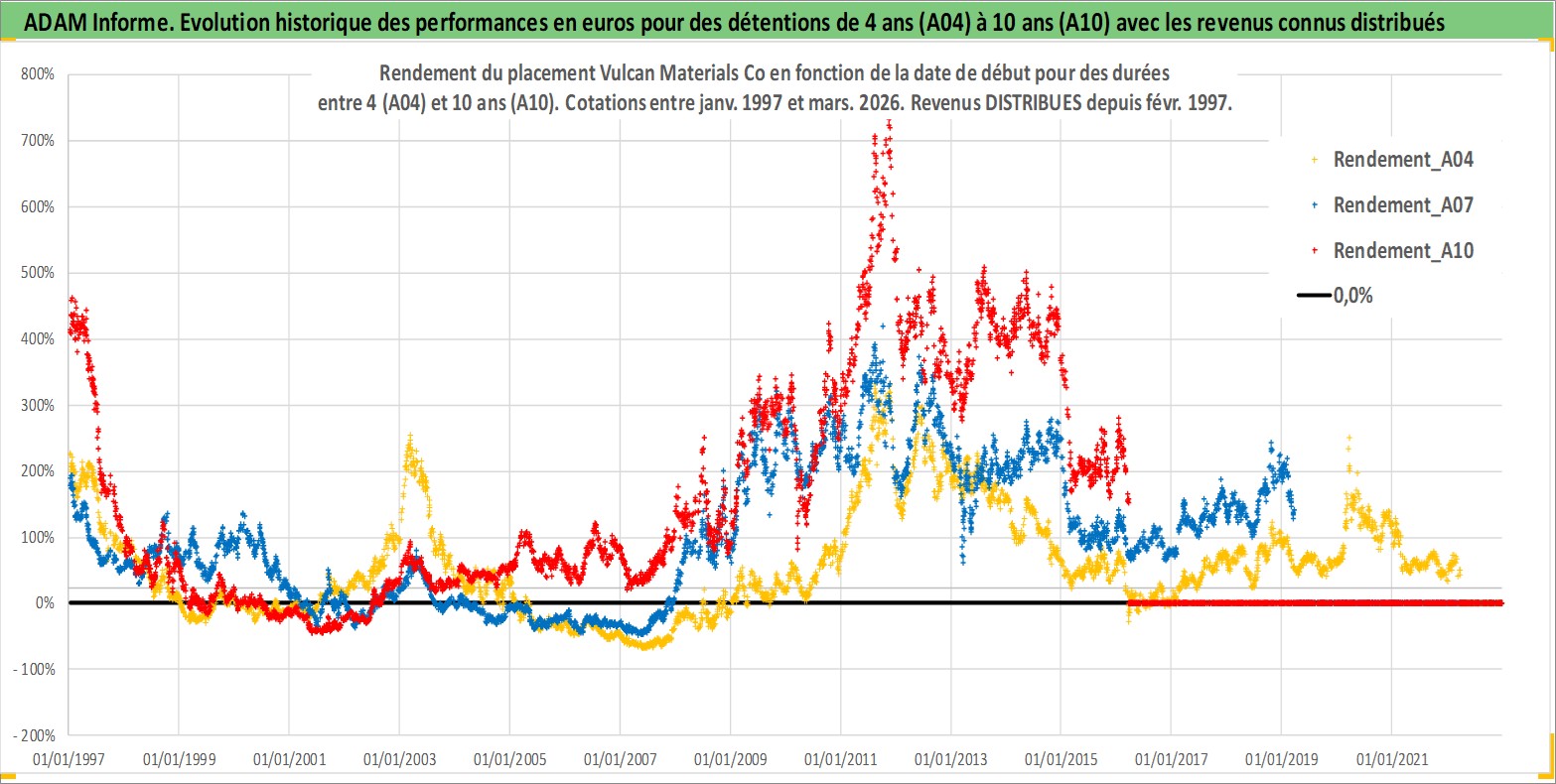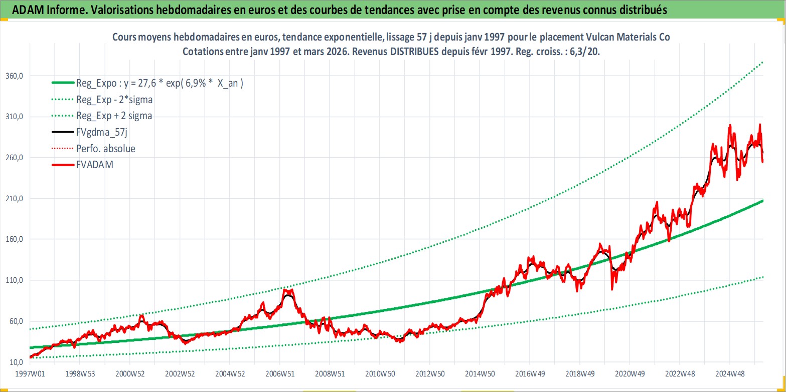Site dédié aux investisseursPage dédiée sur site financeAnalyse des valorisations hebdomadaires de l'action Vulcan Materials Co. Cet actif est cote en USD. Les valorisations sont en contrevaleur EURO et couvrent les semaines 1997W01 a 2026W13. Les revenus de cet actif financier sont pris en compte depuis la semaine 1997W08. La note globale ESG de cet actif est estimee a 6.0 (apres rebasage entre 0 et 20).
