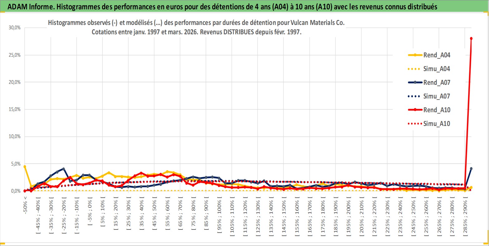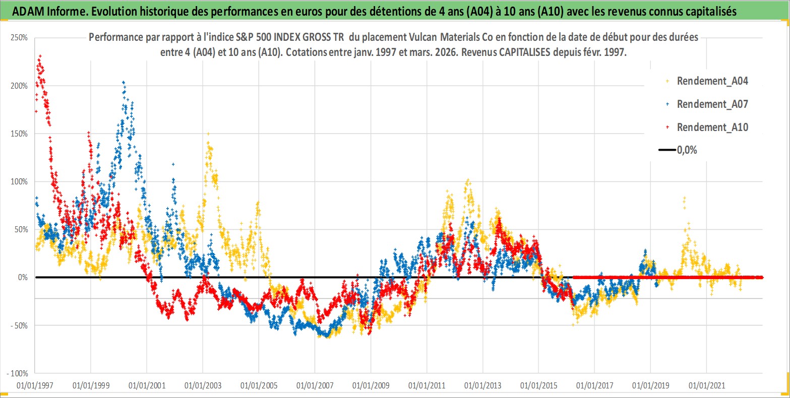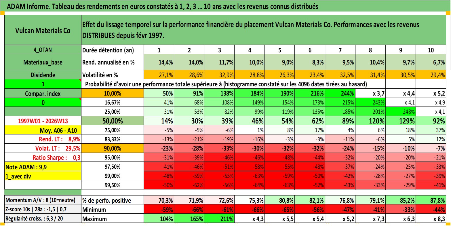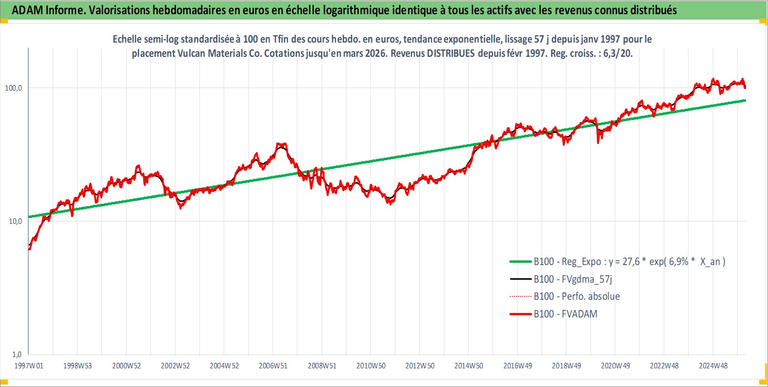 Site dédié aux investisseursPage dédiée sur site financeAnalyse des valorisations hebdomadaires de l'action Vulcan Materials Co. Cet actif est cote en USD. Les valorisations sont en contrevaleur EURO et couvrent les semaines 1997W01 a 2026W13. Les revenus de cet actif financier sont pris en compte depuis la semaine 1997W08. La note globale ESG de cet actif est estimee a 6.0 (apres rebasage entre 0 et 20).