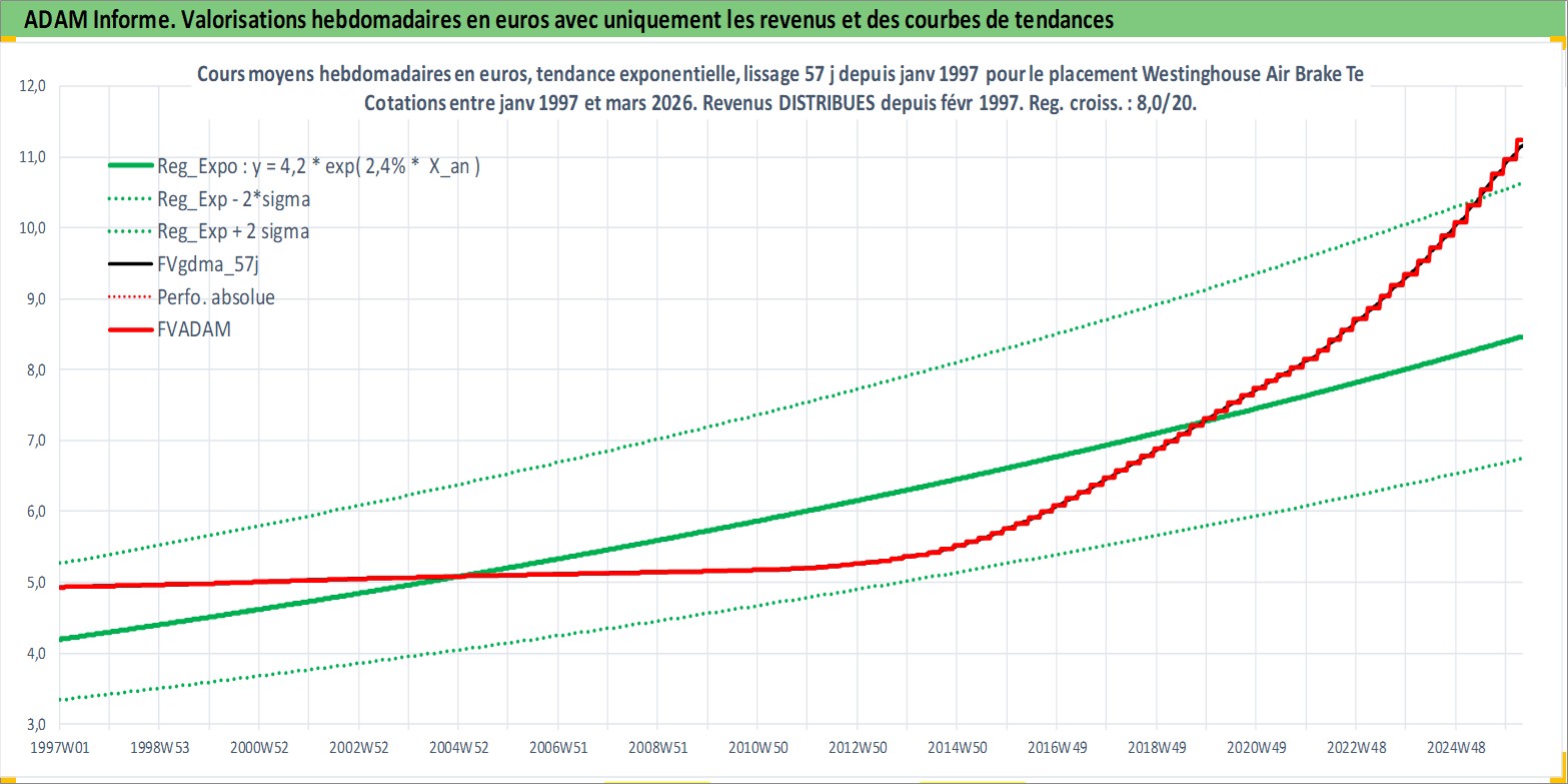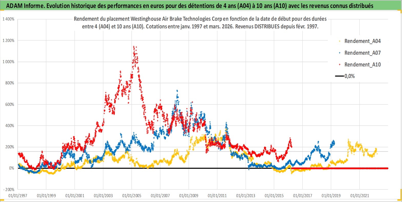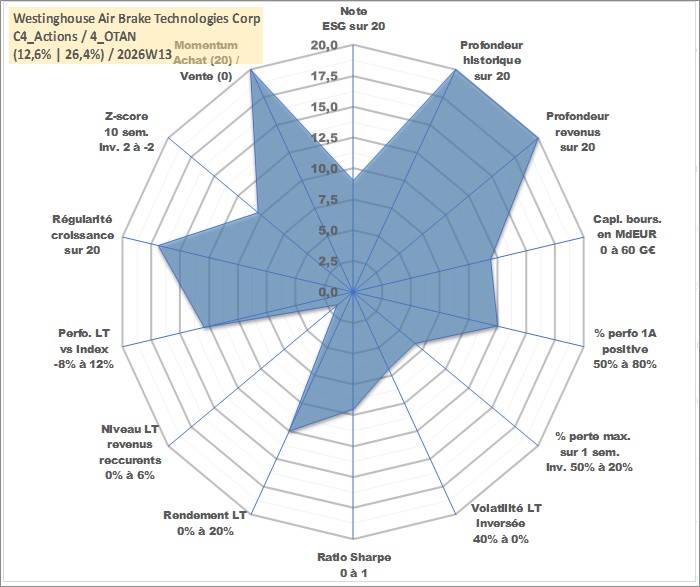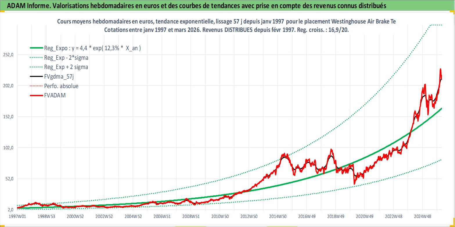 Site dédié aux investisseursPage dédiée sur site financeAnalyse des valorisations hebdomadaires de l'action Westinghouse Air Brake Technologies Corp. Cet actif est cote en USD. Les valorisations sont en contrevaleur EURO et couvrent les semaines 1997W01 a 2026W13. Les revenus de cet actif financier sont pris en compte depuis la semaine 1997W07. La note globale ESG de cet actif est estimee a 9.0 (apres rebasage entre 0 et 20).