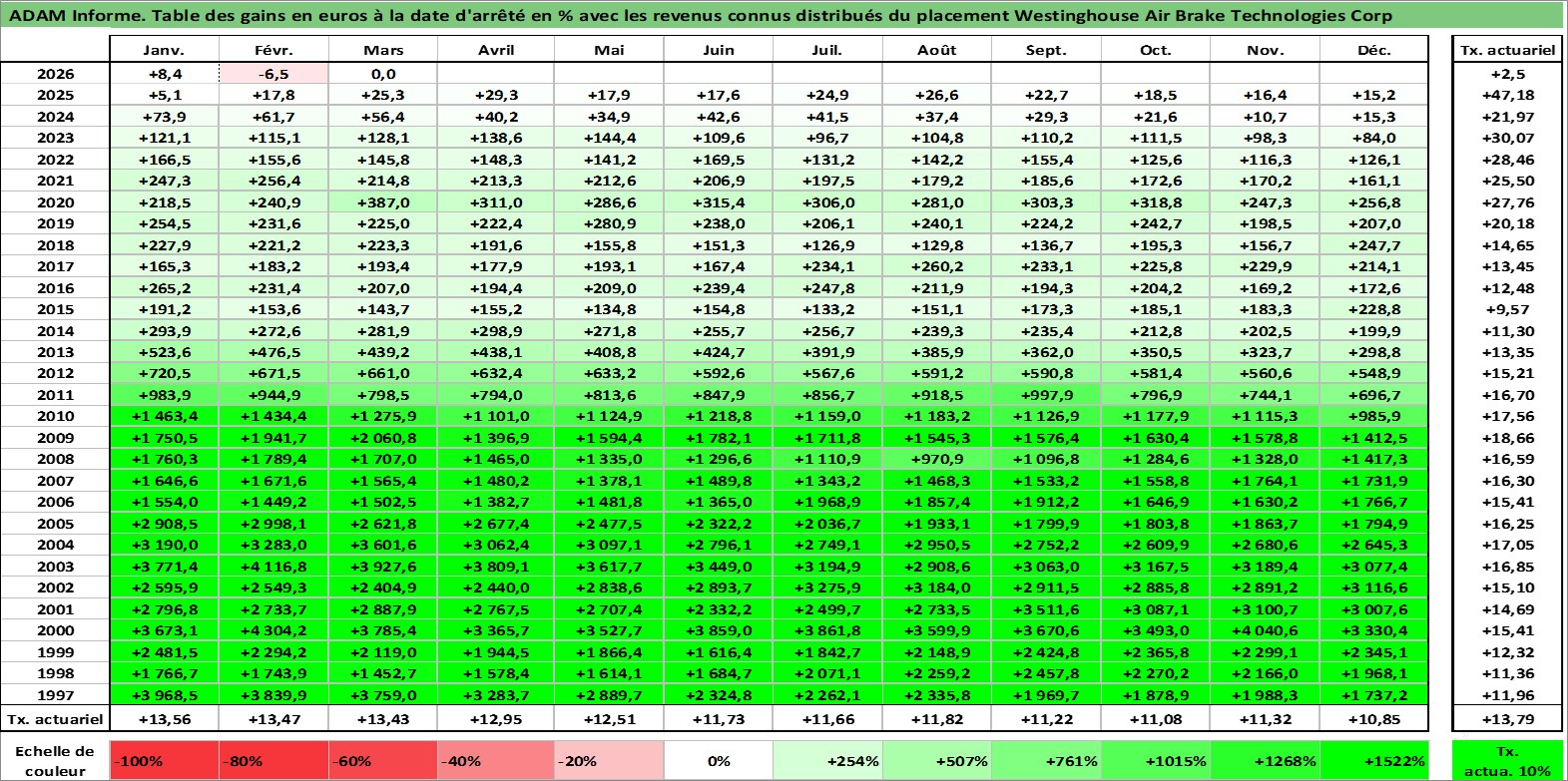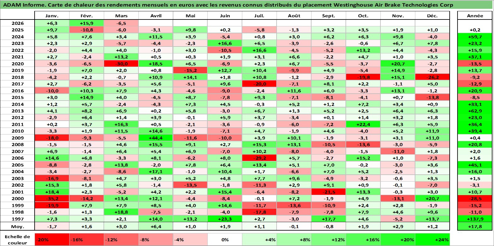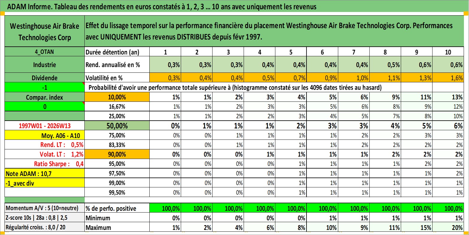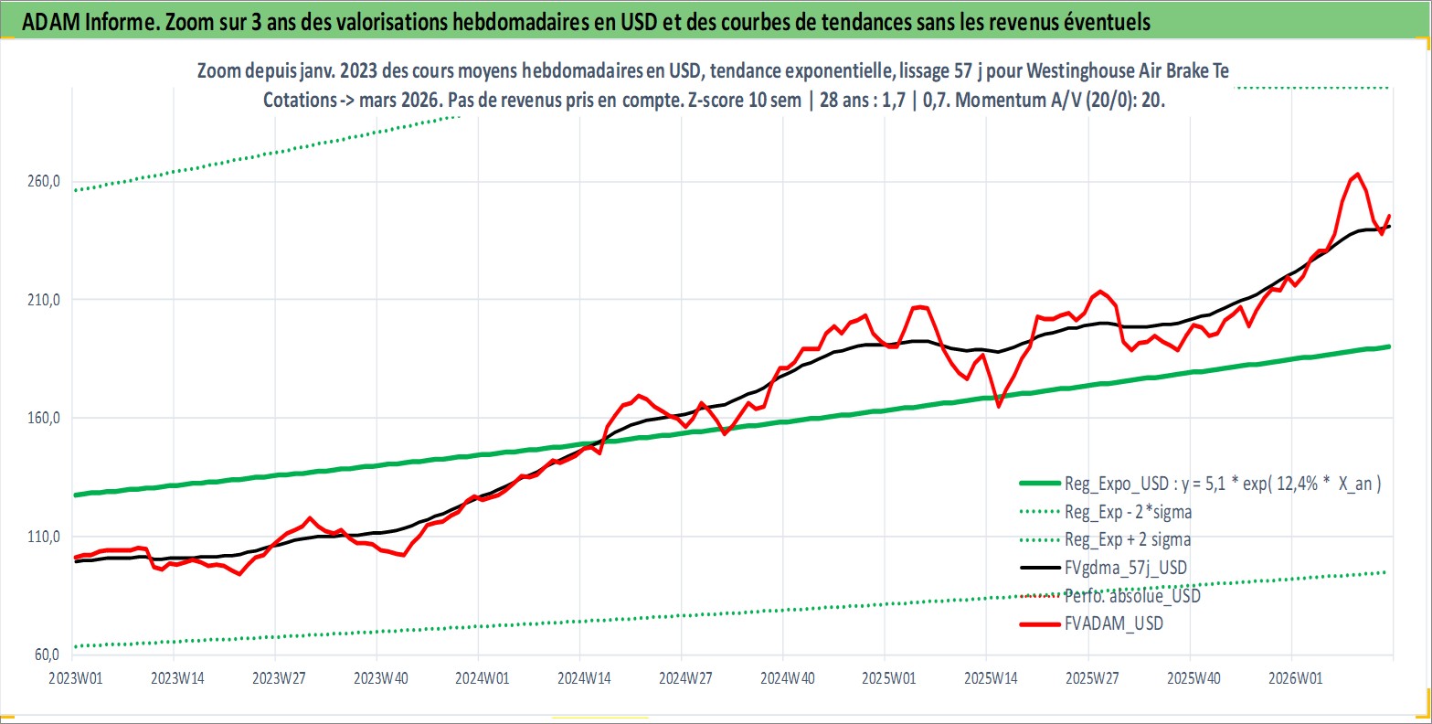 Site dédié aux investisseursPage dédiée sur site financeAnalyse des valorisations hebdomadaires de l'action Westinghouse Air Brake Technologies Corp. Cet actif est cote en USD. Les valorisations sont en contrevaleur EURO et couvrent les semaines 1997W01 a 2026W13. Les revenus de cet actif financier sont pris en compte depuis la semaine 1997W07. La note globale ESG de cet actif est estimee a 9.0 (apres rebasage entre 0 et 20).