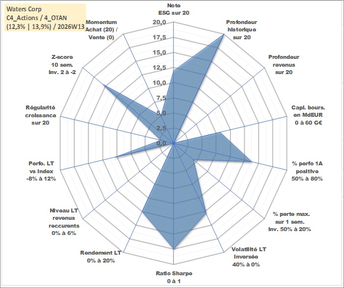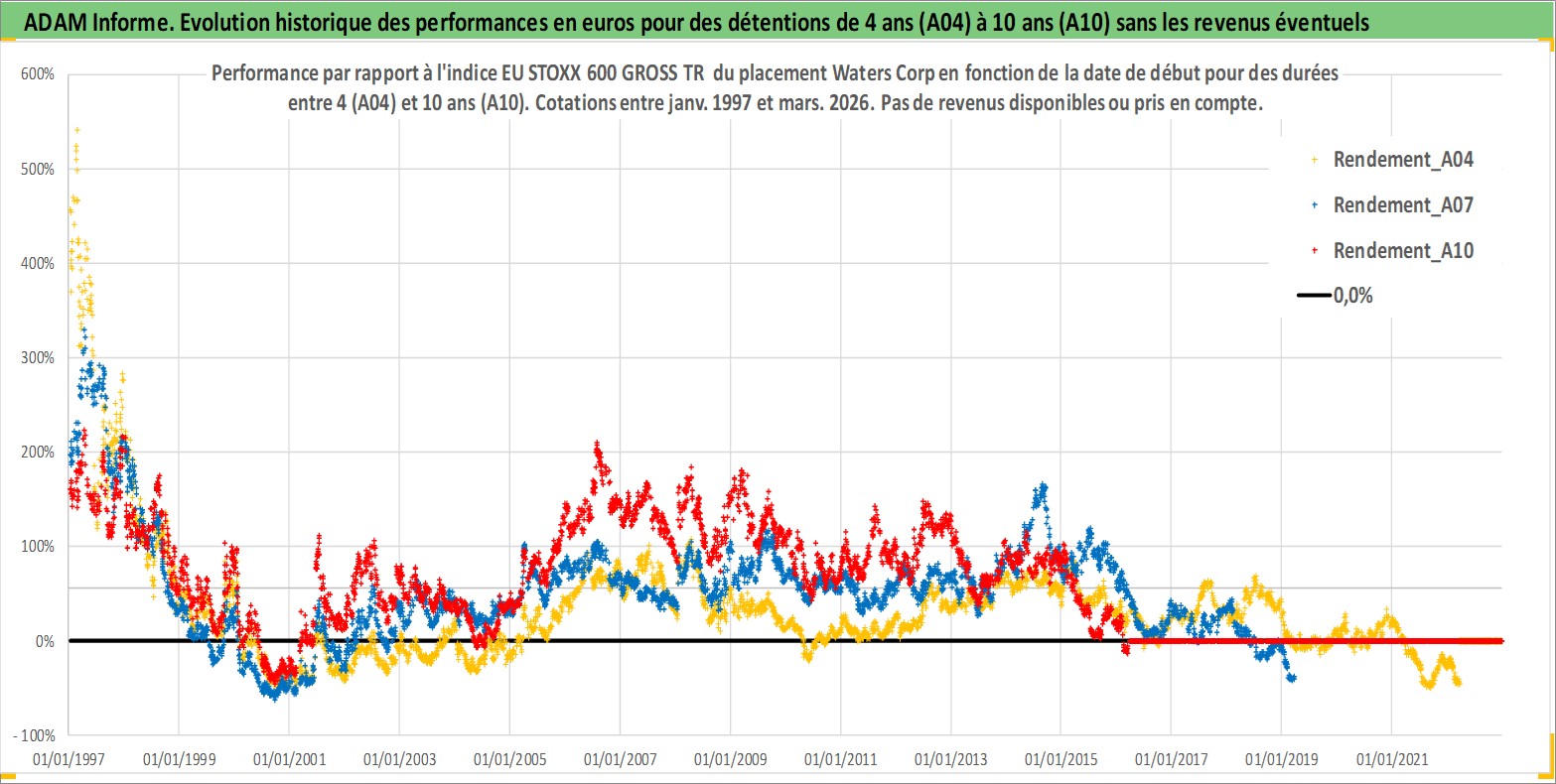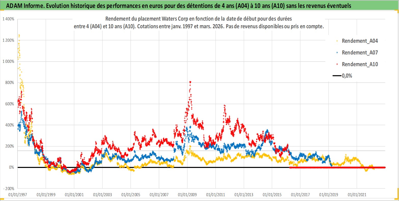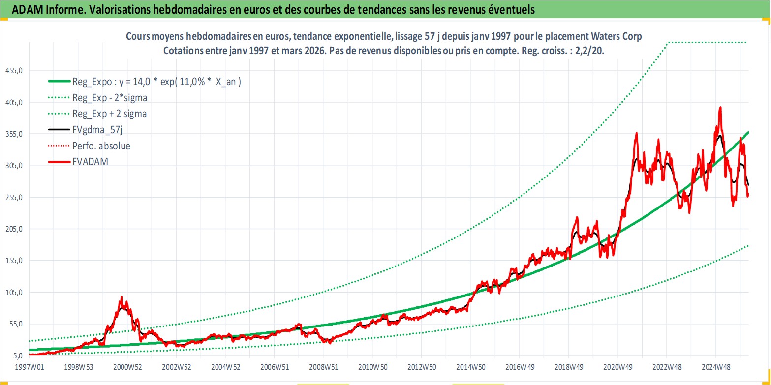 Site dédié aux investisseursPage dédiée sur site financeAnalyse des valorisations hebdomadaires de l'action Waters Corp. Cet actif est cote en USD. Les valorisations sont en contrevaleur EURO et couvrent les semaines 1997W01 a 2026W13. Les revenus de cet actif financier ne sont pas connus car non existants ou non disponibles sur le site Yahoo Finance. La note globale ESG de cet actif est estimee a 12.0 (apres rebasage entre 0 et 20).