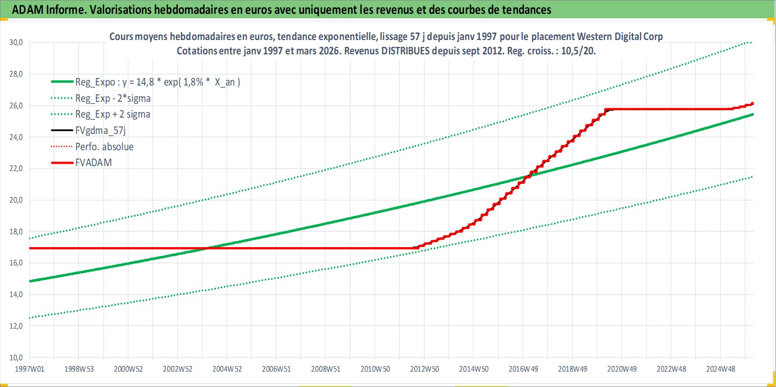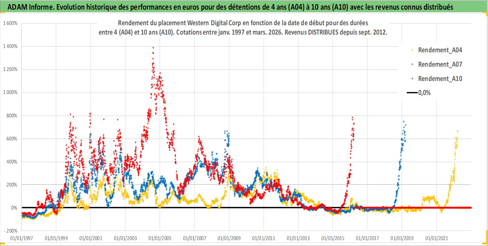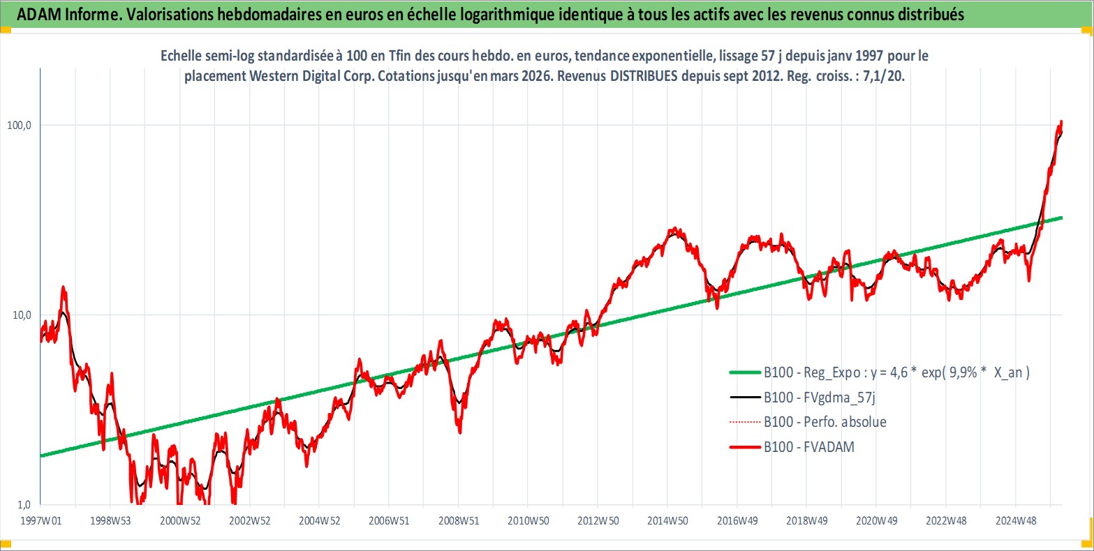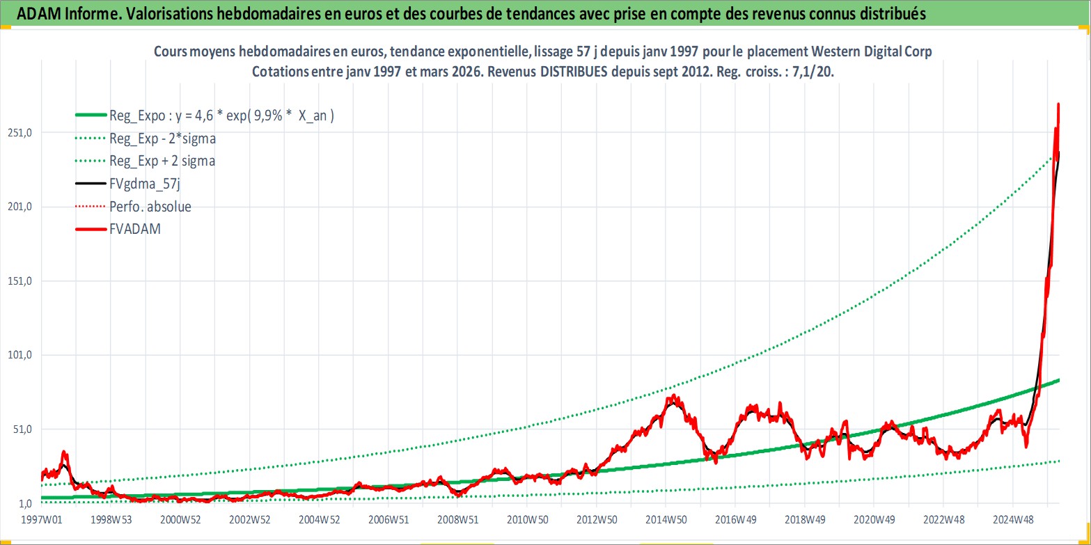 Site dédié aux investisseursPage dédiée sur site financeAnalyse des valorisations hebdomadaires de l'action Western Digital Corp. Cet actif est cote en USD. Les valorisations sont en contrevaleur EURO et couvrent les semaines 1997W01 a 2026W13. Les revenus de cet actif financier sont pris en compte depuis la semaine 2012W39. La note globale ESG de cet actif est estimee a 16.0 (apres rebasage entre 0 et 20).