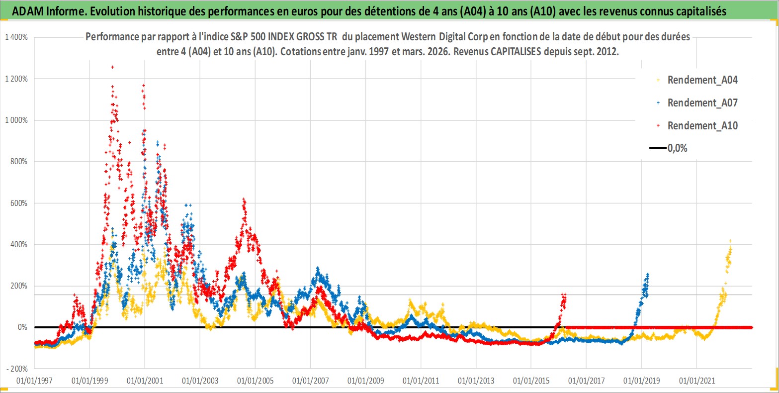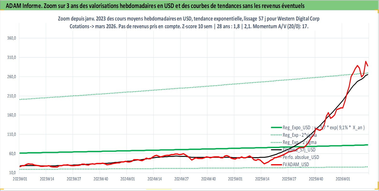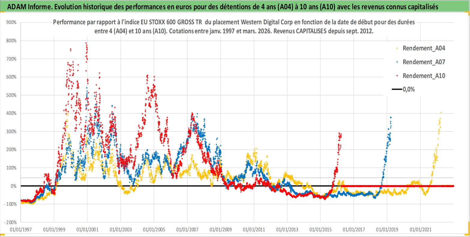 Site dédié aux investisseursPage dédiée sur site financeAnalyse des valorisations hebdomadaires de l'action Western Digital Corp. Cet actif est cote en USD. Les valorisations sont en contrevaleur EURO et couvrent les semaines 1997W01 a 2026W13. Les revenus de cet actif financier sont pris en compte depuis la semaine 2012W39. La note globale ESG de cet actif est estimee a 16.0 (apres rebasage entre 0 et 20).
