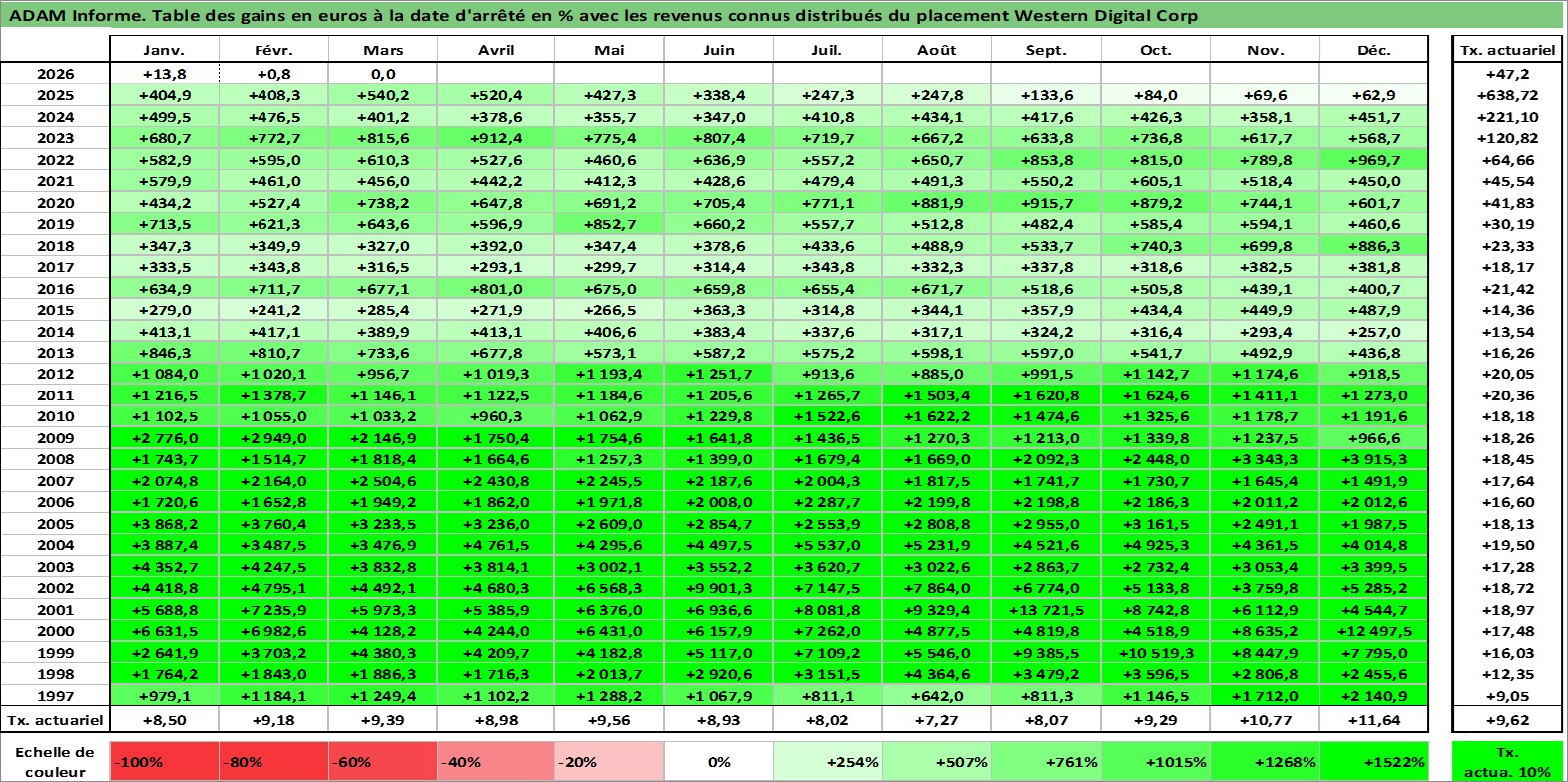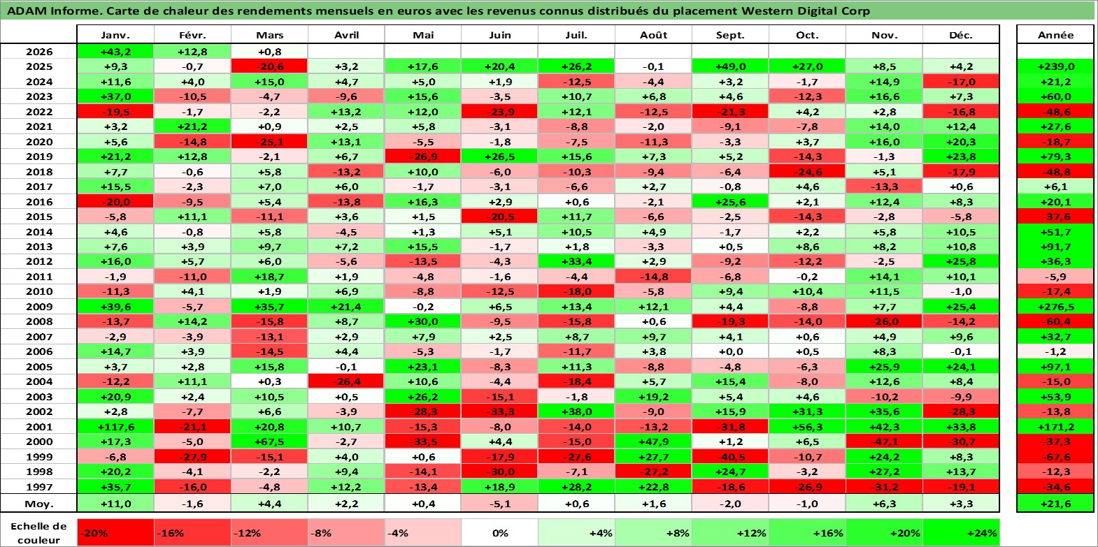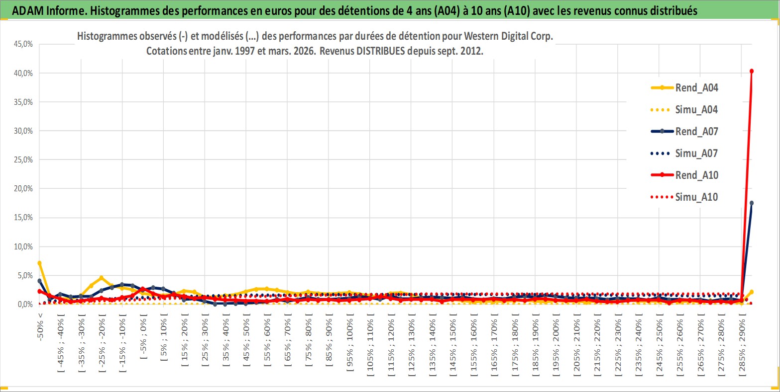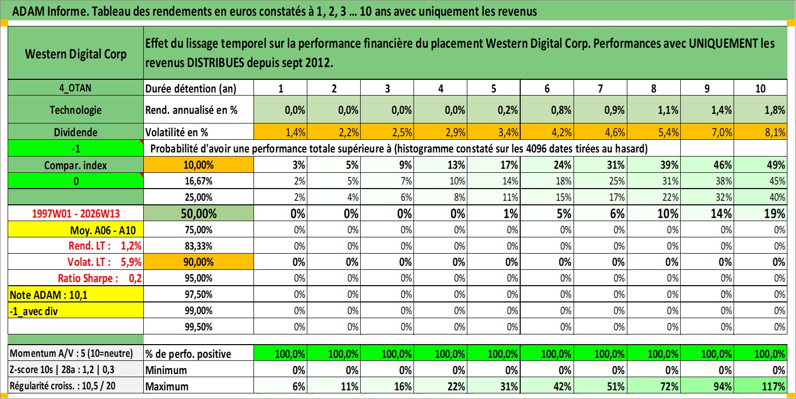 Site dédié aux investisseursPage dédiée sur site financeAnalyse des valorisations hebdomadaires de l'action Western Digital Corp. Cet actif est cote en USD. Les valorisations sont en contrevaleur EURO et couvrent les semaines 1997W01 a 2026W13. Les revenus de cet actif financier sont pris en compte depuis la semaine 2012W39. La note globale ESG de cet actif est estimee a 16.0 (apres rebasage entre 0 et 20).