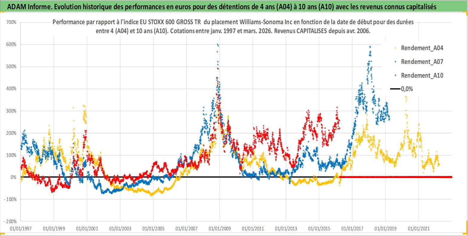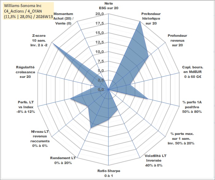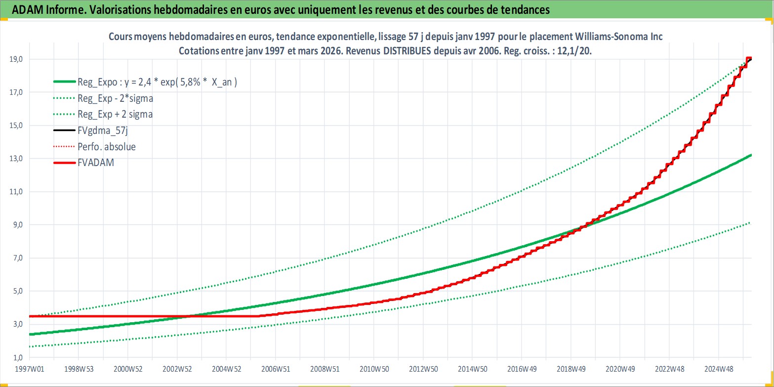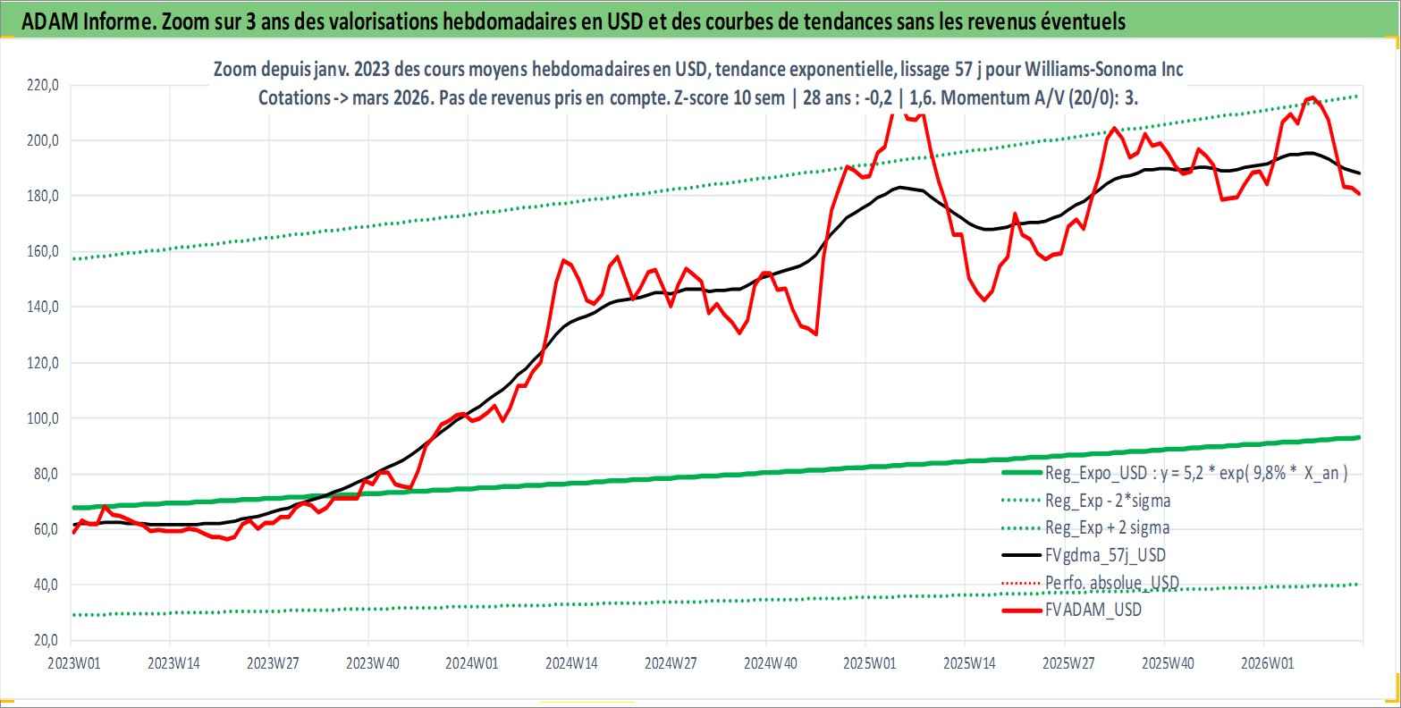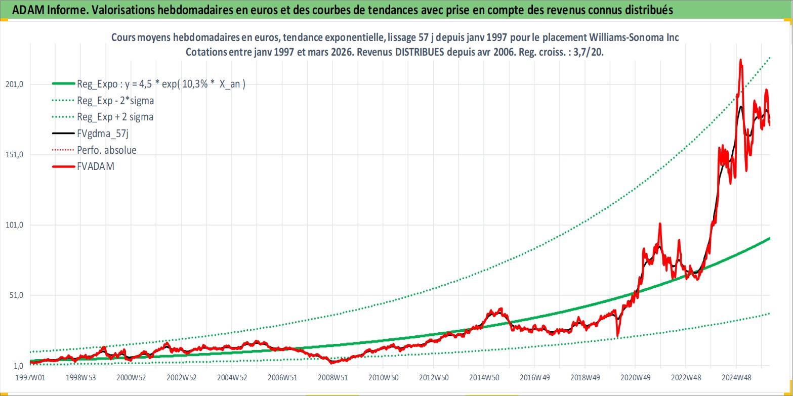Site dédié aux investisseursPage dédiée sur site financeAnalyse des valorisations hebdomadaires de l'action Williams-Sonoma Inc. Cet actif est cote en USD. Les valorisations sont en contrevaleur EURO et couvrent les semaines 1997W01 a 2026W13. Les revenus de cet actif financier sont pris en compte depuis la semaine 2006W17. La note ESG de cet actif n'est pas connue.