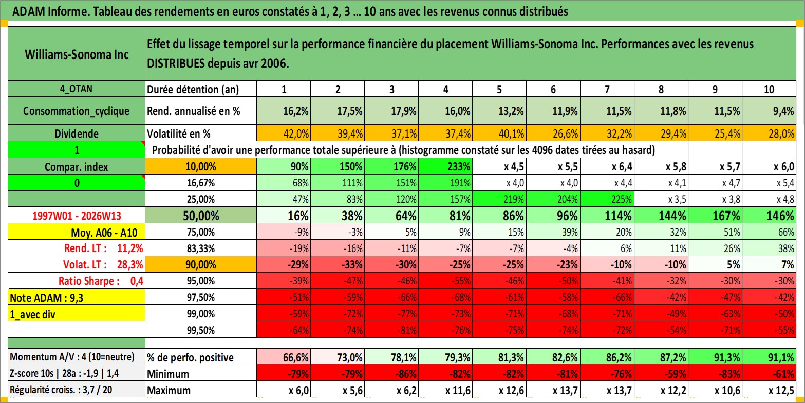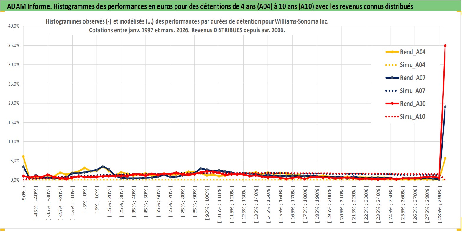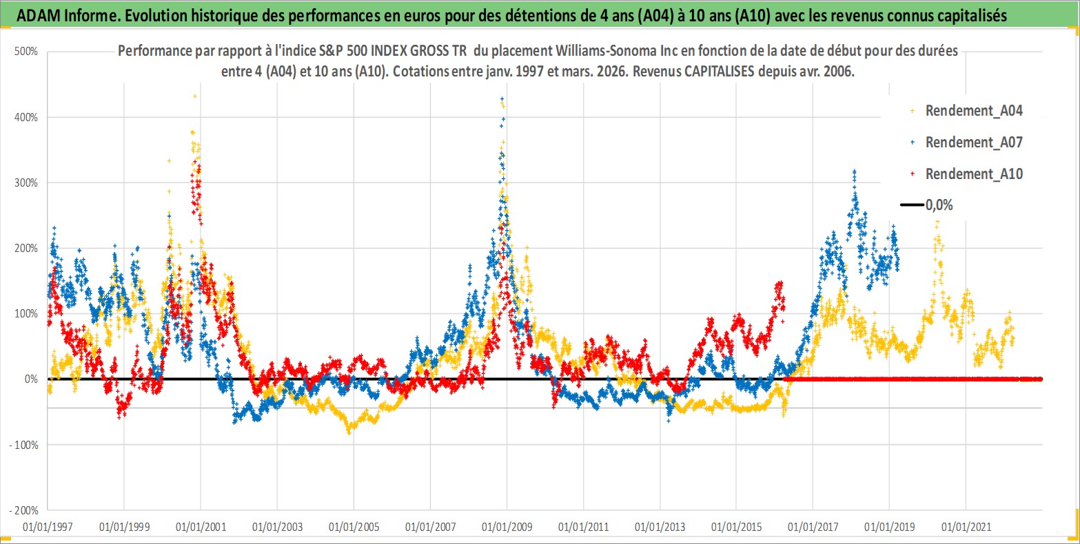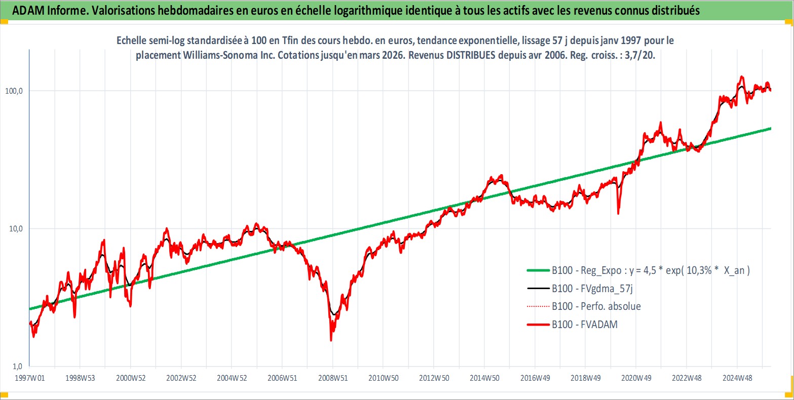 Site dédié aux investisseursPage dédiée sur site financeAnalyse des valorisations hebdomadaires de l'action Williams-Sonoma Inc. Cet actif est cote en USD. Les valorisations sont en contrevaleur EURO et couvrent les semaines 1997W01 a 2026W13. Les revenus de cet actif financier sont pris en compte depuis la semaine 2006W17. La note ESG de cet actif n'est pas connue.