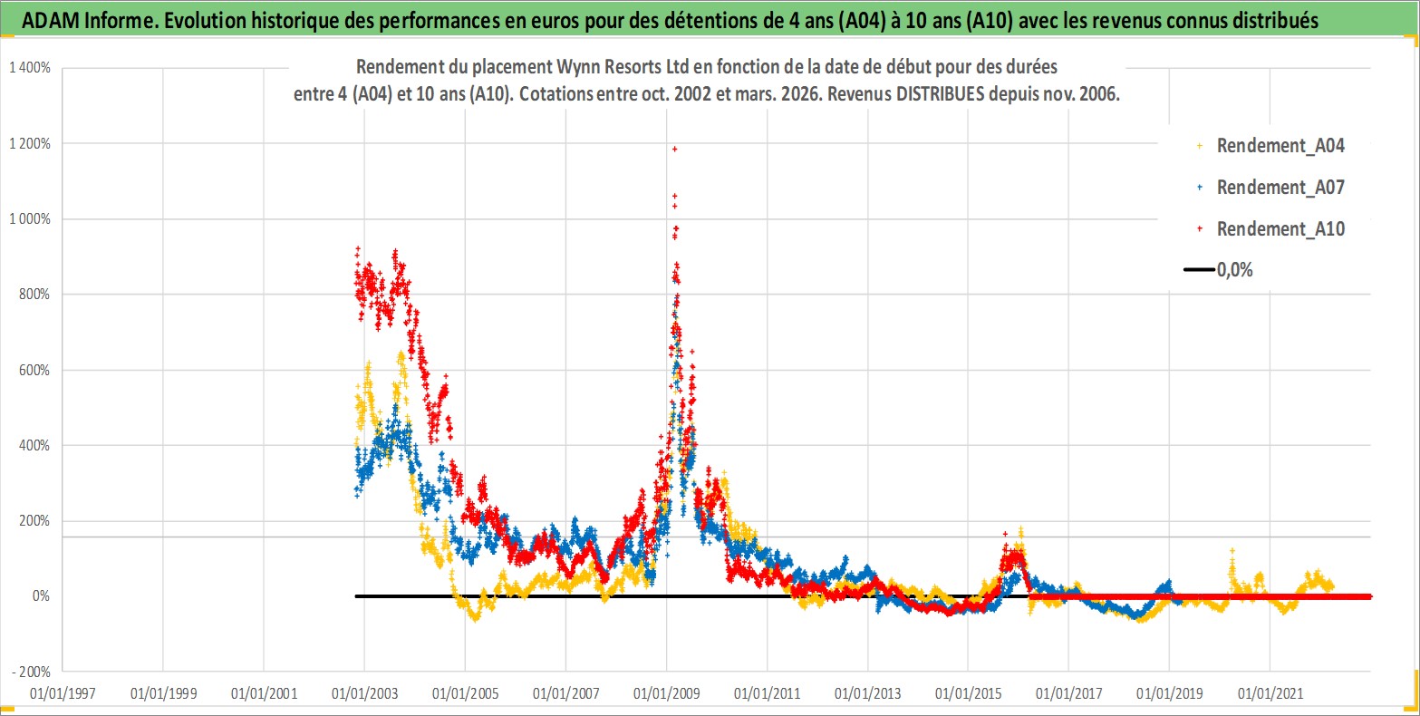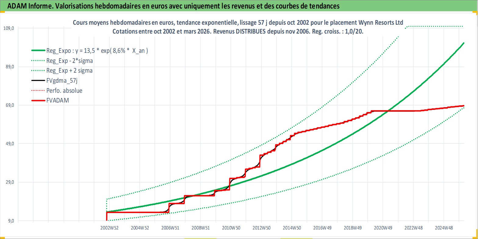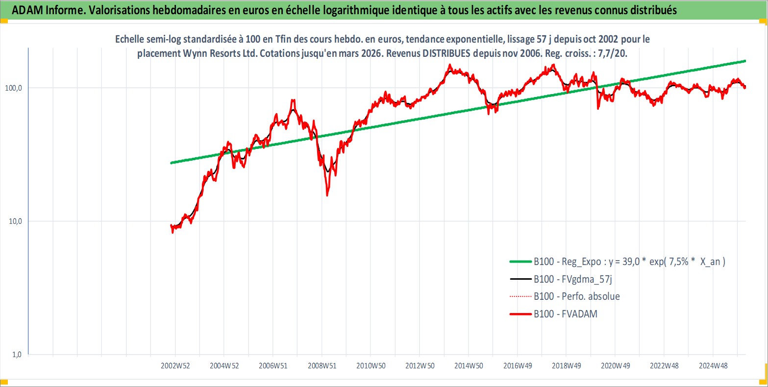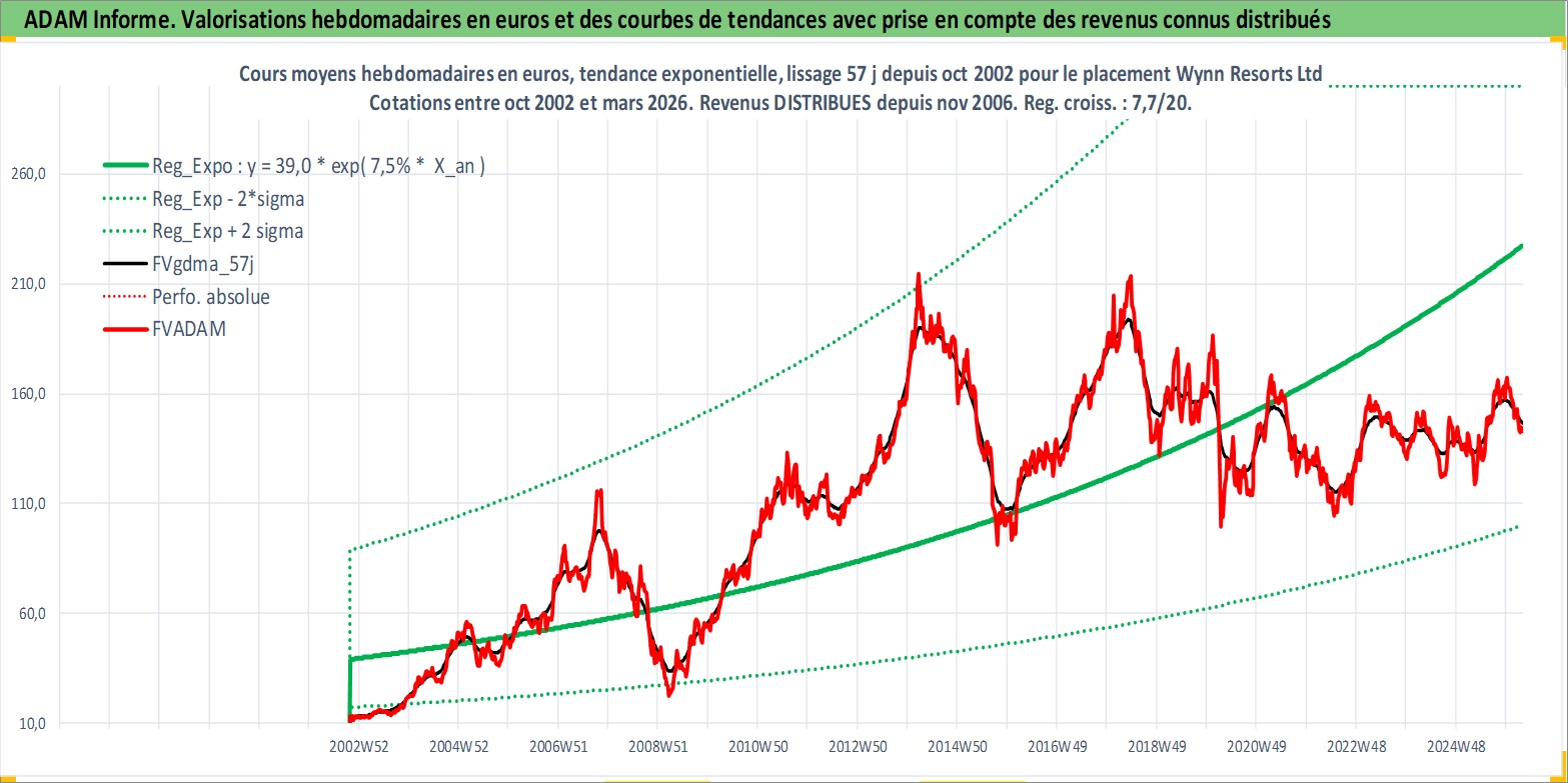Site dédié aux investisseursPage dédiée sur site financeAnalyse des valorisations hebdomadaires de l'action Wynn Resorts Ltd. Cet actif est cote en USD. Les valorisations sont en contrevaleur EURO et couvrent les semaines 2002W43 a 2026W13. Les revenus de cet actif financier sont pris en compte depuis la semaine 2006W47. La note globale ESG de cet actif est estimee a 7.0 (apres rebasage entre 0 et 20).