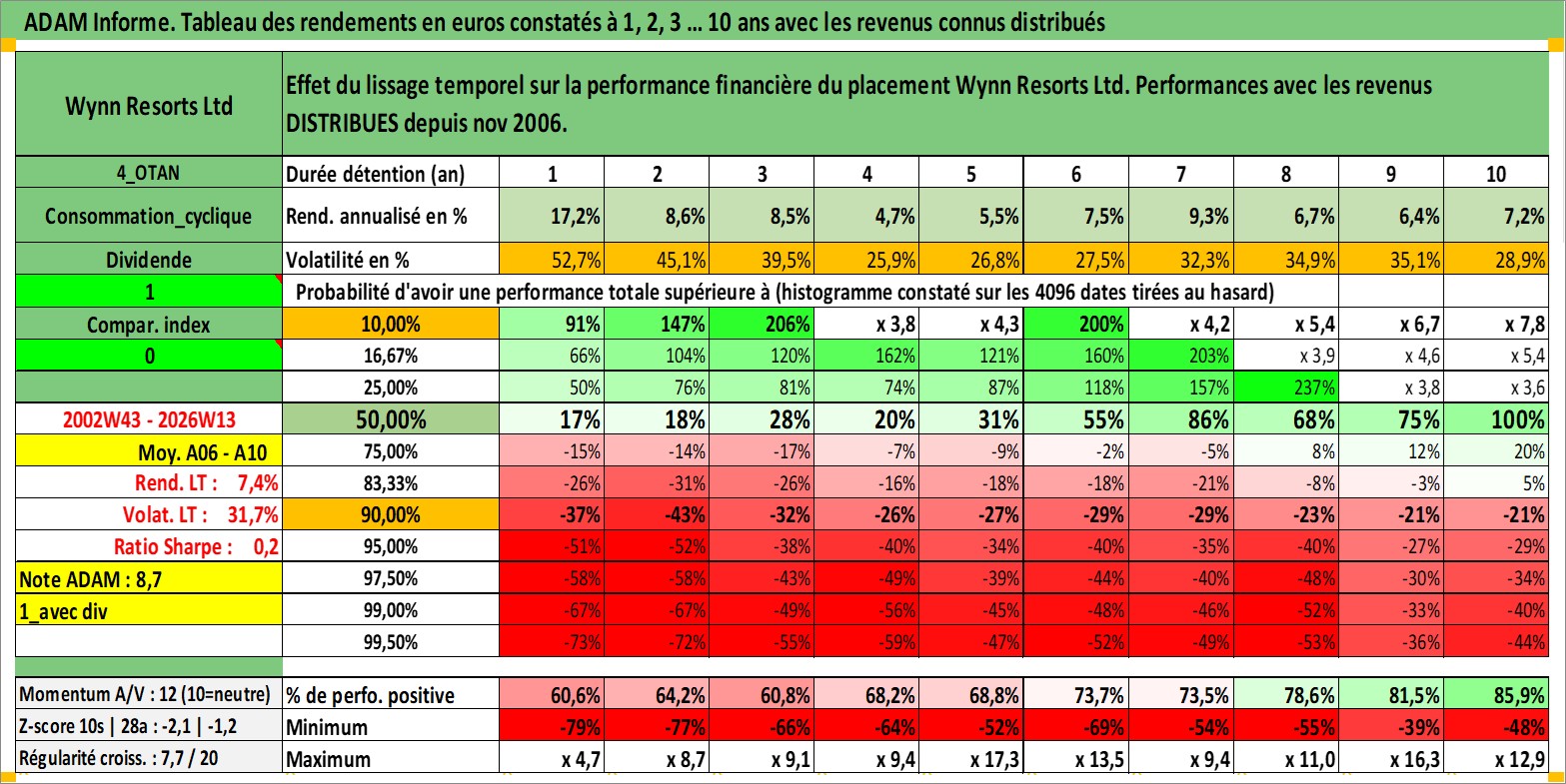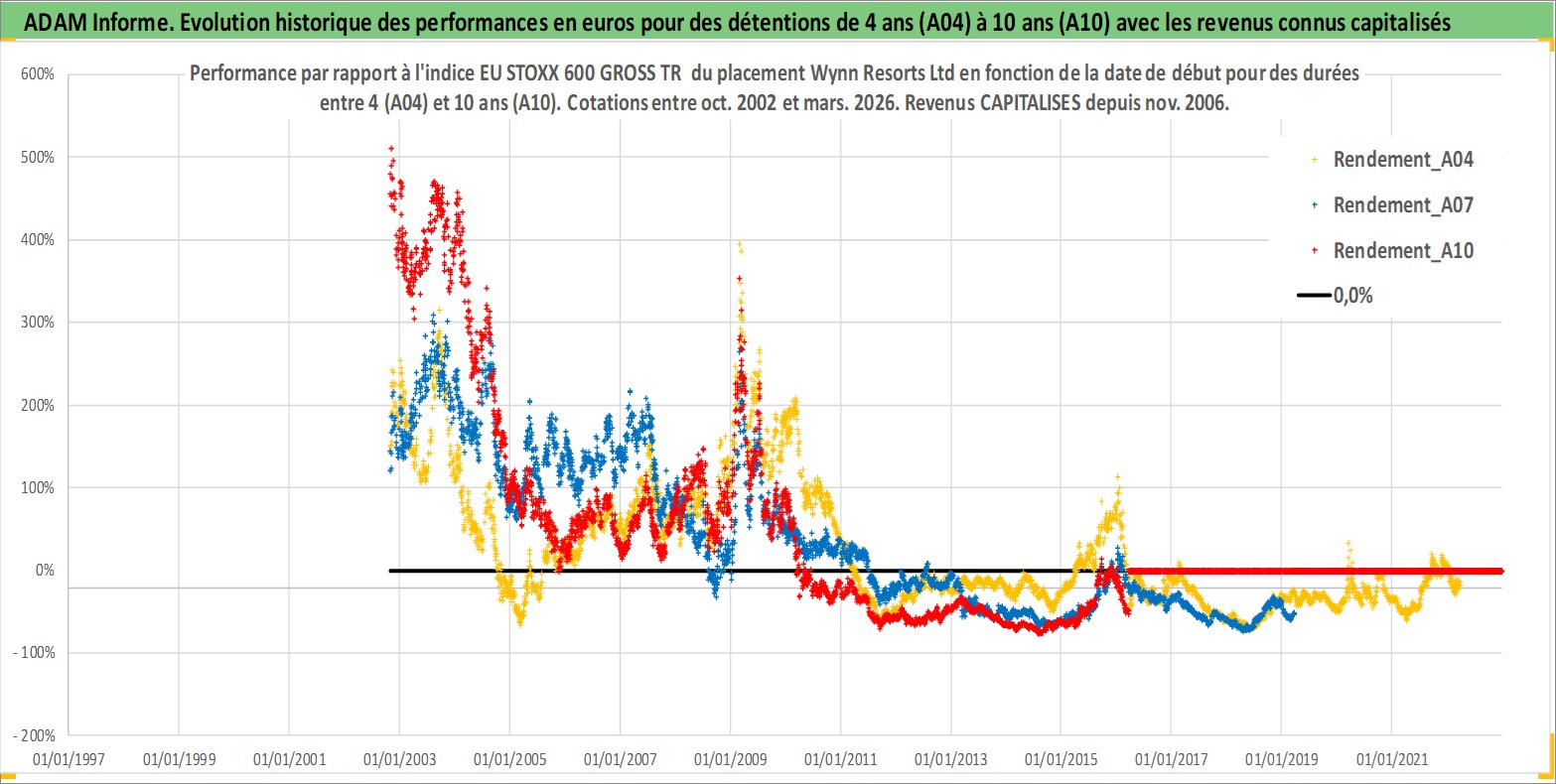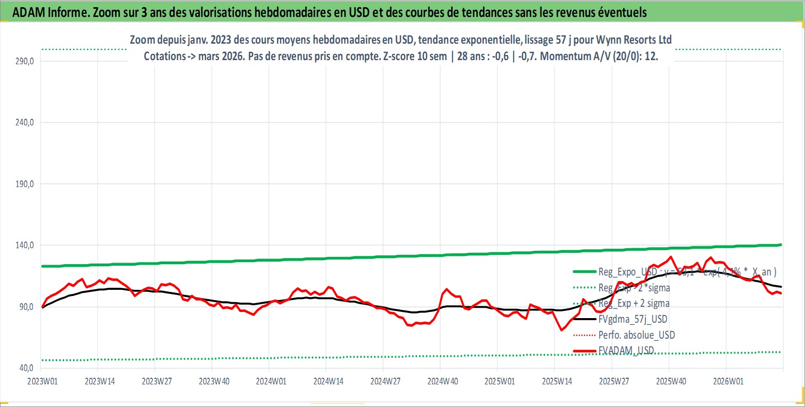 Site dédié aux investisseursPage dédiée sur site financeAnalyse des valorisations hebdomadaires de l'action Wynn Resorts Ltd. Cet actif est cote en USD. Les valorisations sont en contrevaleur EURO et couvrent les semaines 2002W43 a 2026W13. Les revenus de cet actif financier sont pris en compte depuis la semaine 2006W47. La note globale ESG de cet actif est estimee a 7.0 (apres rebasage entre 0 et 20).