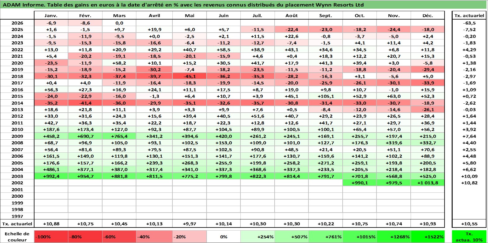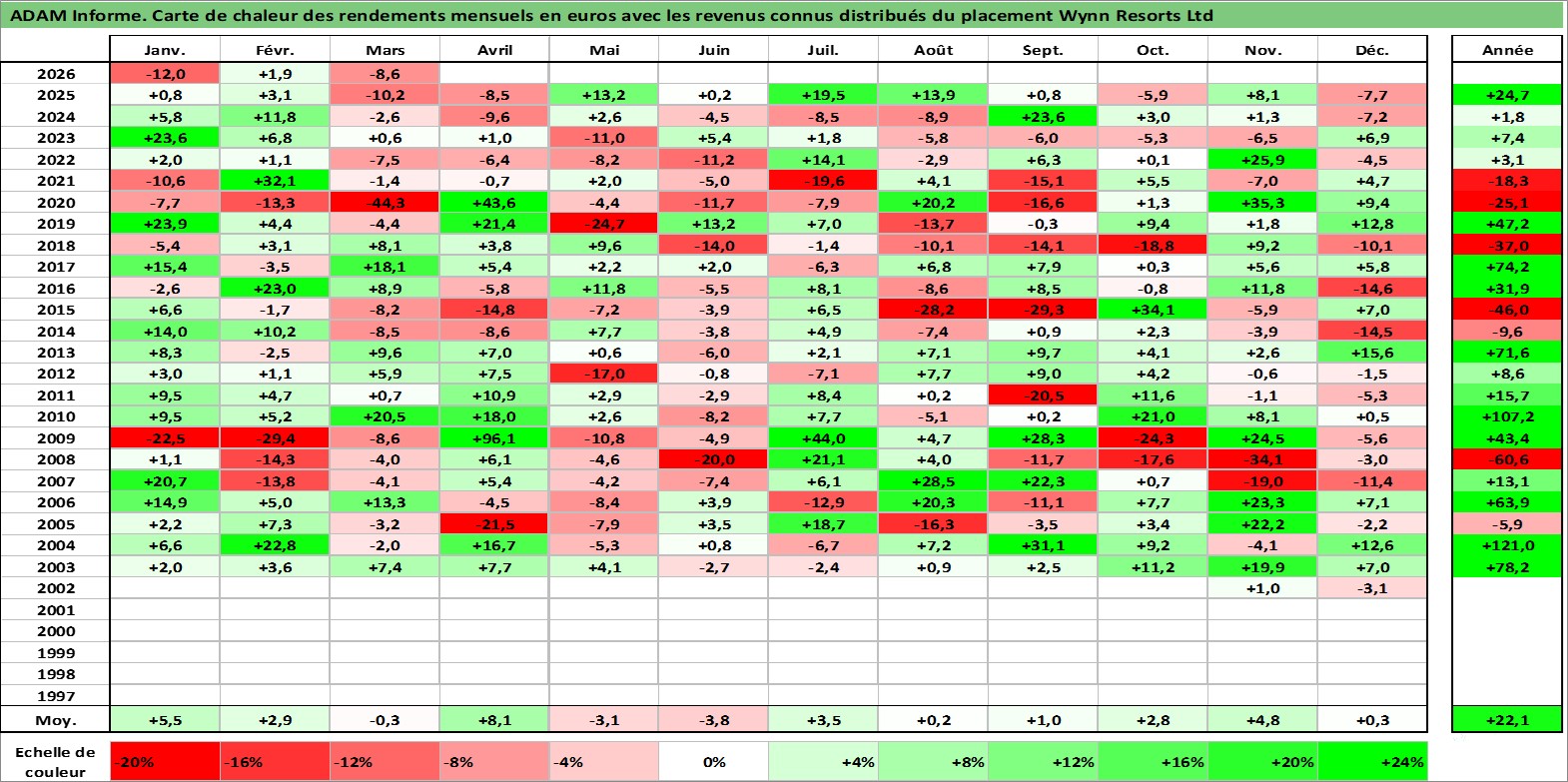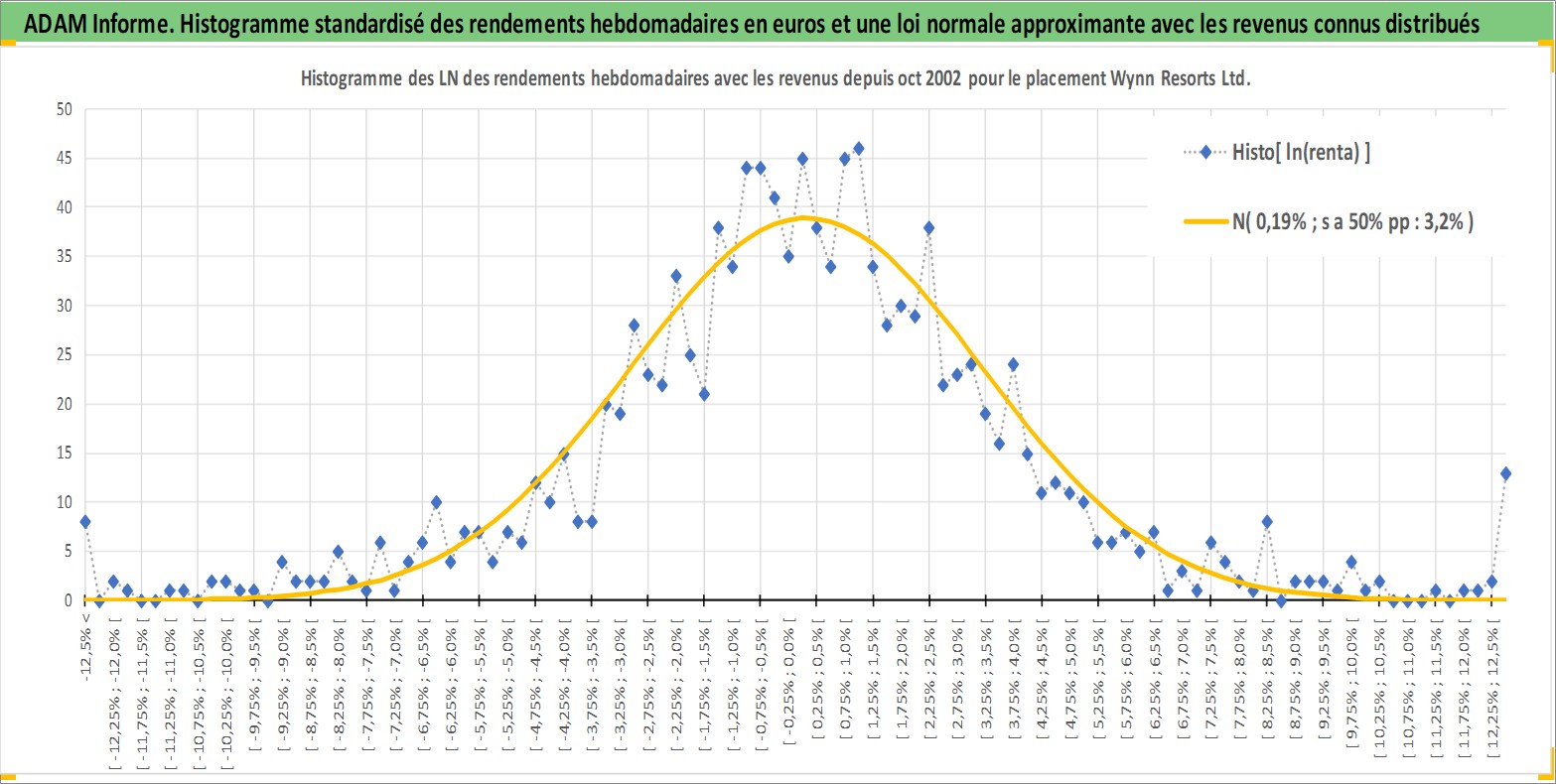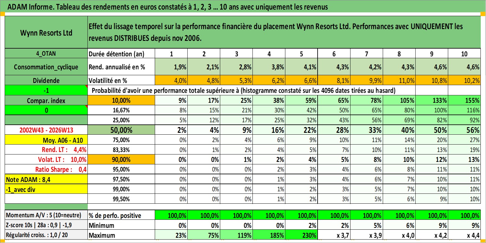 Site dédié aux investisseursPage dédiée sur site financeAnalyse des valorisations hebdomadaires de l'action Wynn Resorts Ltd. Cet actif est cote en USD. Les valorisations sont en contrevaleur EURO et couvrent les semaines 2002W43 a 2026W13. Les revenus de cet actif financier sont pris en compte depuis la semaine 2006W47. La note globale ESG de cet actif est estimee a 7.0 (apres rebasage entre 0 et 20).
