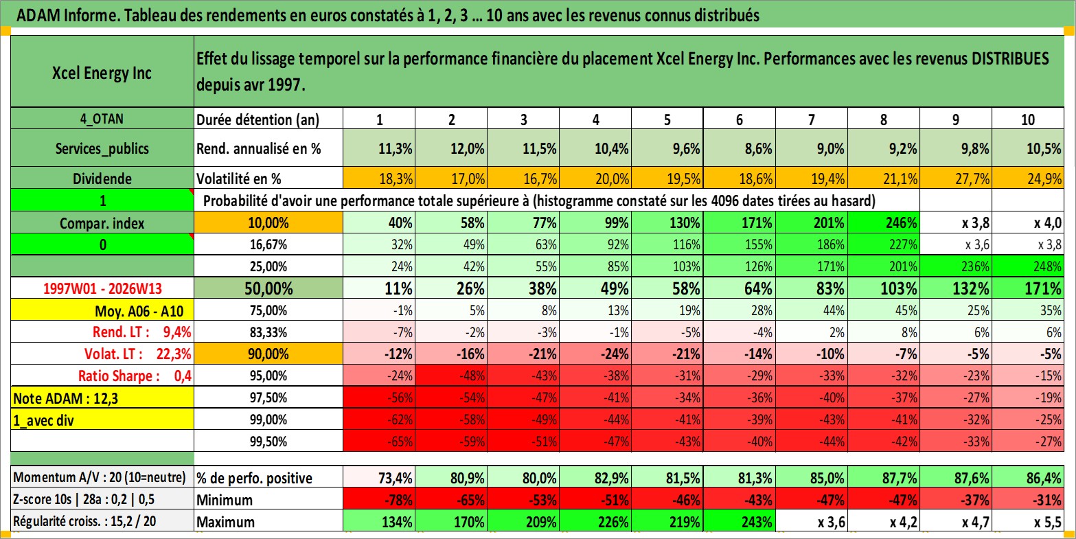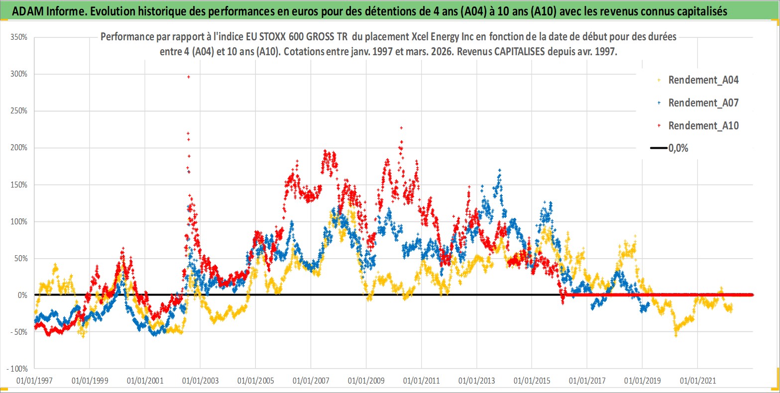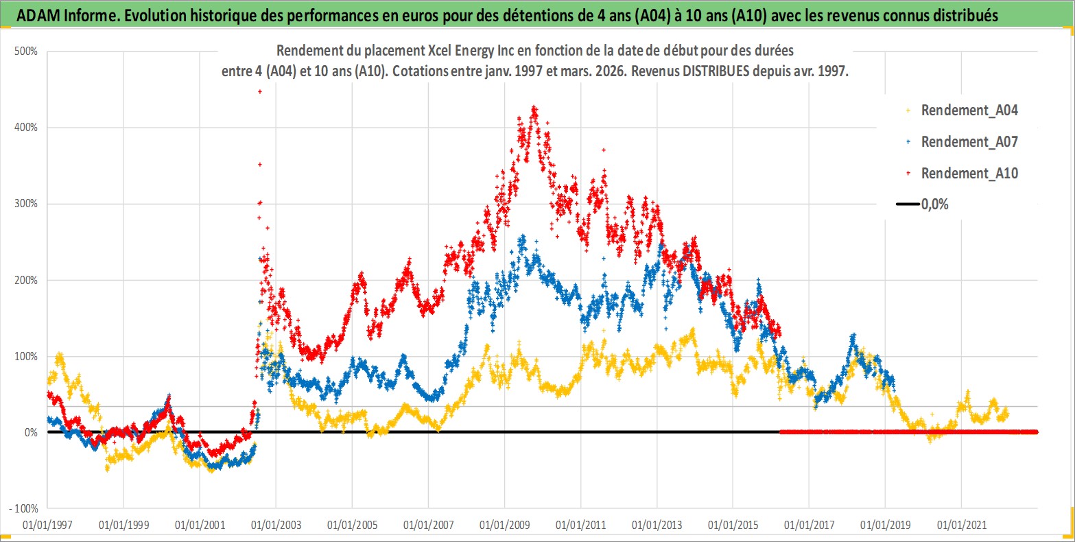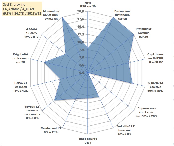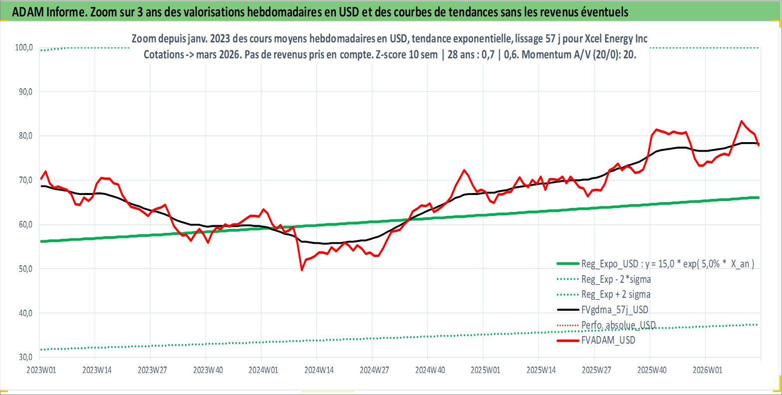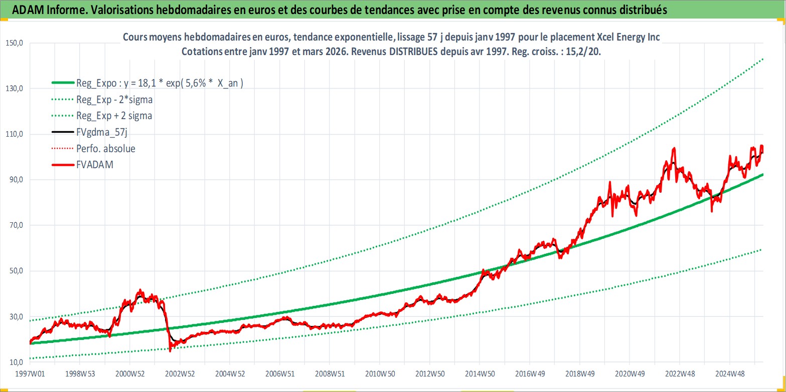 Site dédié aux investisseursPage dédiée sur site financeAnalyse des valorisations hebdomadaires de l'action Xcel Energy Inc. Cet actif est cote en USD. Les valorisations sont en contrevaleur EURO et couvrent les semaines 1997W01 a 2026W13. Les revenus de cet actif financier sont pris en compte depuis la semaine 1997W15. La note globale ESG de cet actif est estimee a 8.0 (apres rebasage entre 0 et 20).