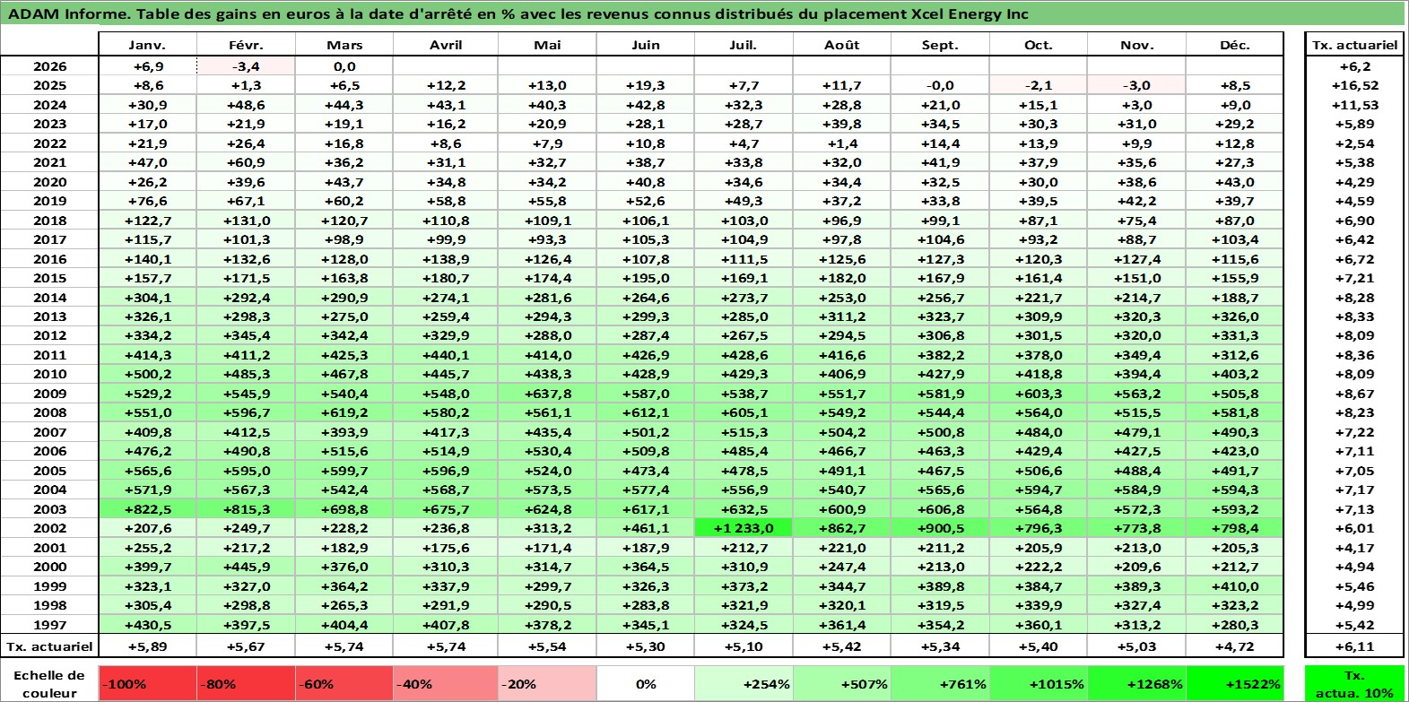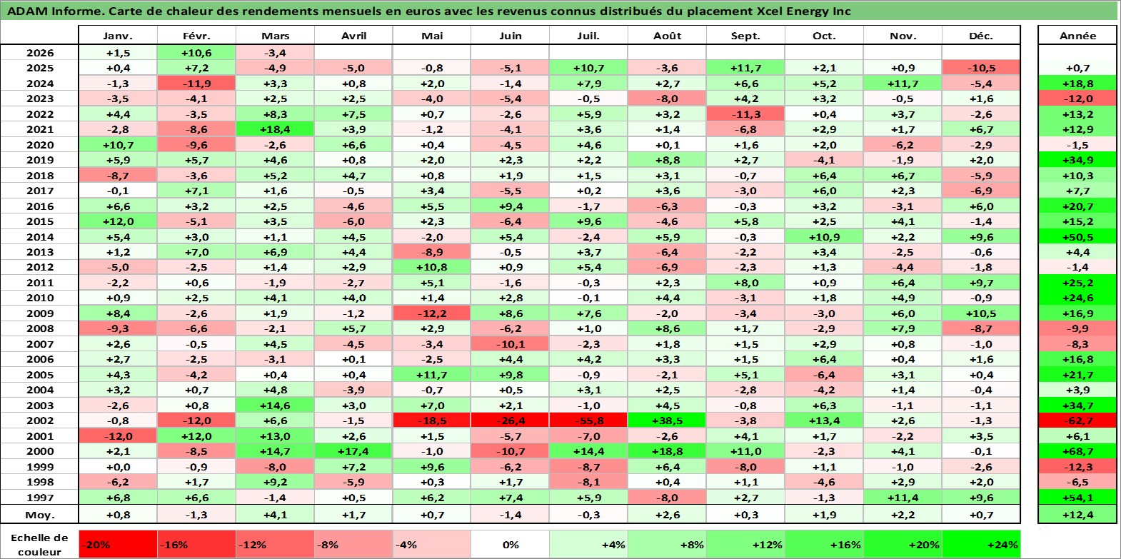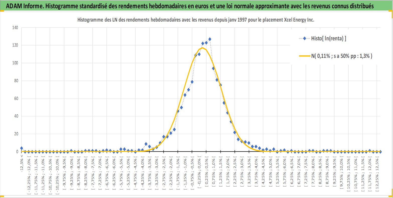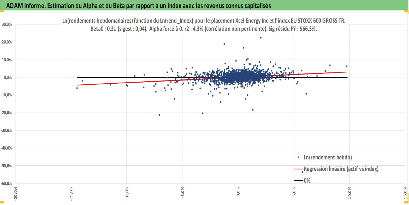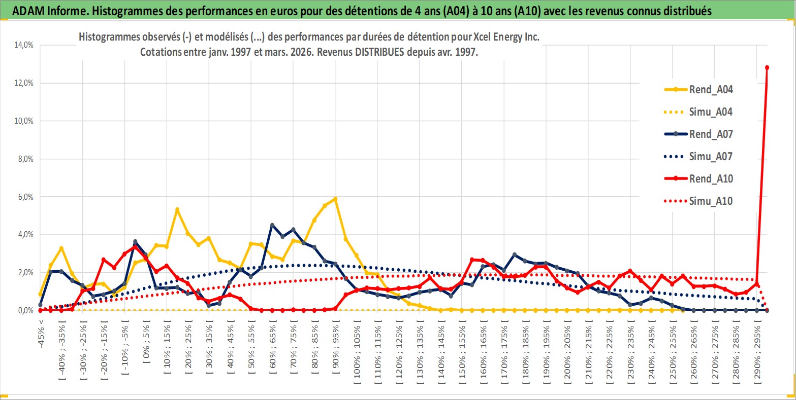 Site dédié aux investisseursPage dédiée sur site financeAnalyse des valorisations hebdomadaires de l'action Xcel Energy Inc. Cet actif est cote en USD. Les valorisations sont en contrevaleur EURO et couvrent les semaines 1997W01 a 2026W13. Les revenus de cet actif financier sont pris en compte depuis la semaine 1997W15. La note globale ESG de cet actif est estimee a 8.0 (apres rebasage entre 0 et 20).