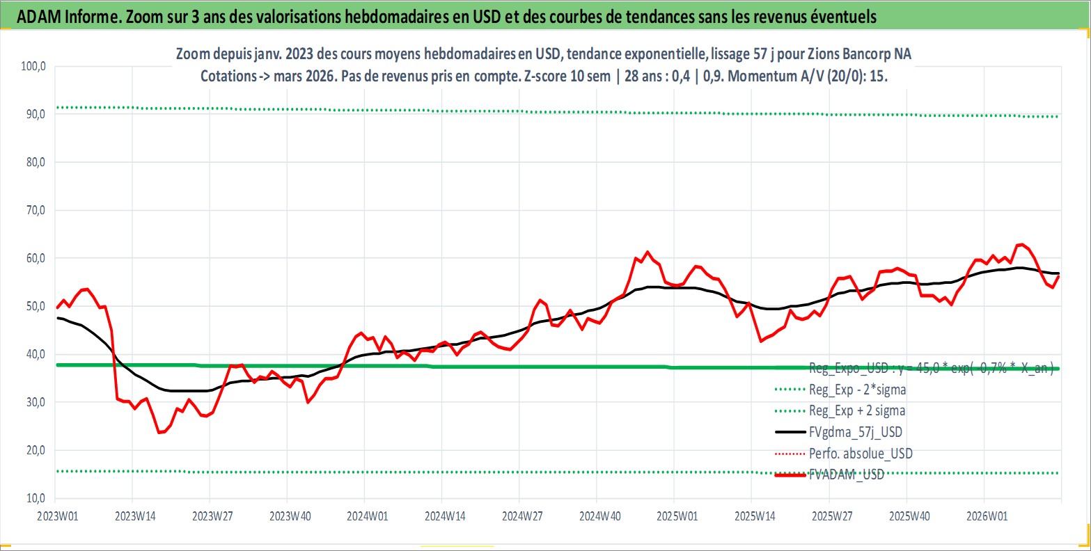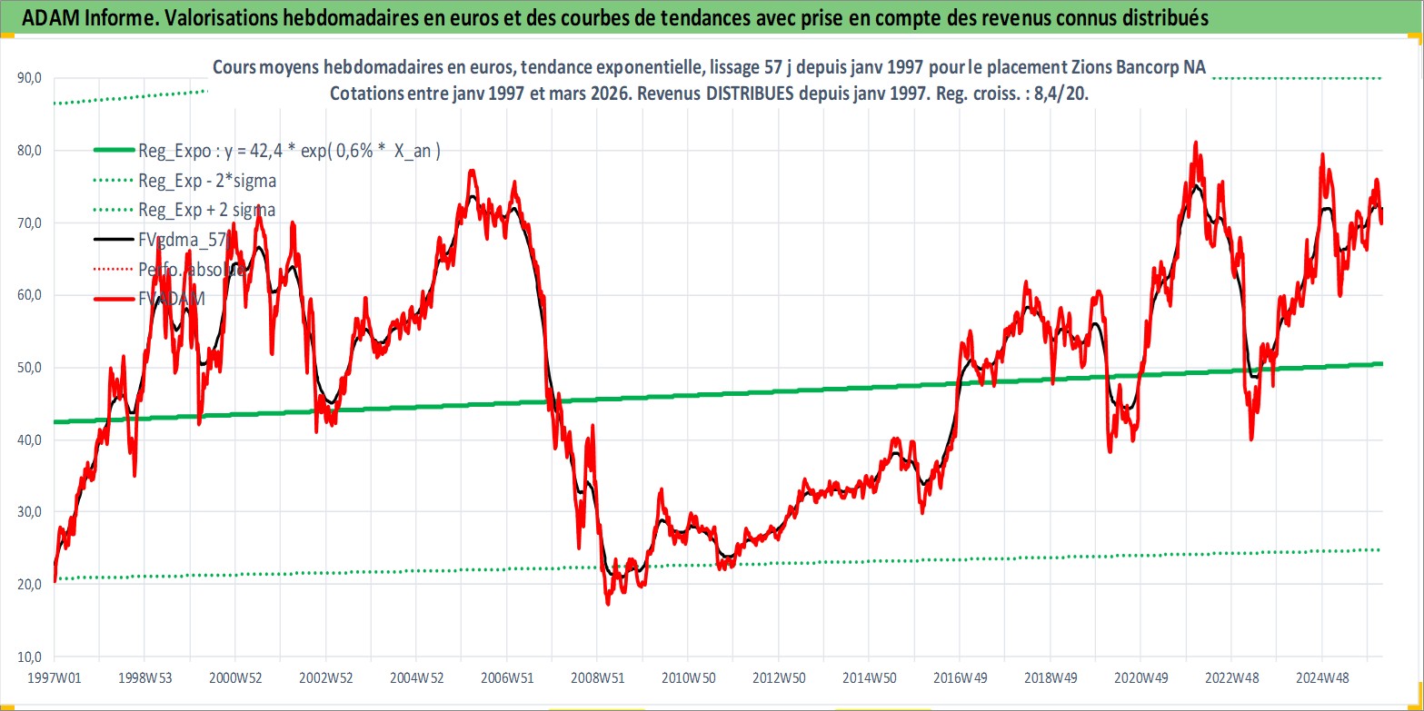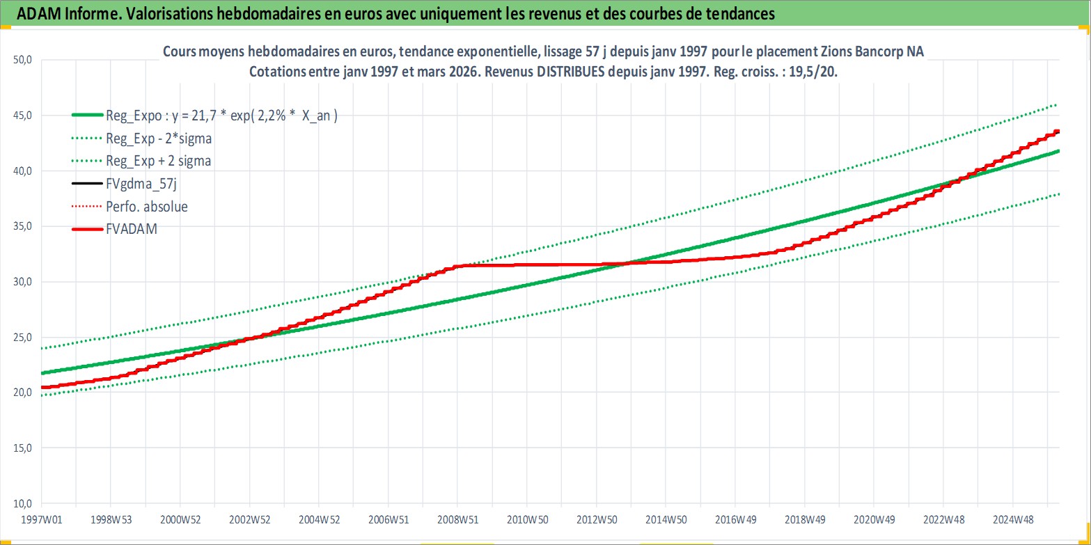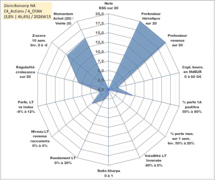 Site dédié aux investisseursPage dédiée sur site financeAnalyse des valorisations hebdomadaires de l'action Zions Bancorp NA. Cet actif est cote en USD. Les valorisations sont en contrevaleur EURO et couvrent les semaines 1997W01 a 2026W13. Les revenus de cet actif financier sont pris en compte depuis la semaine 1997W01. La note ESG de cet actif n'est pas connue.