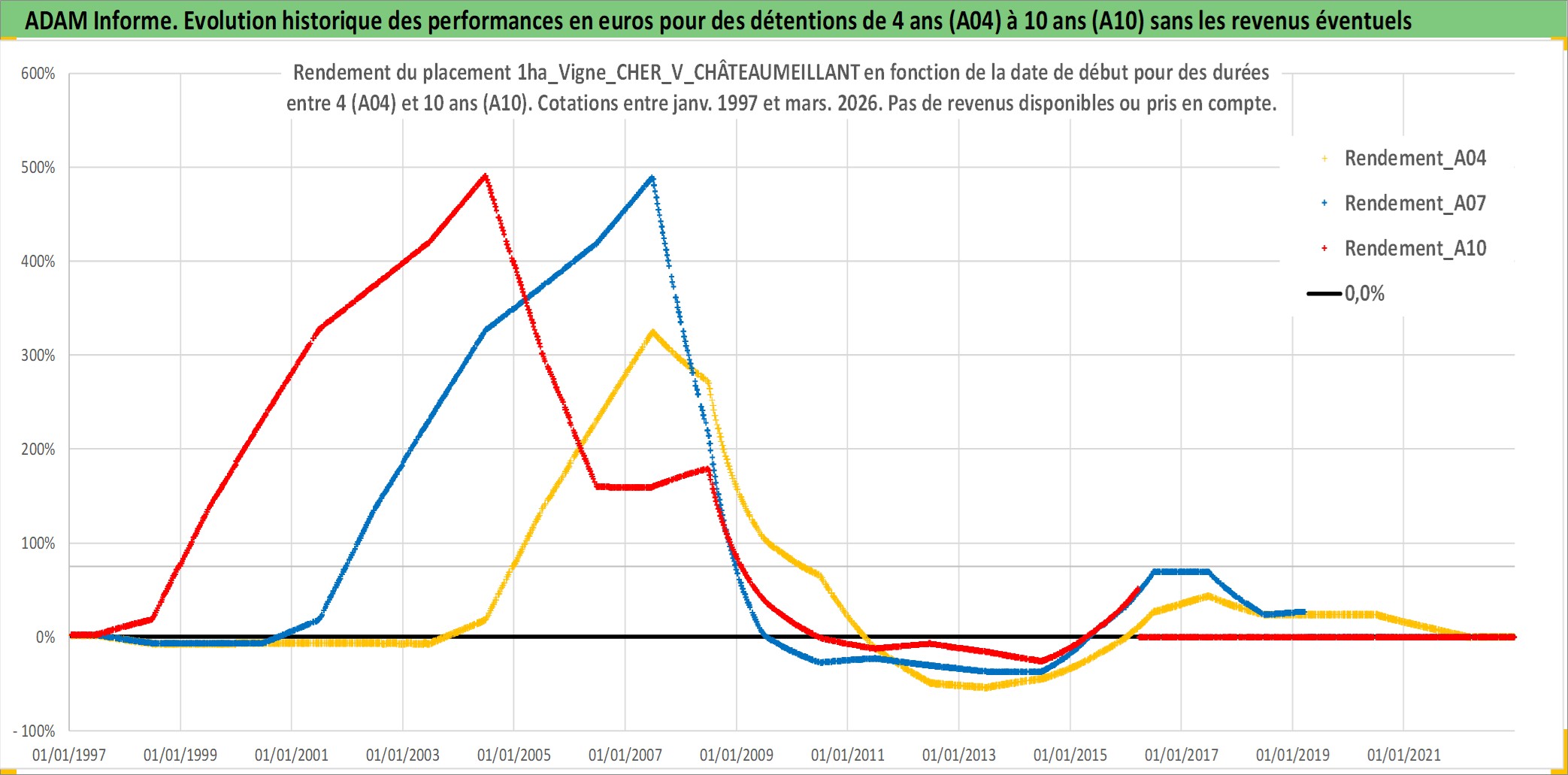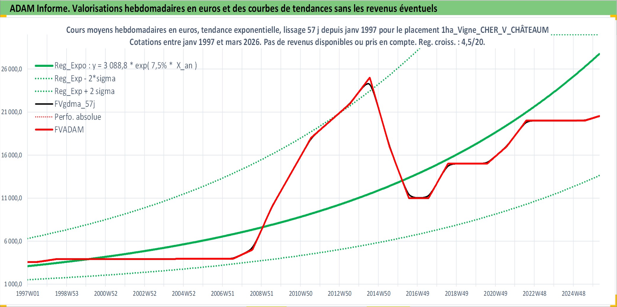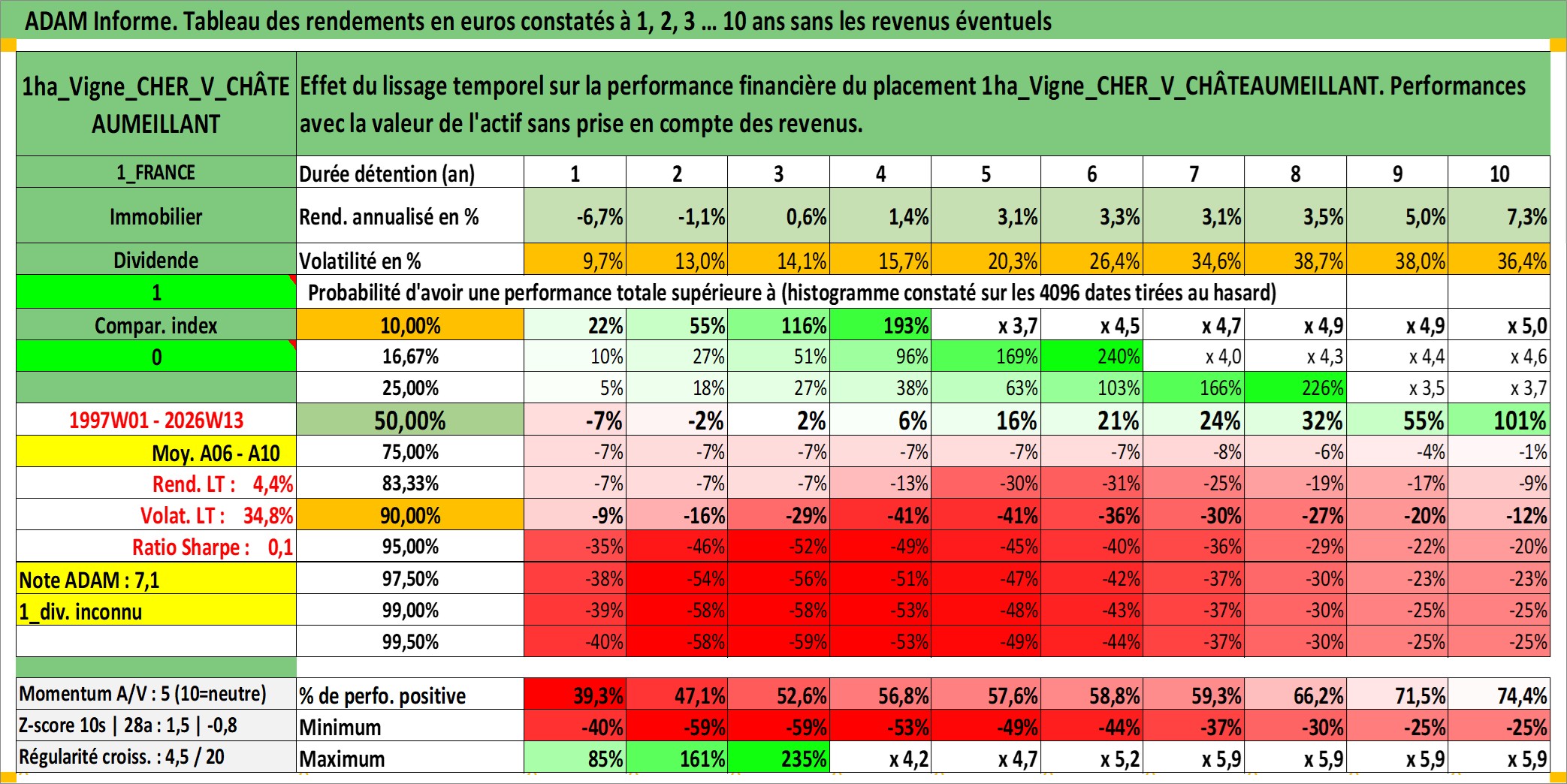 Site dédié aux investisseursPage dédiée sur site financeAnalyse des valorisations hebdomadaires de l'actif 1ha_Vigne_CHER_V_CHÂTEAUMEILLANT. Cet actif est cote en EUR. Les valorisations couvrent les semaines 1997W01 a 2026W13. Les fermages de ce bien foncier sont pris egaux a 2,5% annuels de la valeur venale du bien.
