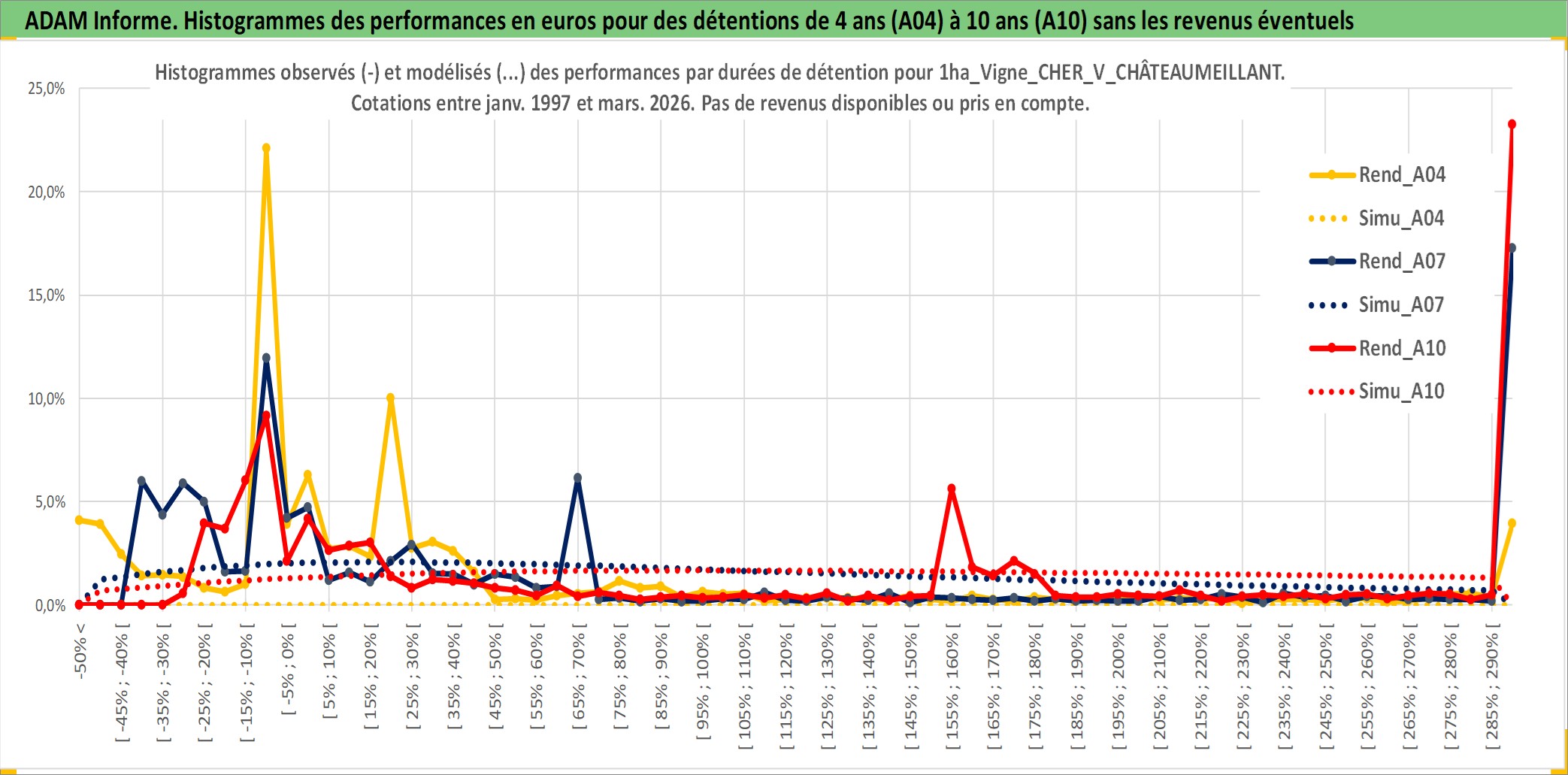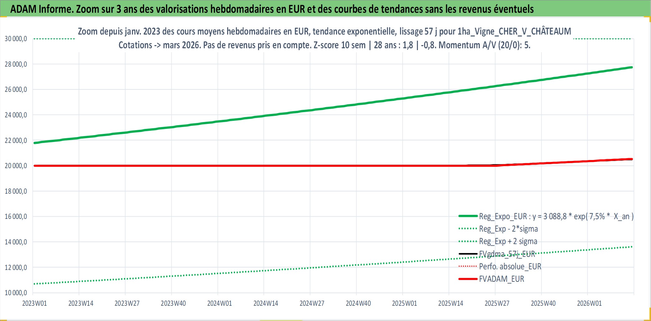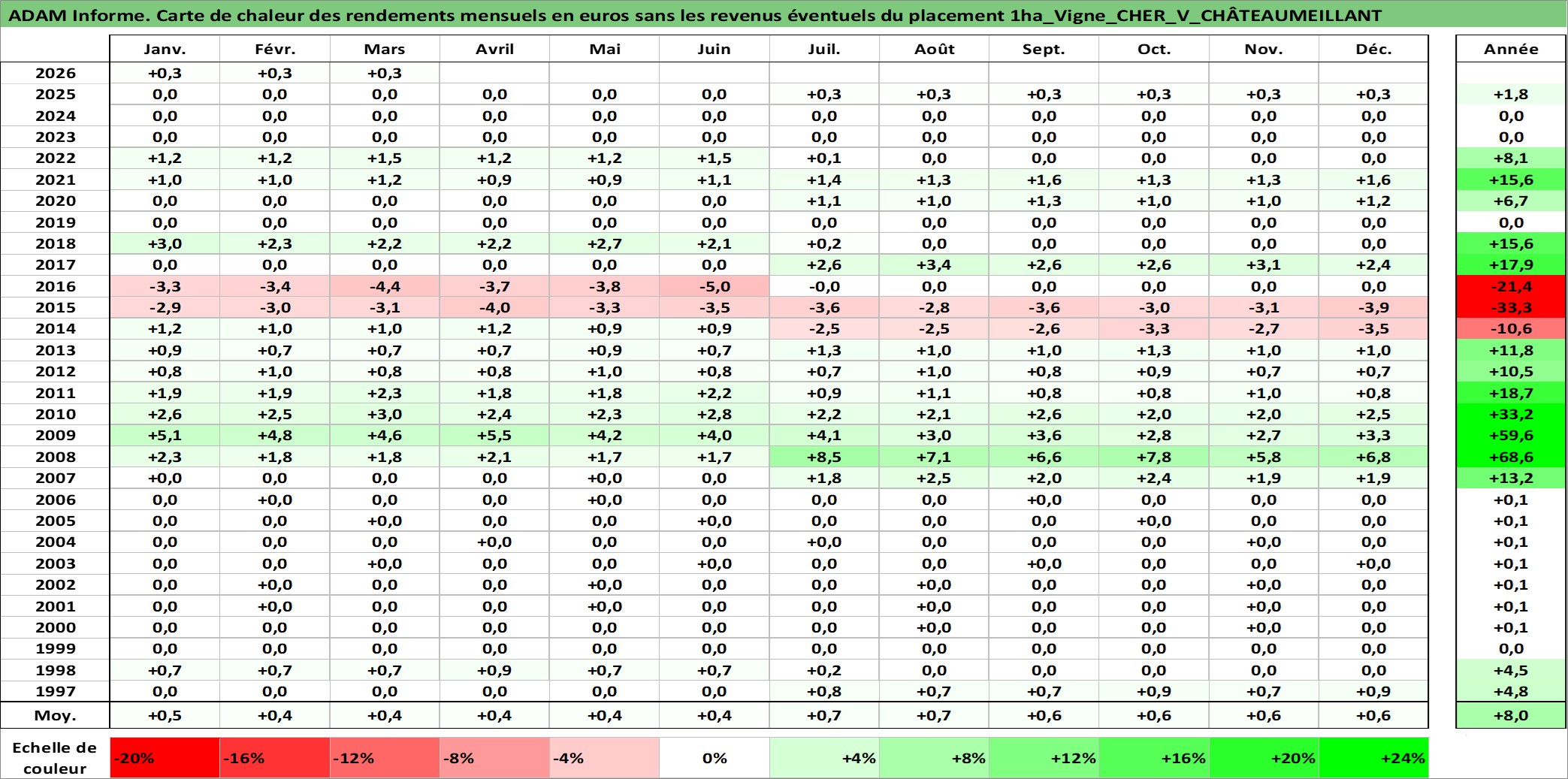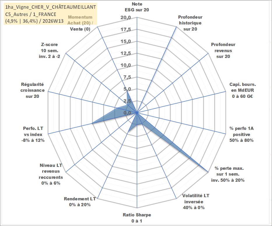 Site dédié aux investisseursPage dédiée sur site financeAnalyse des valorisations hebdomadaires de l'actif 1ha_Vigne_CHER_V_CHÂTEAUMEILLANT. Cet actif est cote en EUR. Les valorisations couvrent les semaines 1997W01 a 2026W13. Les fermages de ce bien foncier sont pris egaux a 2,5% annuels de la valeur venale du bien.
