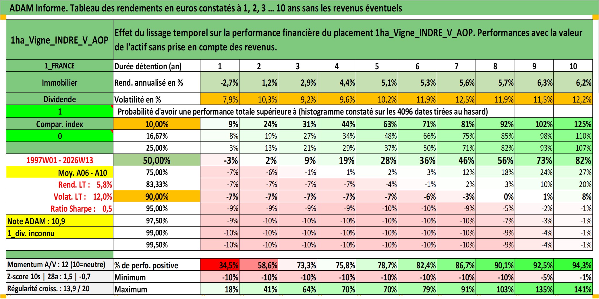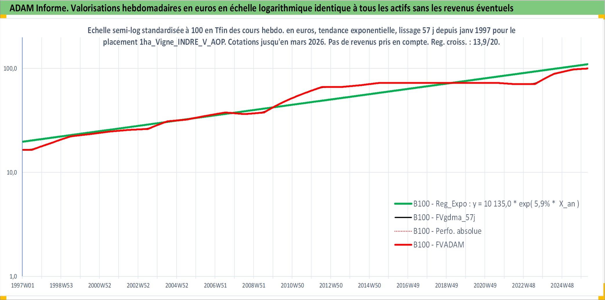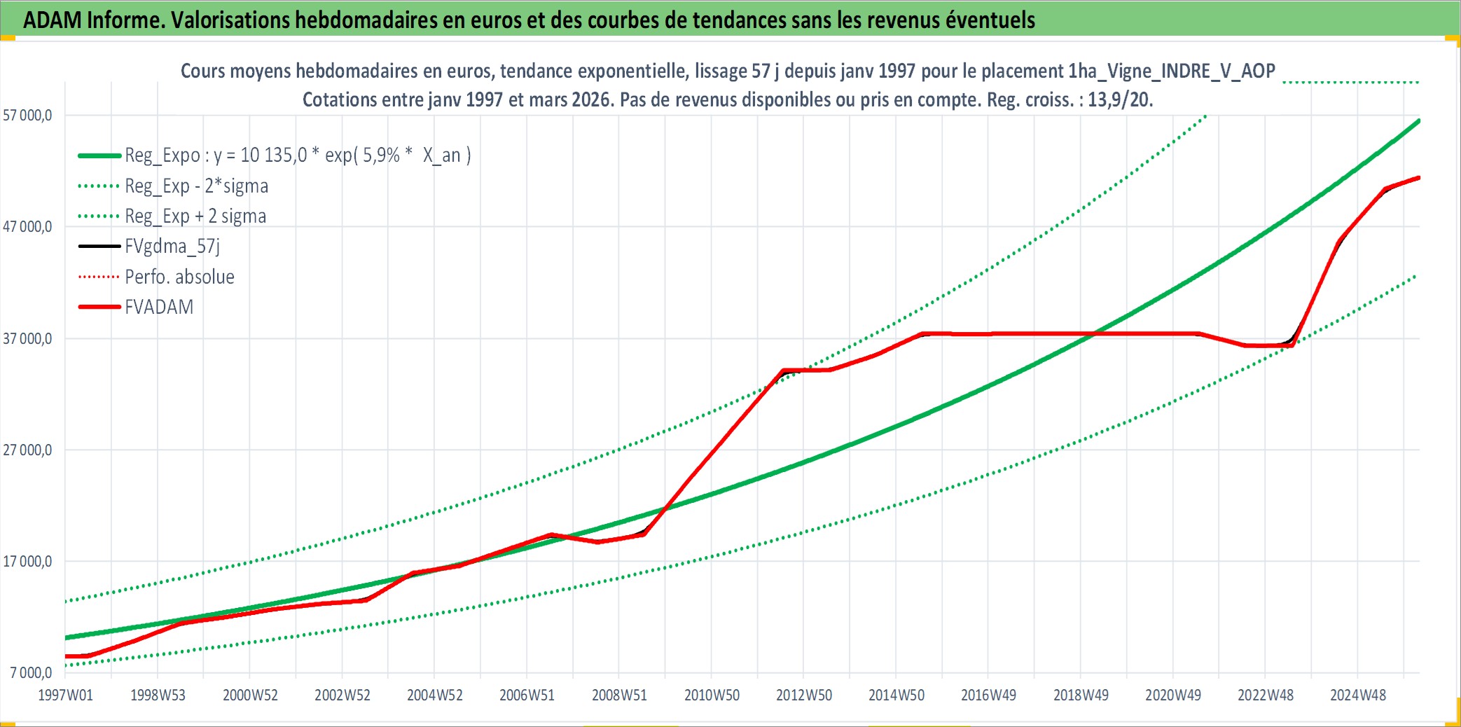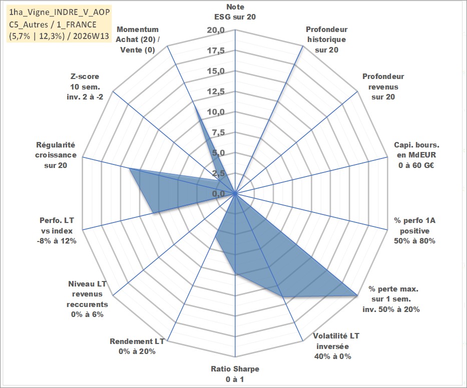 Site dédié aux investisseursPage dédiée sur site financeAnalyse des valorisations hebdomadaires de l'actif 1ha_Vigne_INDRE_V_AOP. Cet actif est cote en EUR. Les valorisations couvrent les semaines 1997W01 a 2026W13. Les fermages de ce bien foncier sont pris egaux a 2,5% annuels de la valeur venale du bien.