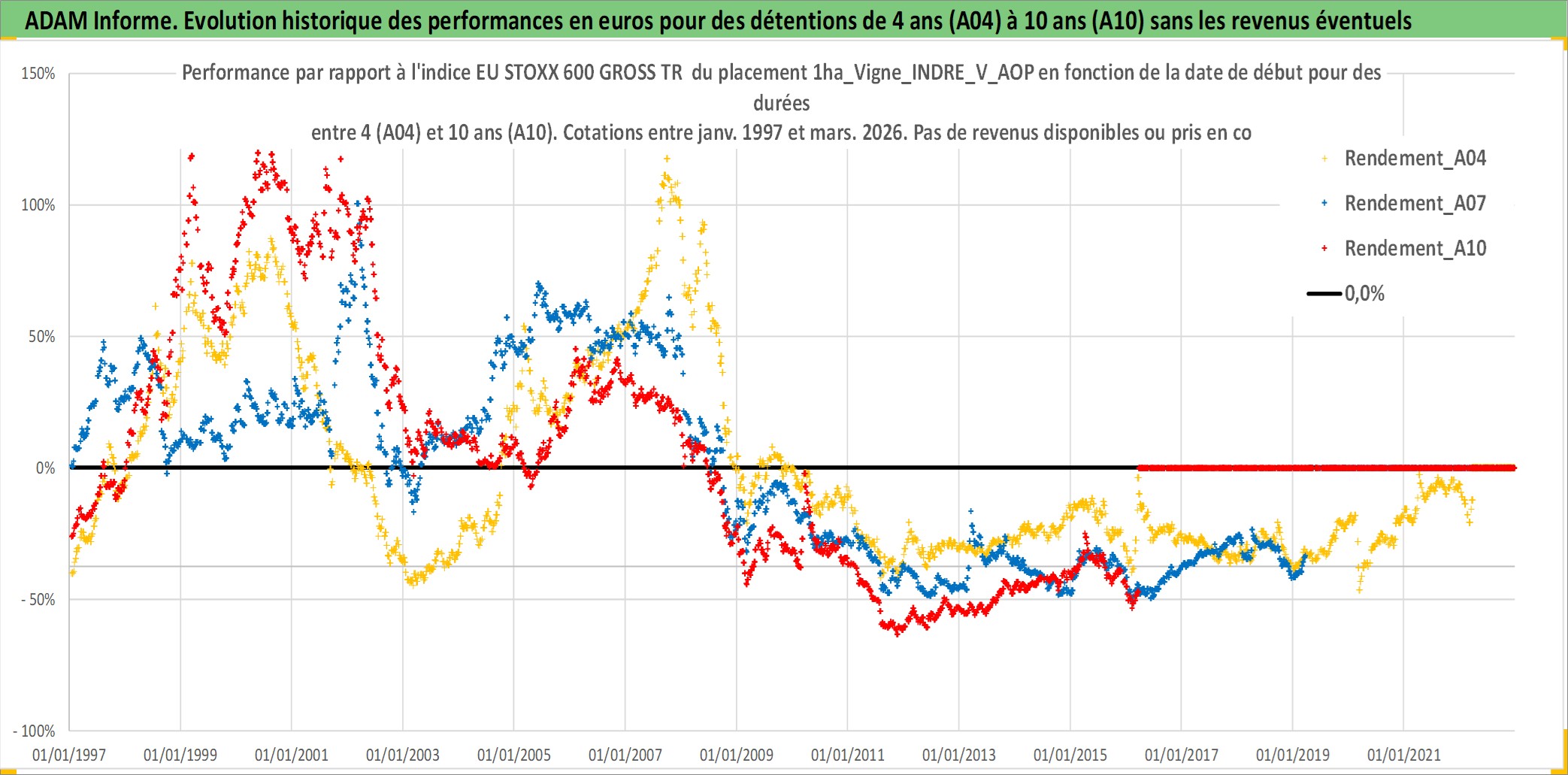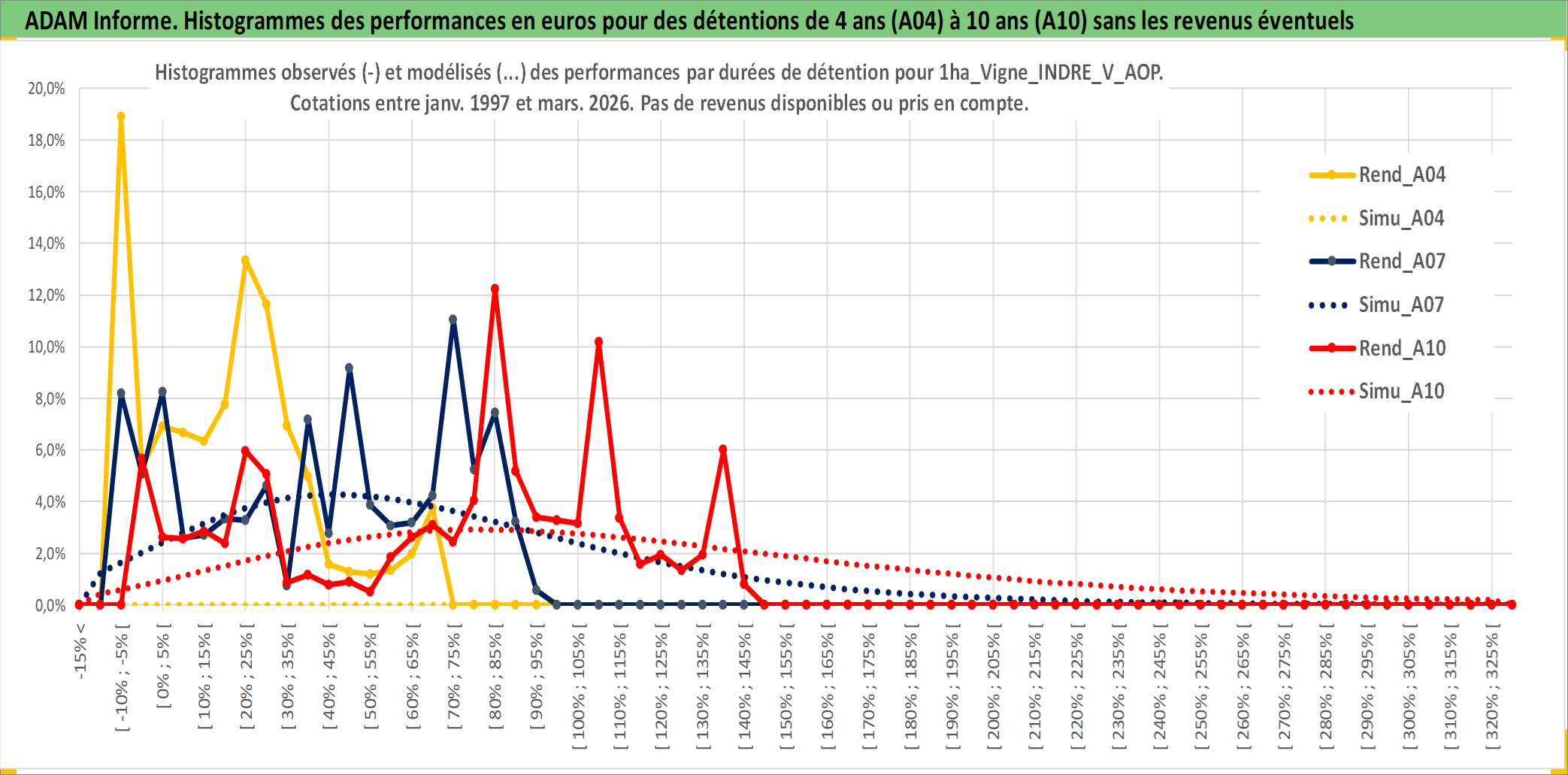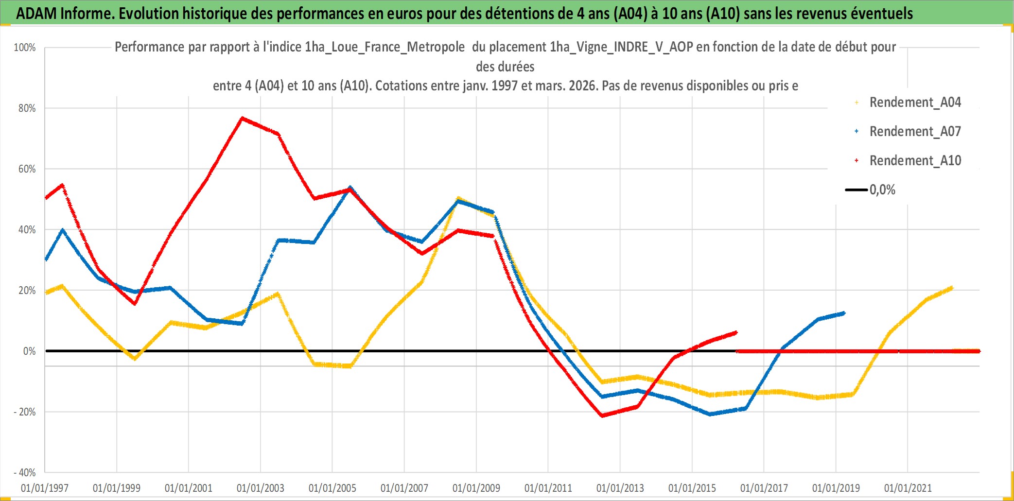 Site dédié aux investisseursPage dédiée sur site financeAnalyse des valorisations hebdomadaires de l'actif 1ha_Vigne_INDRE_V_AOP. Cet actif est cote en EUR. Les valorisations couvrent les semaines 1997W01 a 2026W13. Les fermages de ce bien foncier sont pris egaux a 2,5% annuels de la valeur venale du bien.
