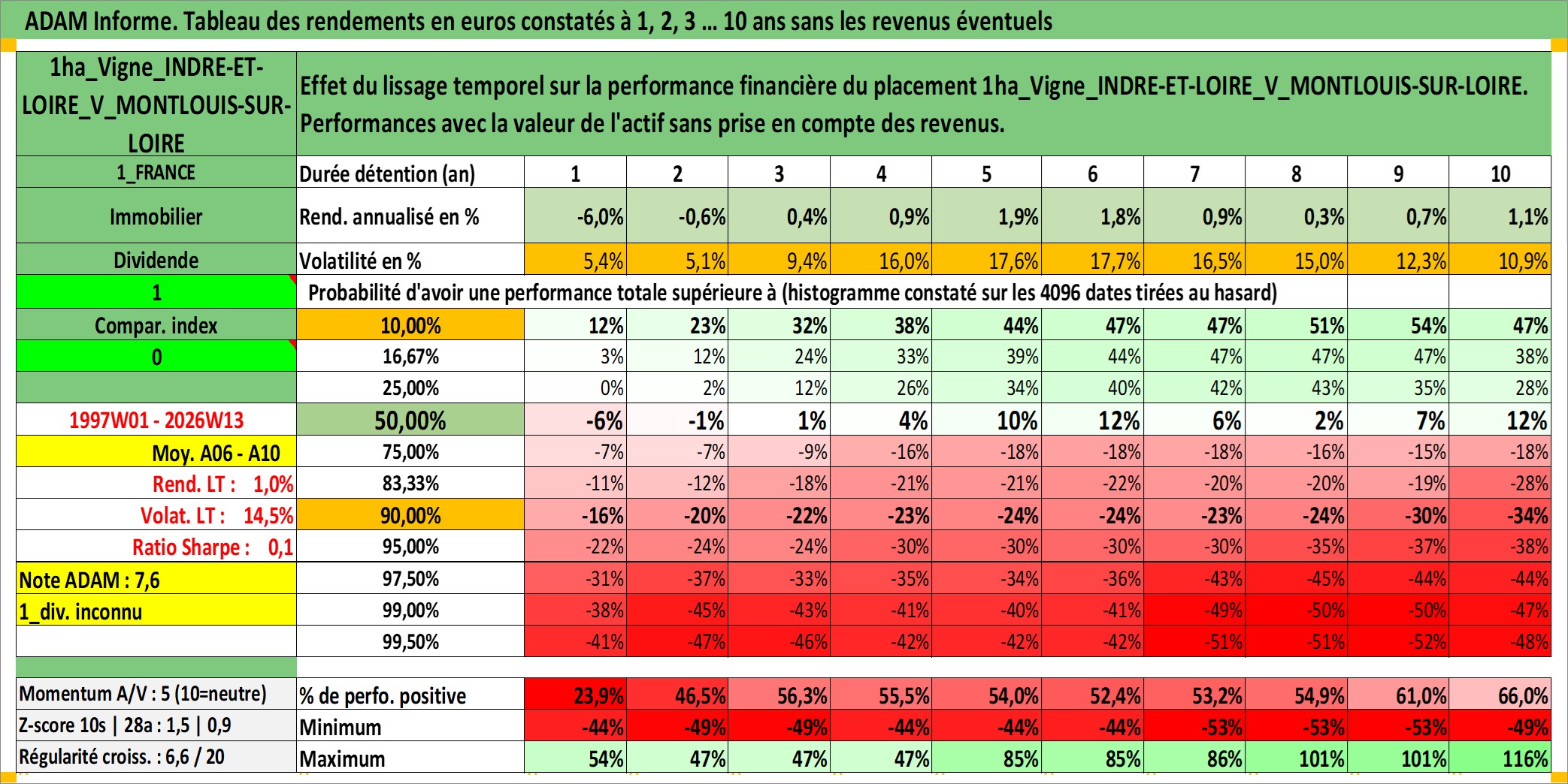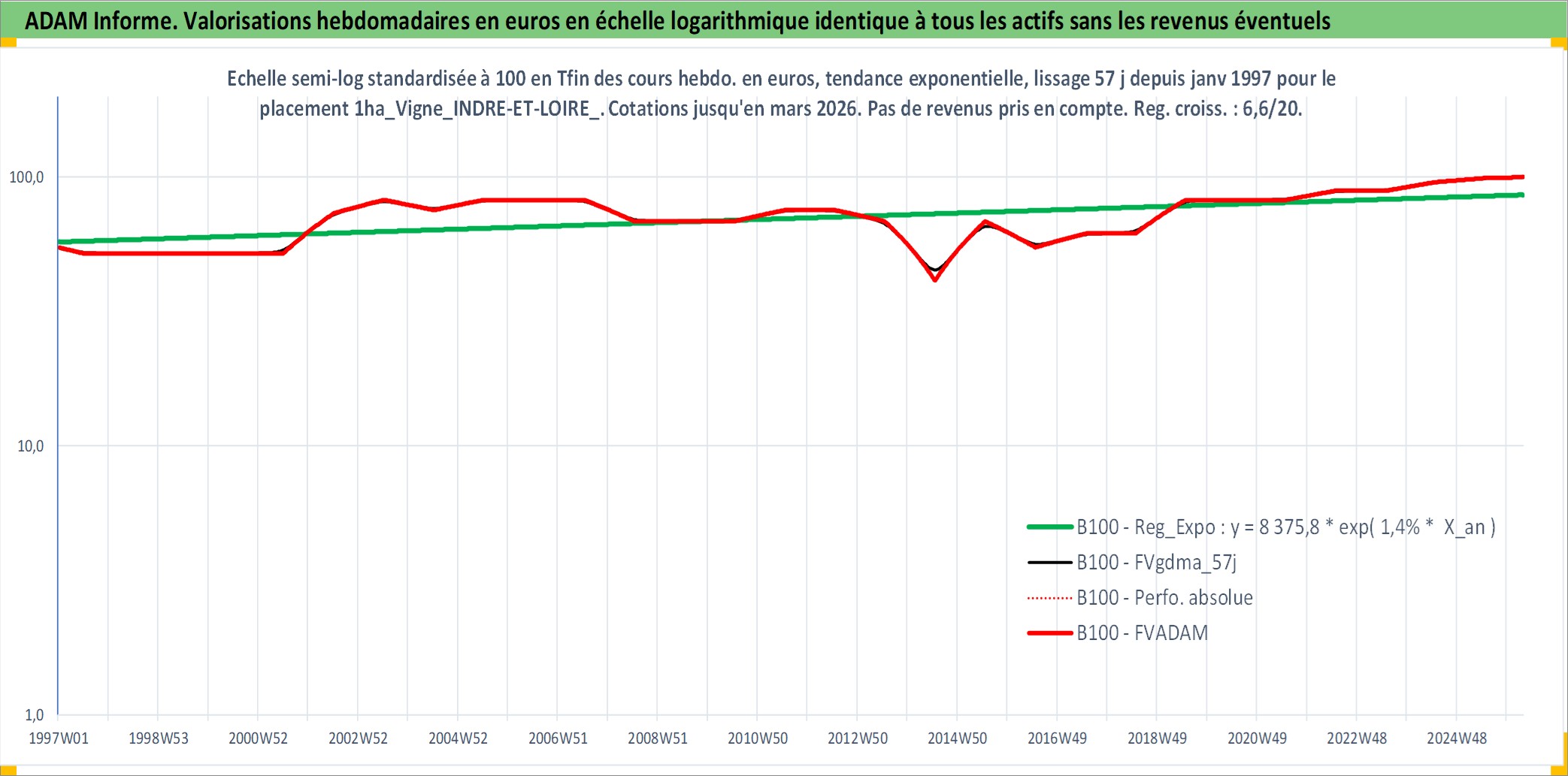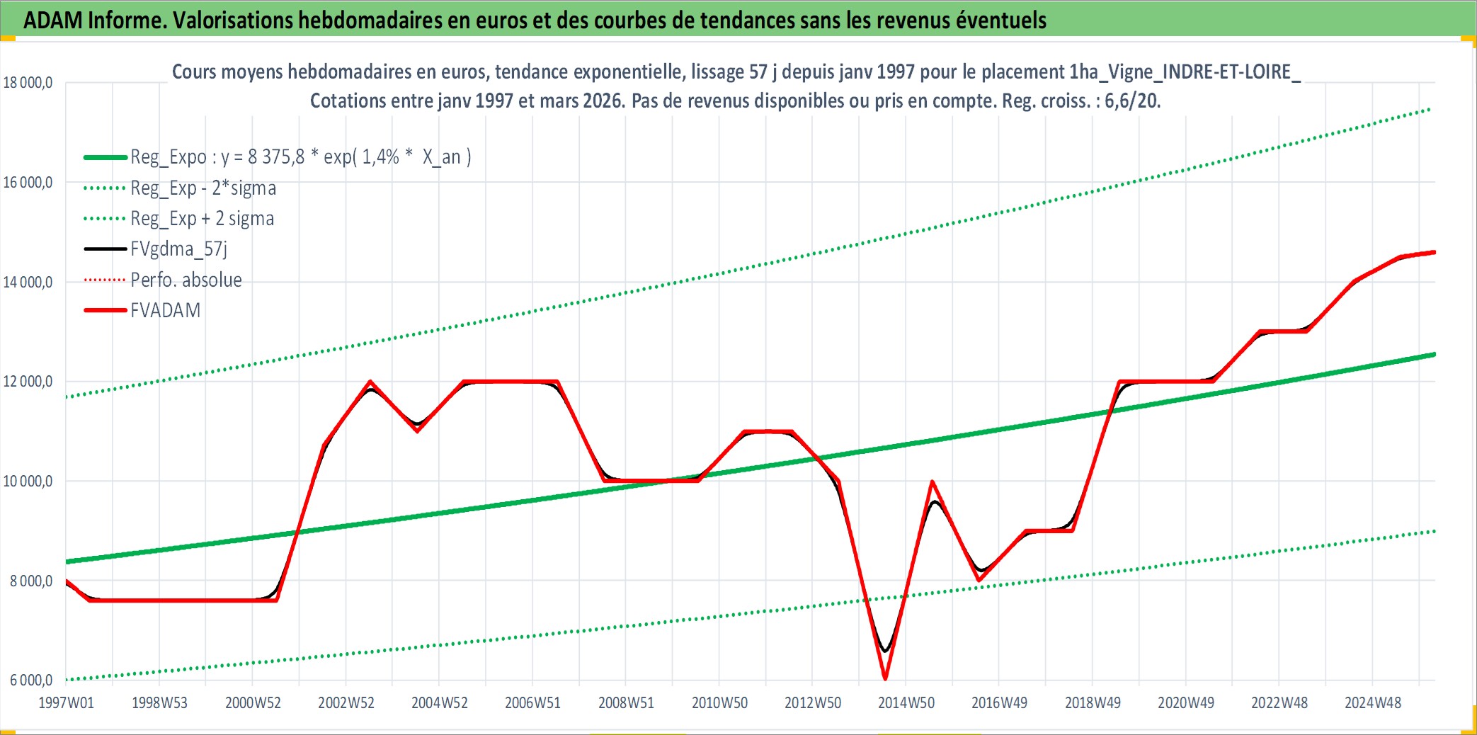 Site dédié aux investisseursPage dédiée sur site financeAnalyse des valorisations hebdomadaires de l'actif 1ha_Vigne_INDRE-ET-LOIRE_V_MONTLOUIS-SUR-LOIRE. Cet actif est cote en EUR. Les valorisations couvrent les semaines 1997W01 a 2026W13. Les fermages de ce bien foncier sont pris egaux a 2,5% annuels de la valeur venale du bien.