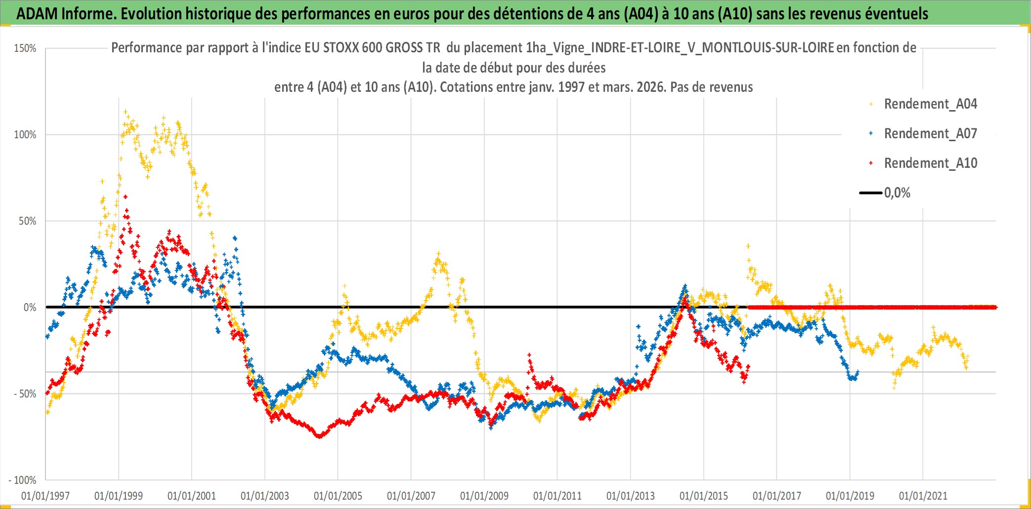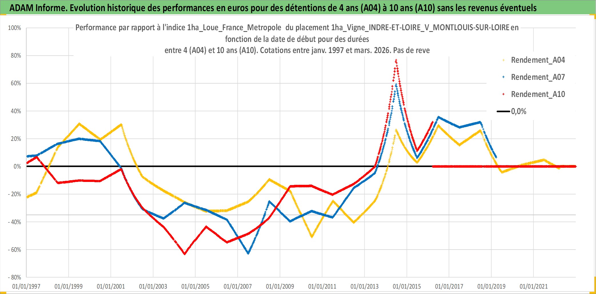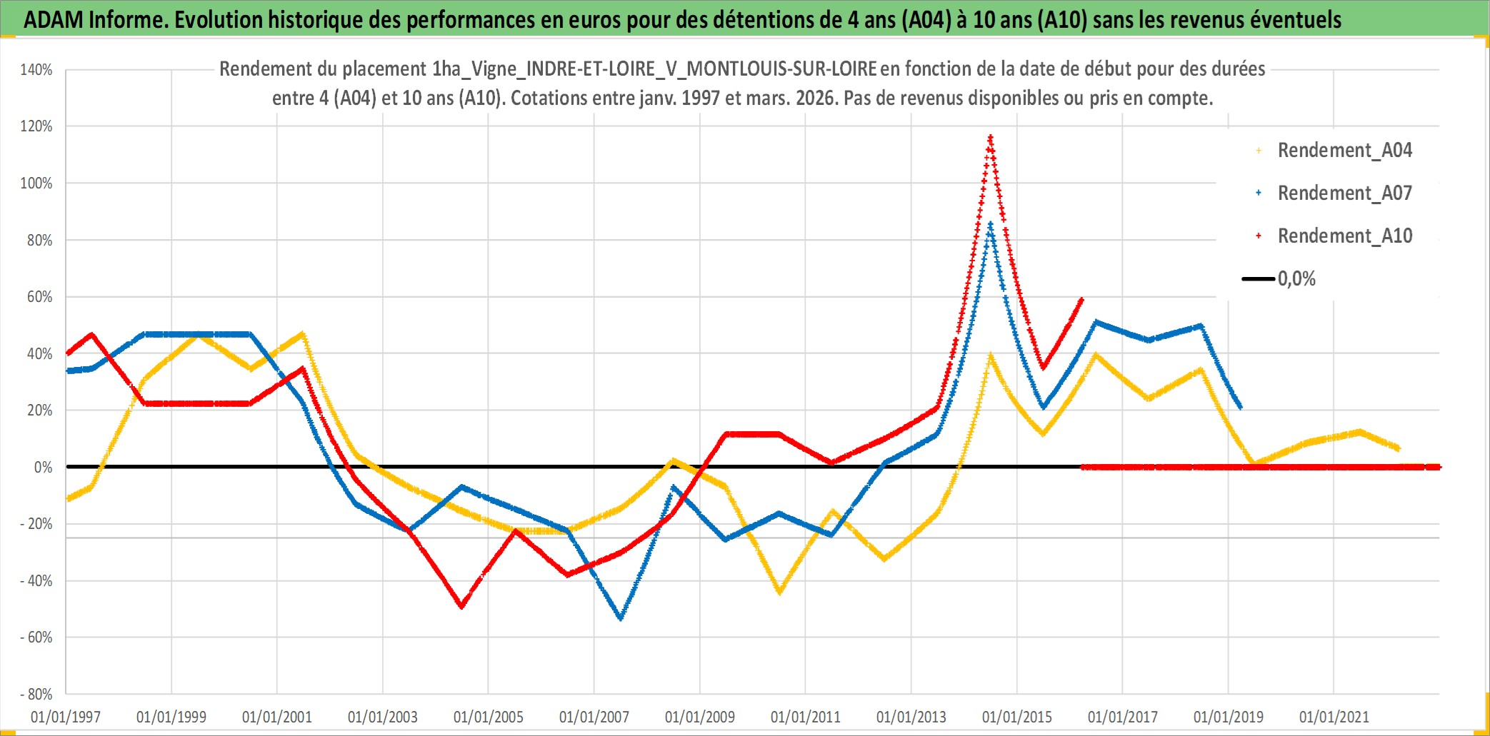 Site dédié aux investisseursPage dédiée sur site financeAnalyse des valorisations hebdomadaires de l'actif 1ha_Vigne_INDRE-ET-LOIRE_V_MONTLOUIS-SUR-LOIRE. Cet actif est cote en EUR. Les valorisations couvrent les semaines 1997W01 a 2026W13. Les fermages de ce bien foncier sont pris egaux a 2,5% annuels de la valeur venale du bien.