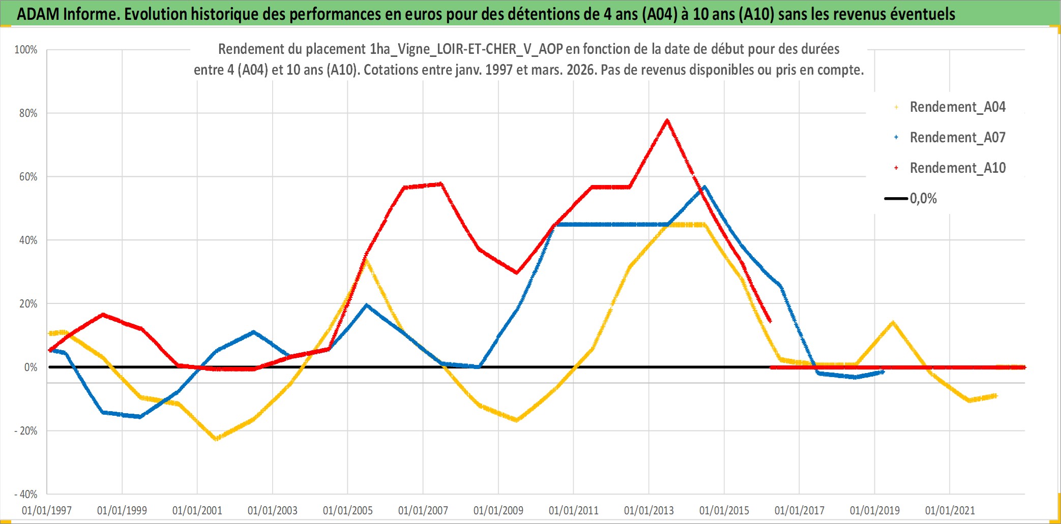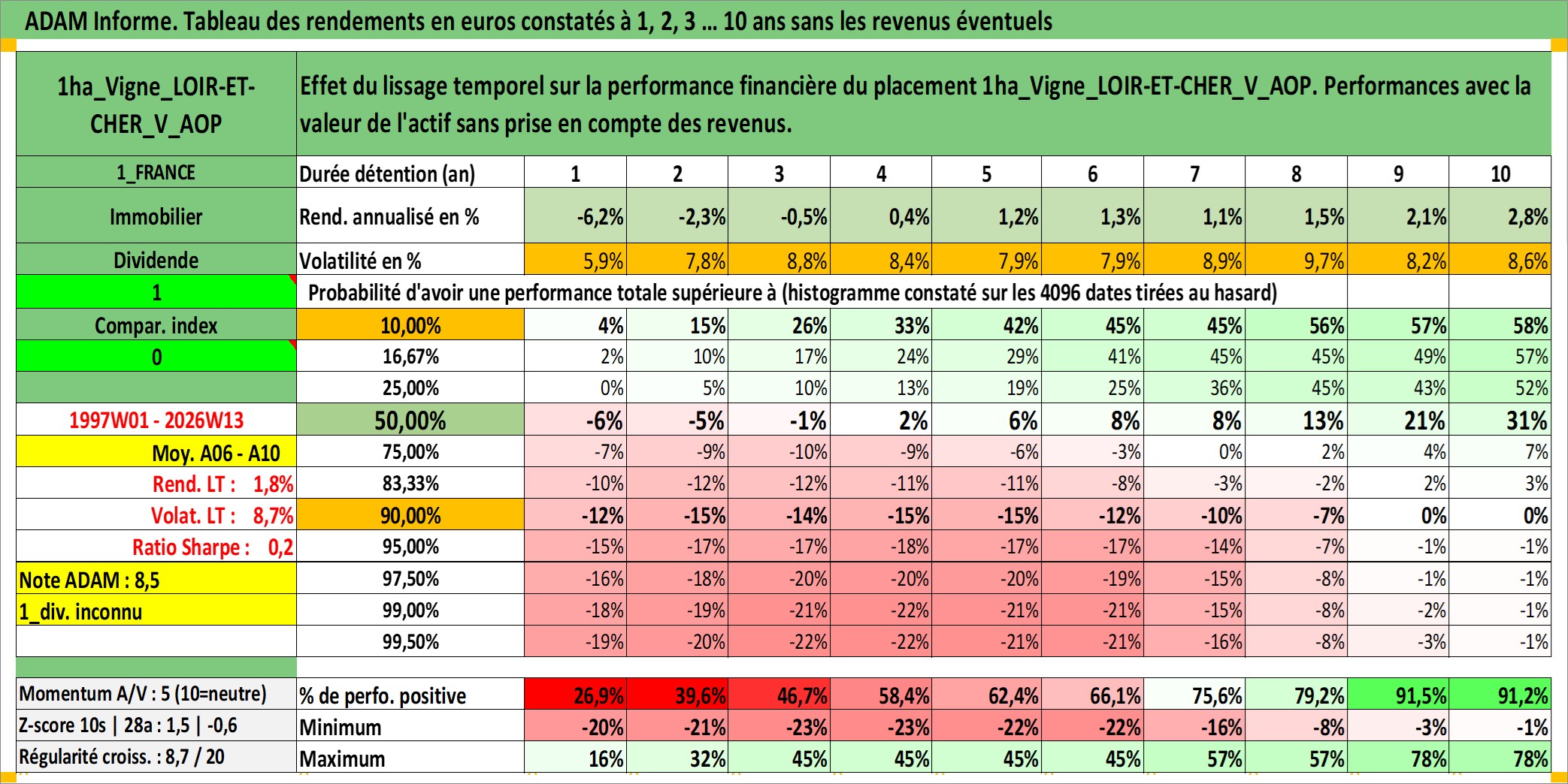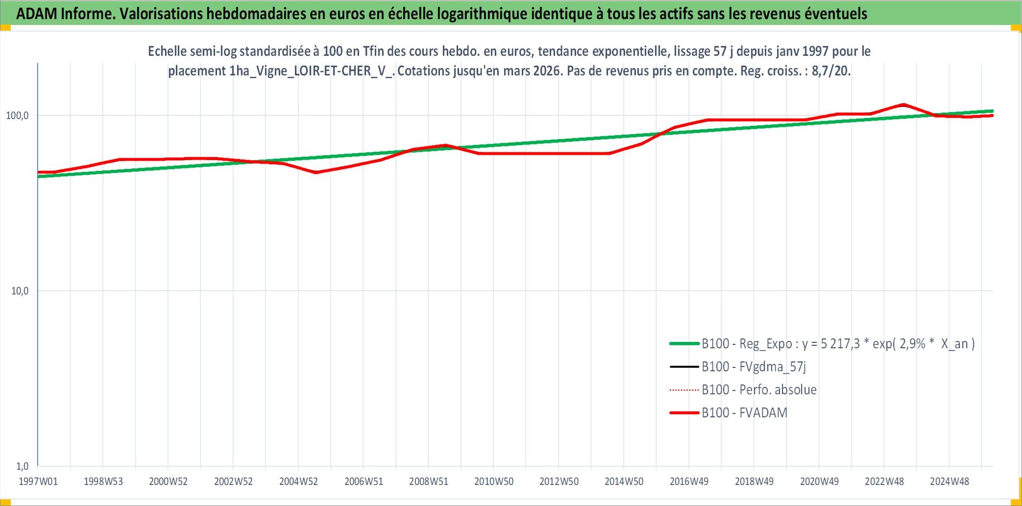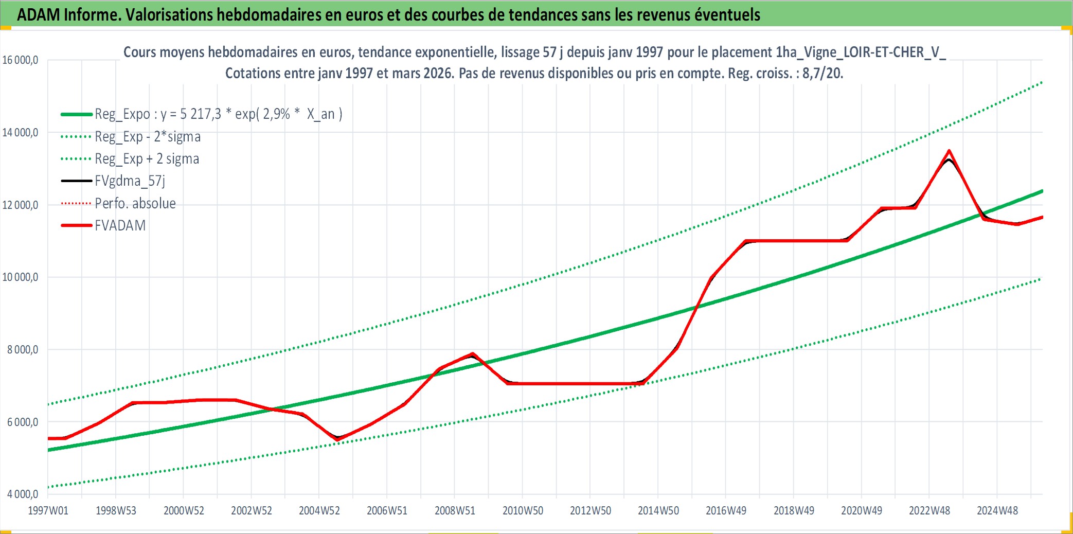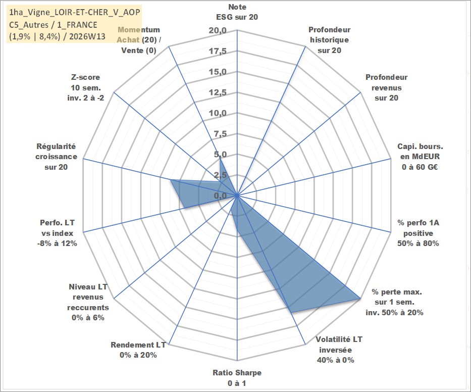 Site dédié aux investisseursPage dédiée sur site financeAnalyse des valorisations hebdomadaires de l'actif 1ha_Vigne_LOIR-ET-CHER_V_AOP. Cet actif est cote en EUR. Les valorisations couvrent les semaines 1997W01 a 2026W13. Les fermages de ce bien foncier sont pris egaux a 2,5% annuels de la valeur venale du bien.