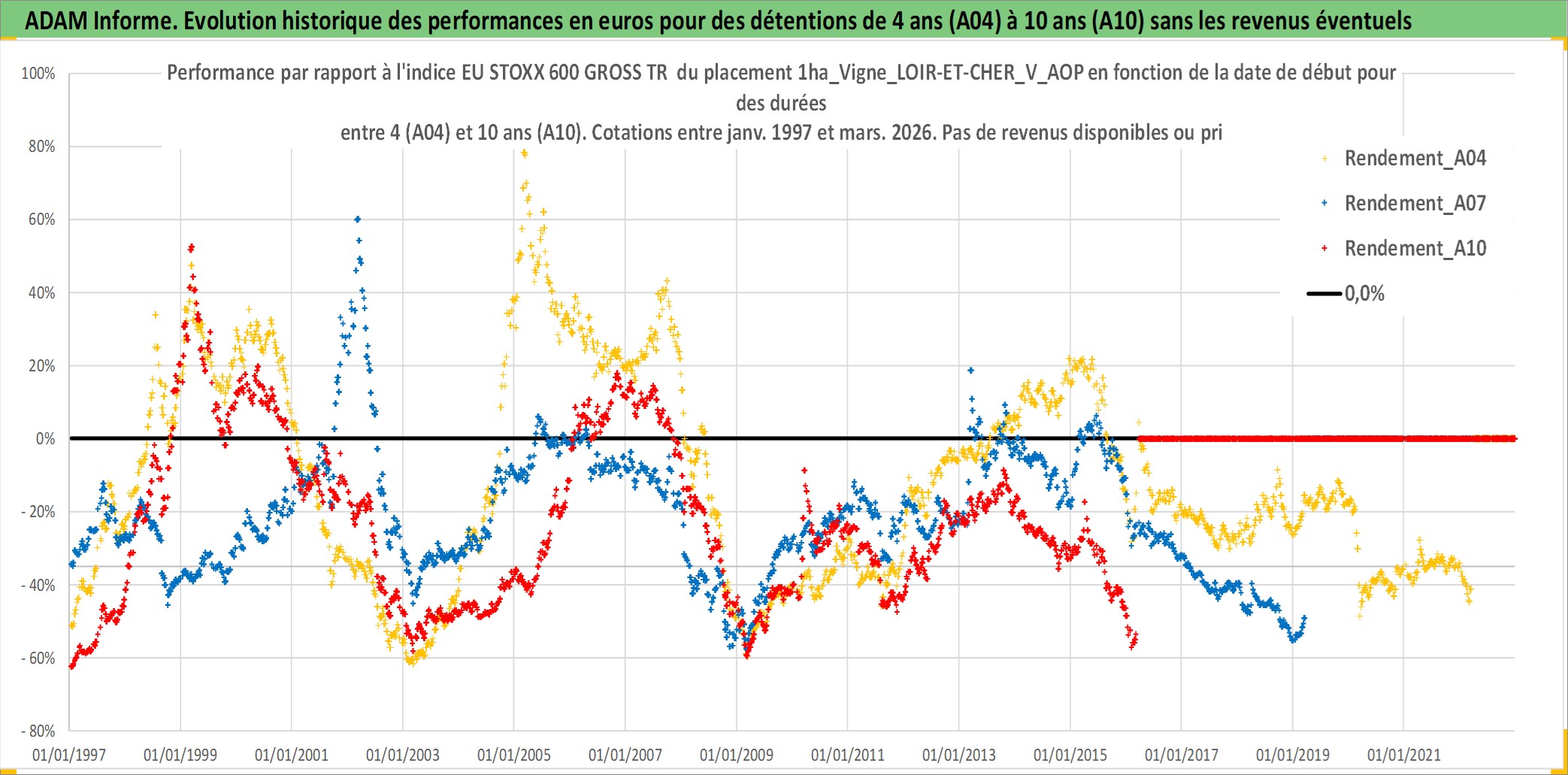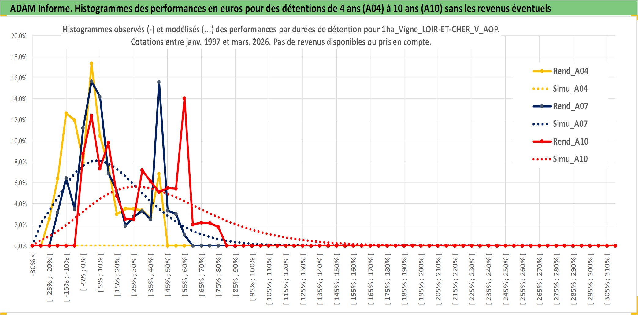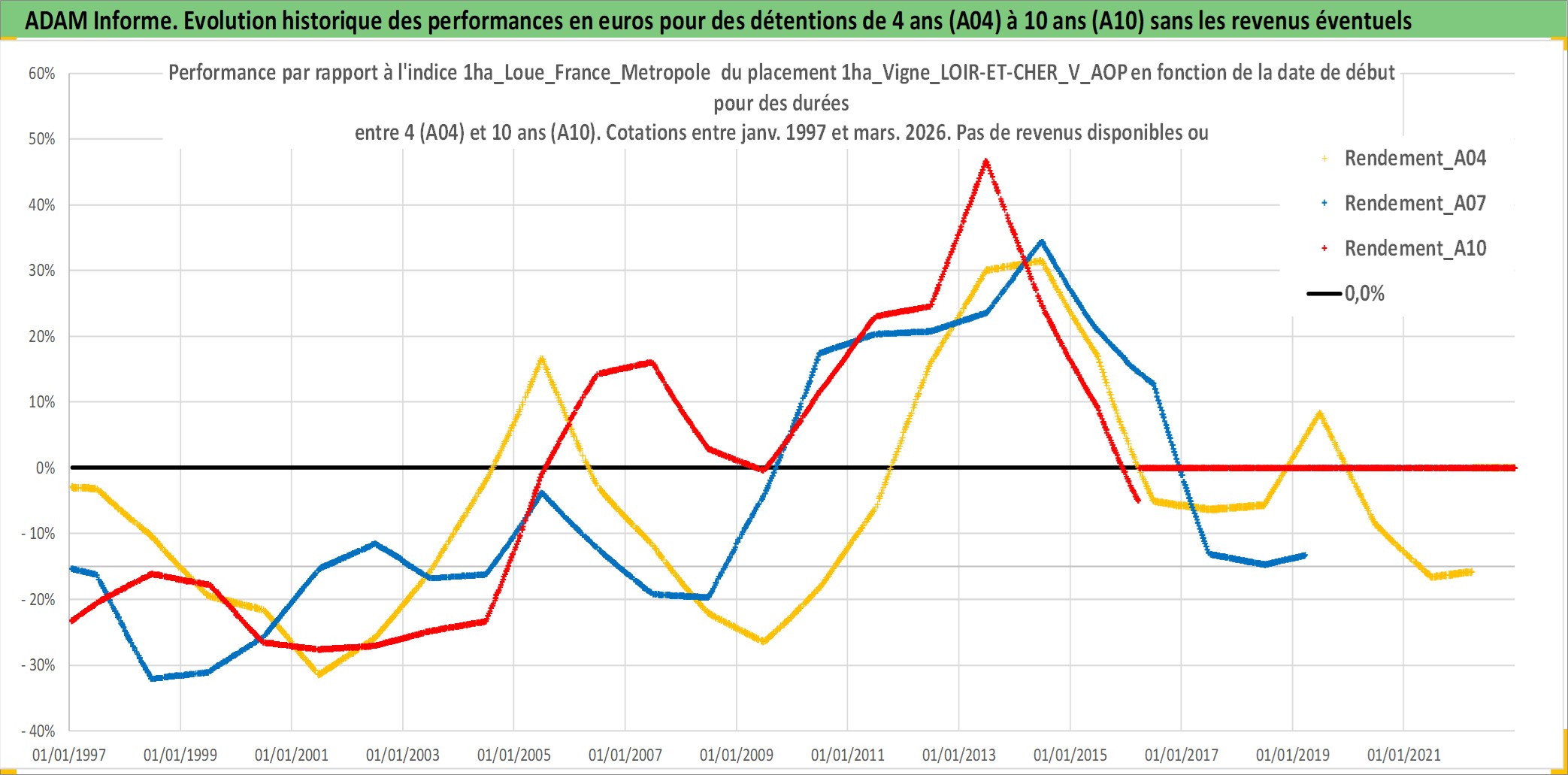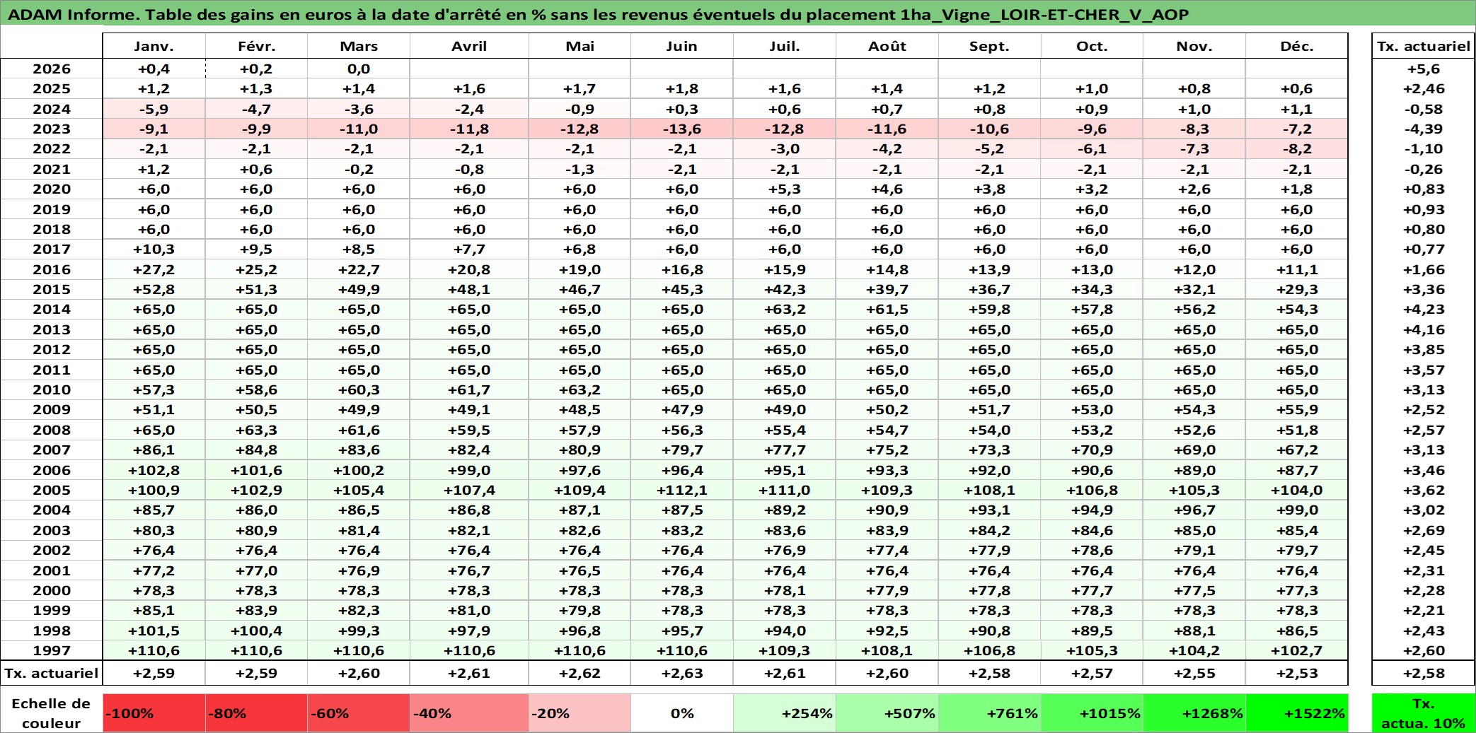 Site dédié aux investisseursPage dédiée sur site financeAnalyse des valorisations hebdomadaires de l'actif 1ha_Vigne_LOIR-ET-CHER_V_AOP. Cet actif est cote en EUR. Les valorisations couvrent les semaines 1997W01 a 2026W13. Les fermages de ce bien foncier sont pris egaux a 2,5% annuels de la valeur venale du bien.