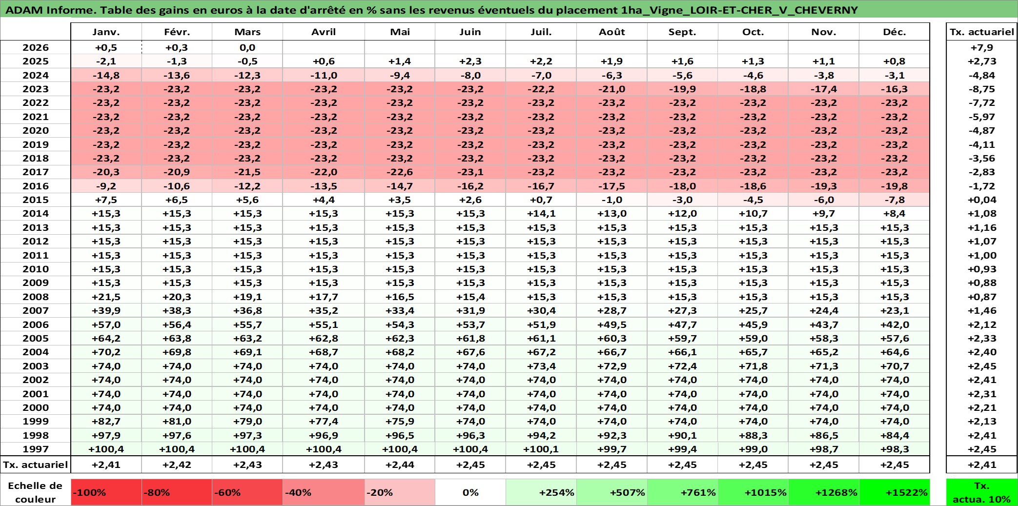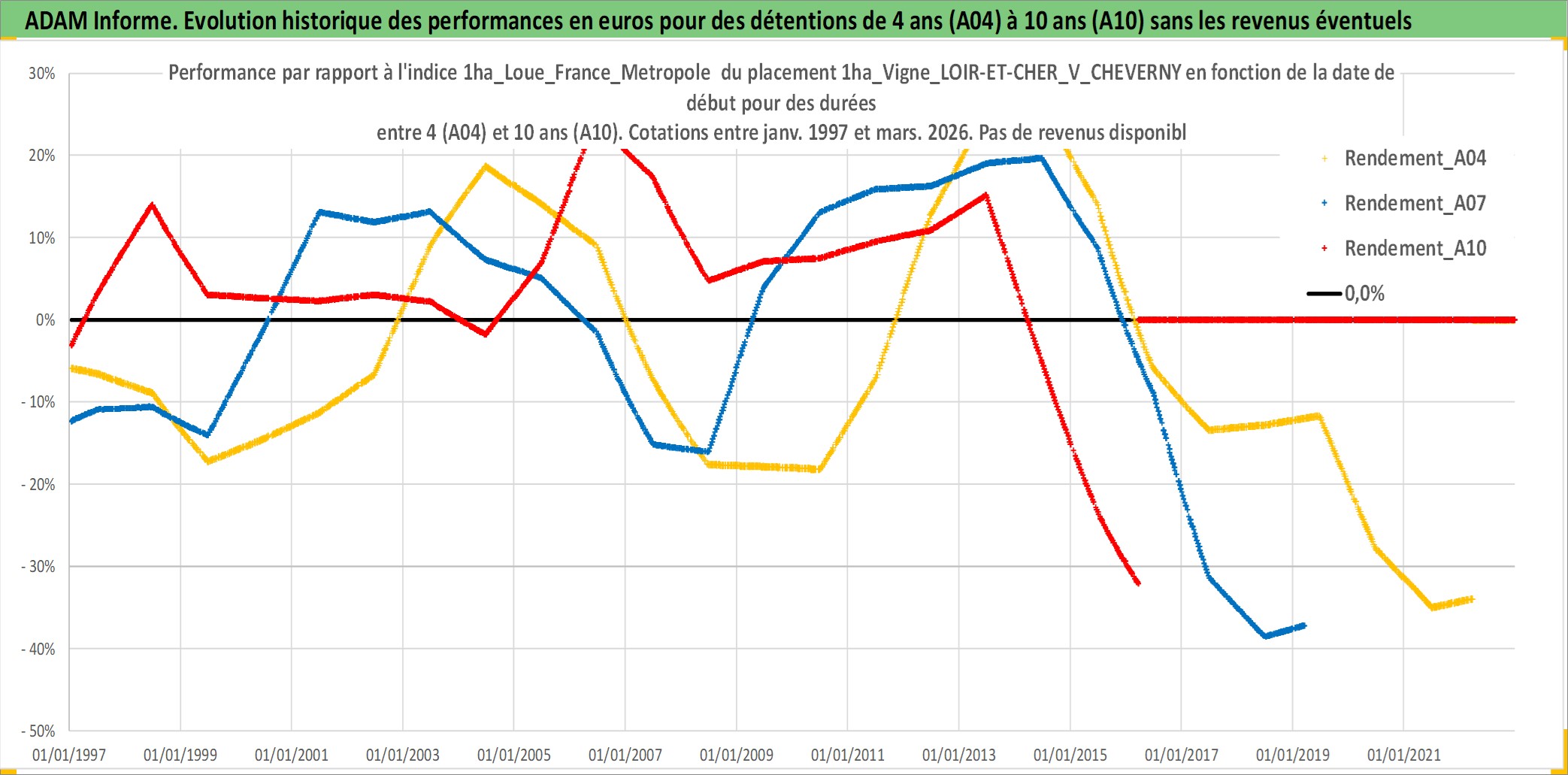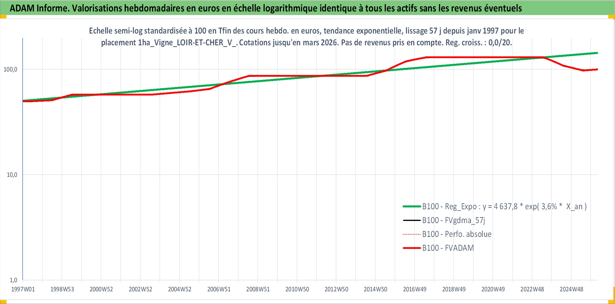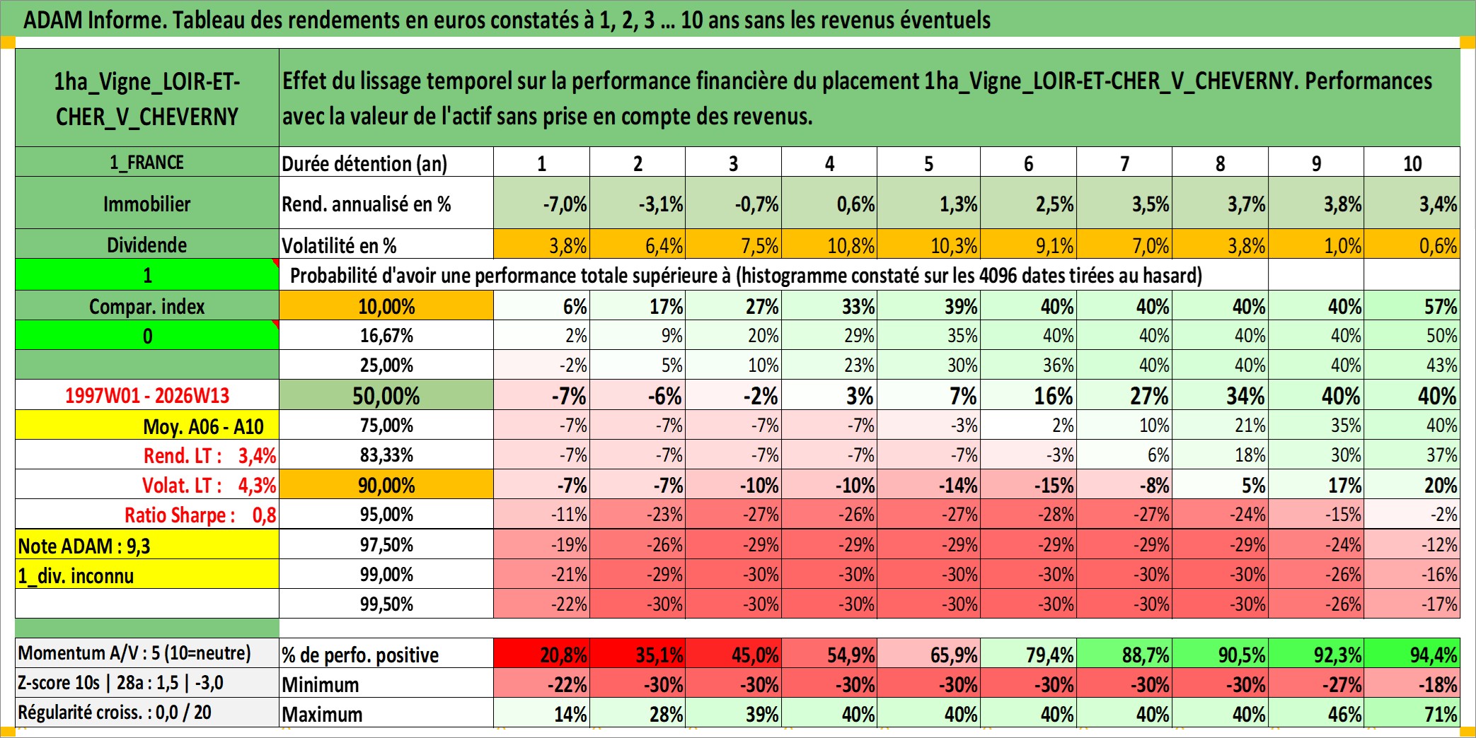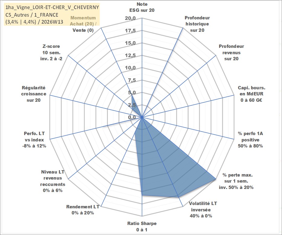 Site dédié aux investisseursPage dédiée sur site financeAnalyse des valorisations hebdomadaires de l'actif 1ha_Vigne_LOIR-ET-CHER_V_CHEVERNY. Cet actif est cote en EUR. Les valorisations couvrent les semaines 1997W01 a 2026W13. Les fermages de ce bien foncier sont pris egaux a 2,5% annuels de la valeur venale du bien.