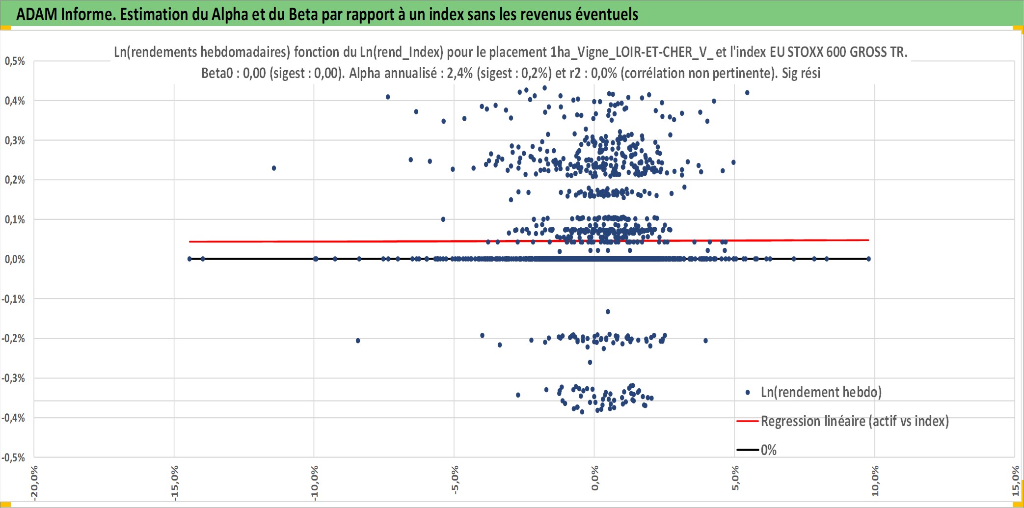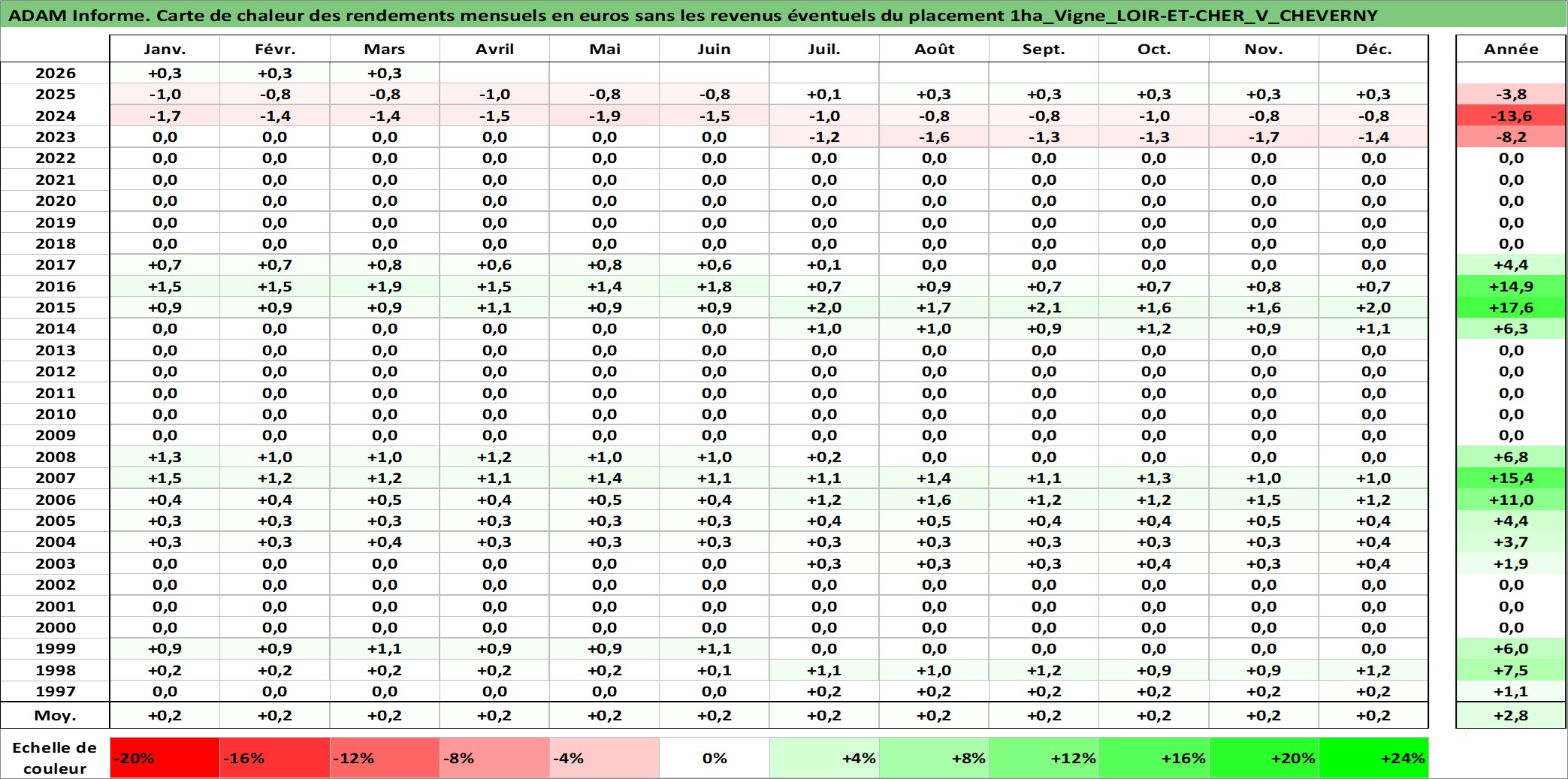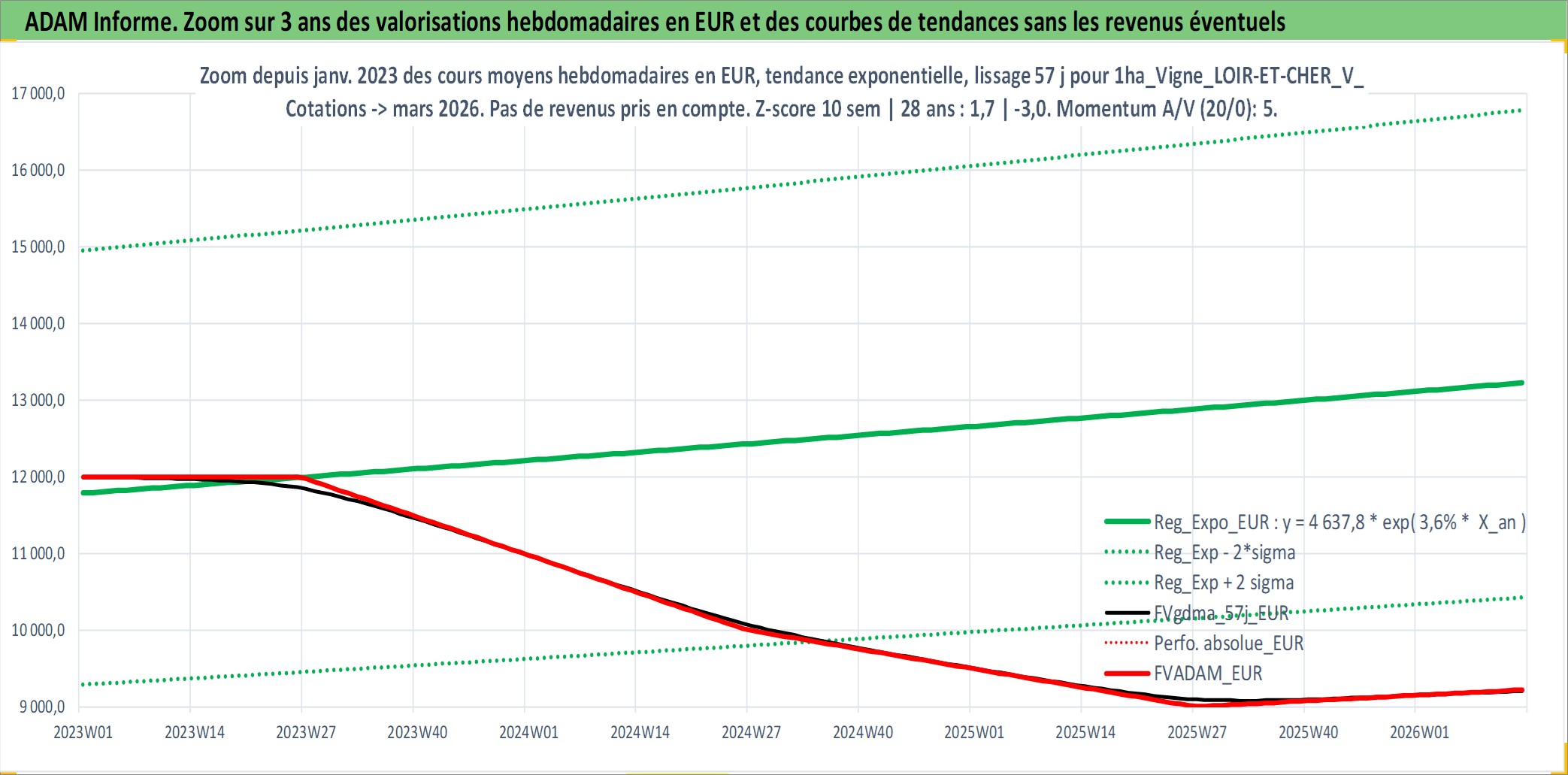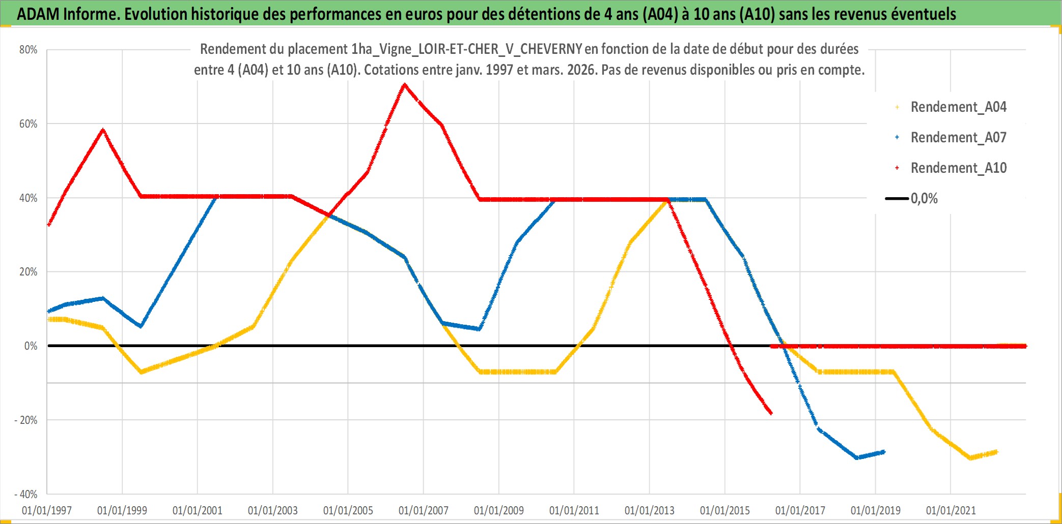 Site dédié aux investisseursPage dédiée sur site financeAnalyse des valorisations hebdomadaires de l'actif 1ha_Vigne_LOIR-ET-CHER_V_CHEVERNY. Cet actif est cote en EUR. Les valorisations couvrent les semaines 1997W01 a 2026W13. Les fermages de ce bien foncier sont pris egaux a 2,5% annuels de la valeur venale du bien.