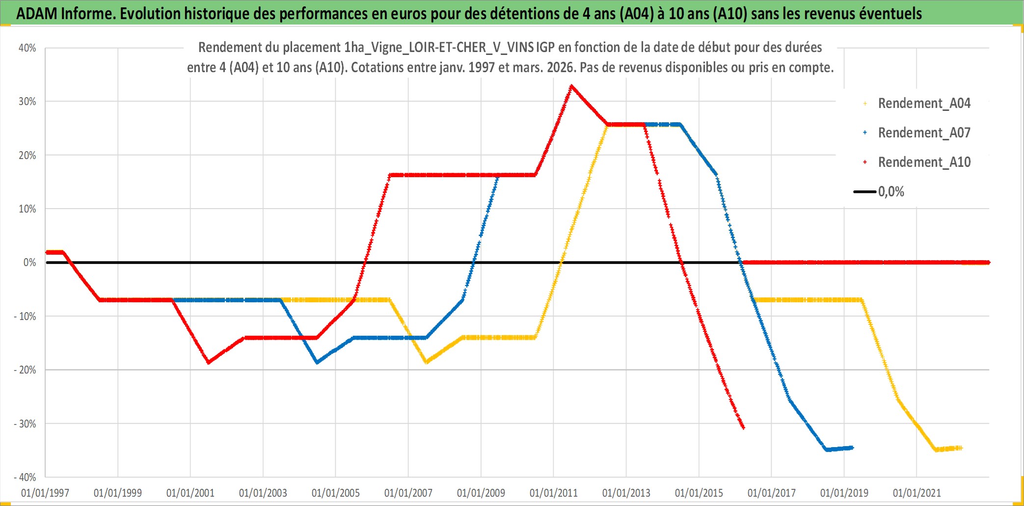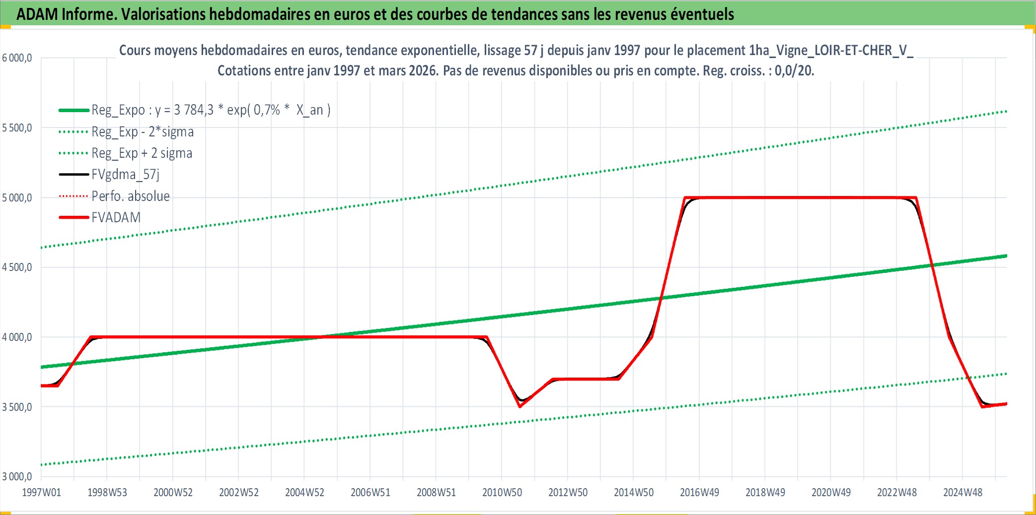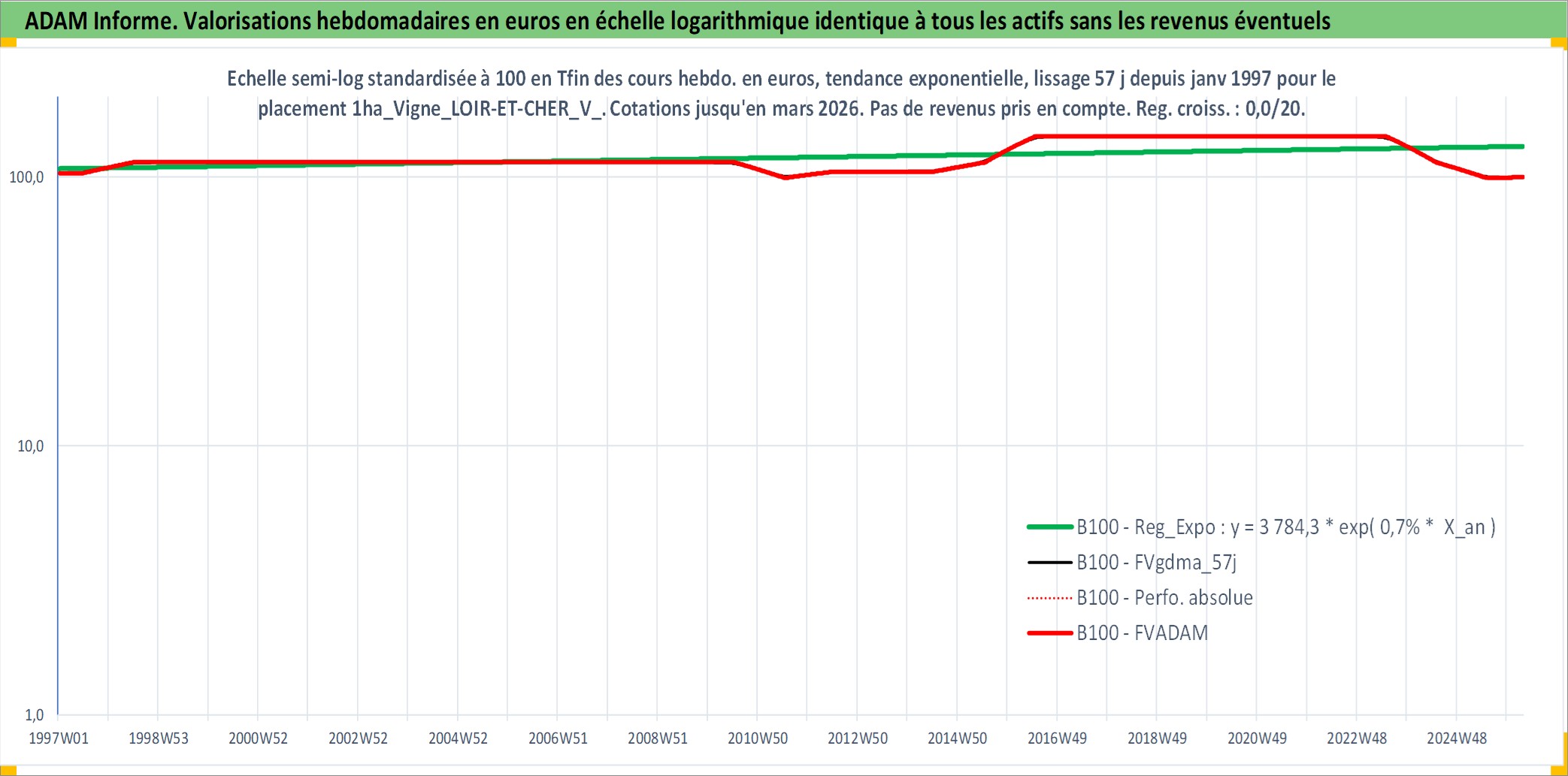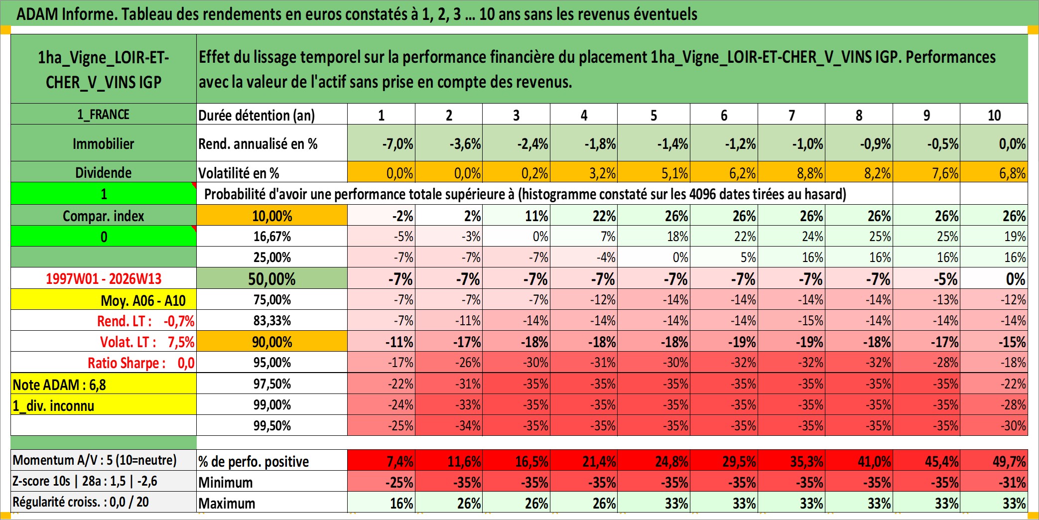 Site dédié aux investisseursPage dédiée sur site financeAnalyse des valorisations hebdomadaires de l'actif 1ha_Vigne_LOIR-ET-CHER_V_VINS IGP. Cet actif est cote en EUR. Les valorisations couvrent les semaines 1997W01 a 2026W13. Les fermages de ce bien foncier sont pris egaux a 2,5% annuels de la valeur venale du bien.