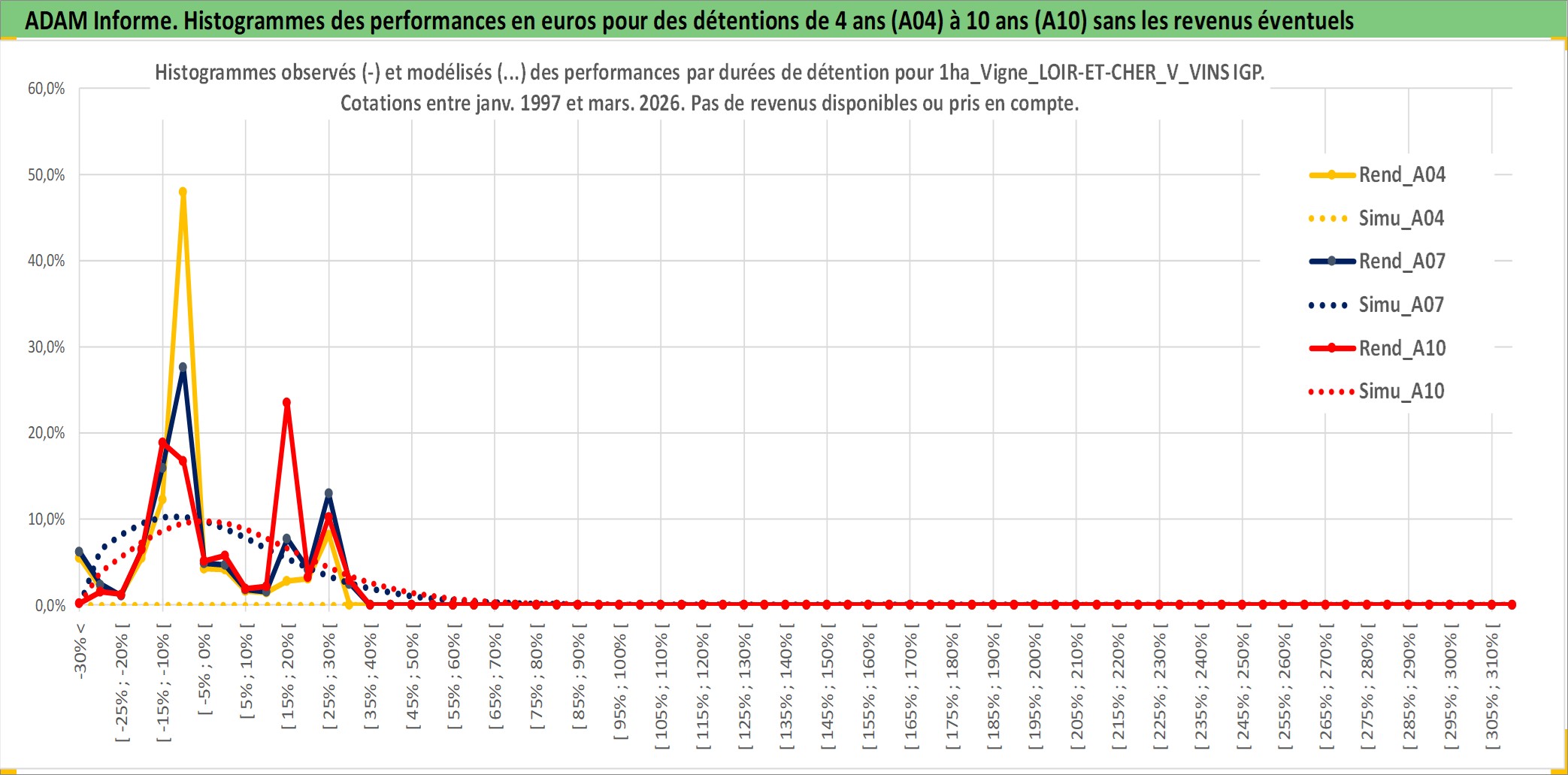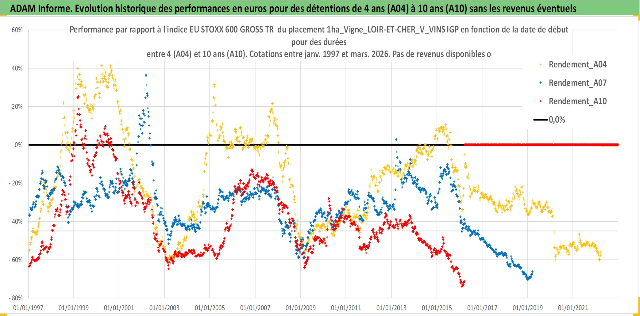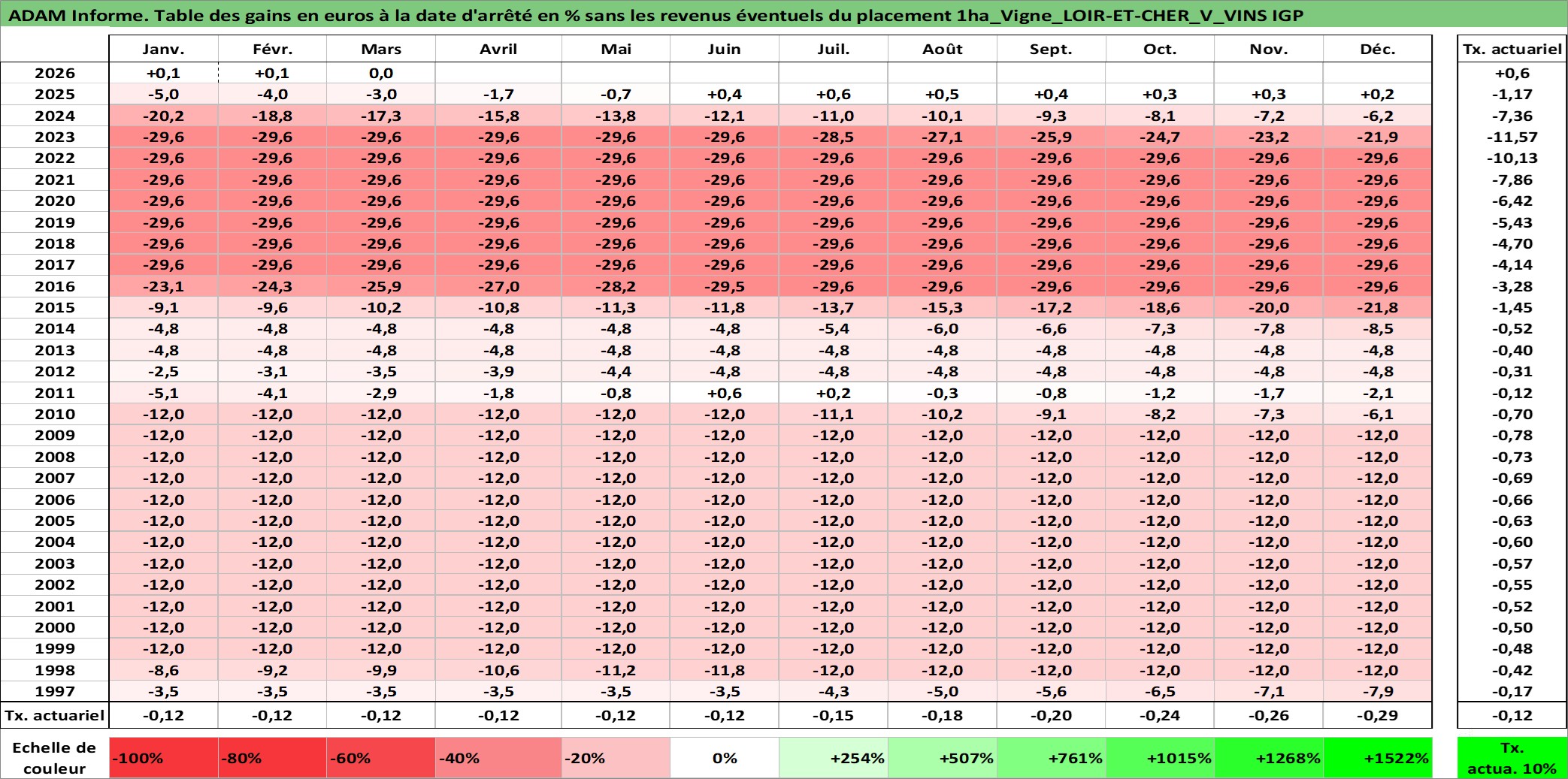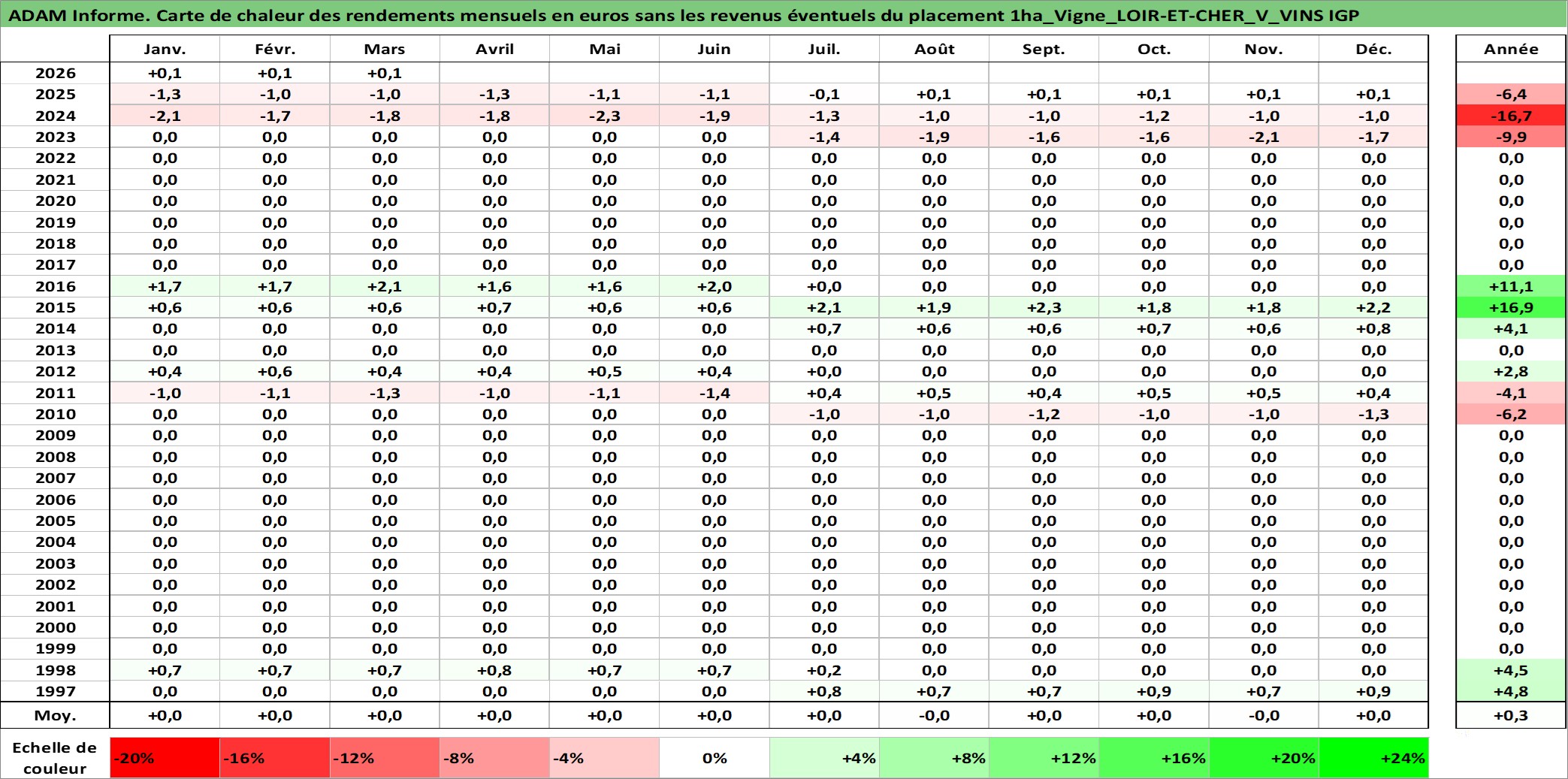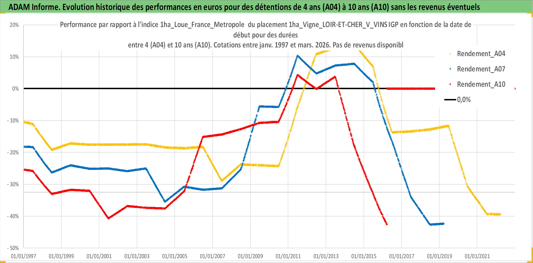 Site dédié aux investisseursPage dédiée sur site financeAnalyse des valorisations hebdomadaires de l'actif 1ha_Vigne_LOIR-ET-CHER_V_VINS IGP. Cet actif est cote en EUR. Les valorisations couvrent les semaines 1997W01 a 2026W13. Les fermages de ce bien foncier sont pris egaux a 2,5% annuels de la valeur venale du bien.