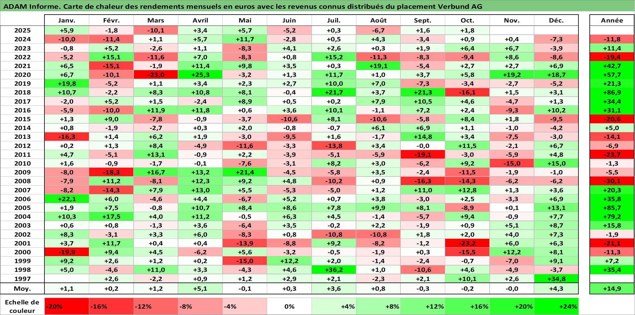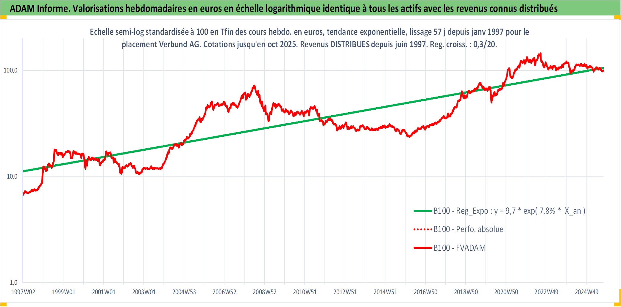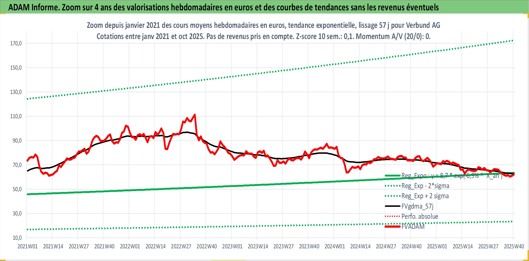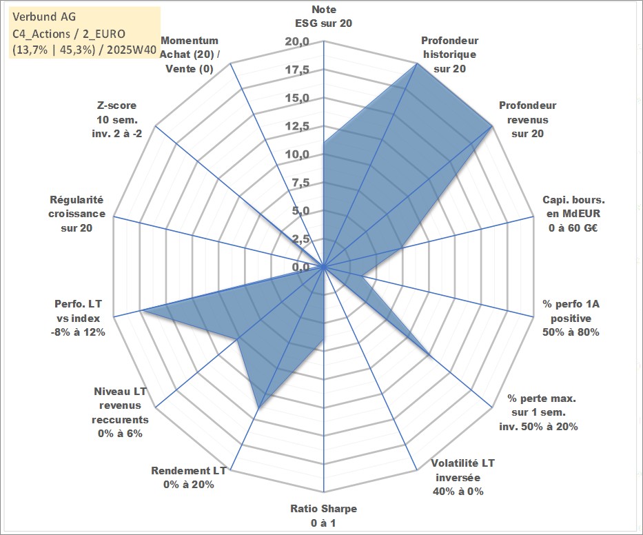 Site dédié aux investisseursPage dédiée sur site financeAnalyse des valorisations hebdomadaires de l'action Verbund AG. Cet actif est cote en EUR. Les valorisations couvrent les semaines 1997W01 a 2025W40. Les revenus de cet actif financier sont pris en compte depuis la semaine 1997W24. La note globale ESG de cet actif est estimee a 11.0 (apres rebasage entre 0 et 20).