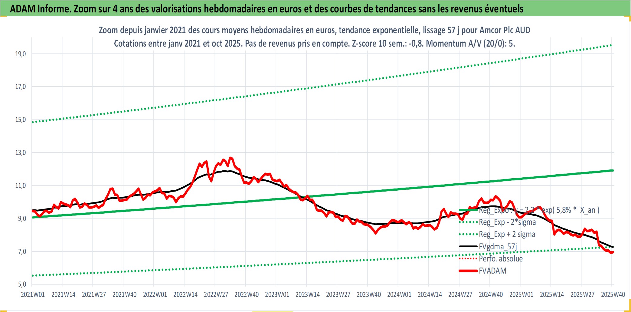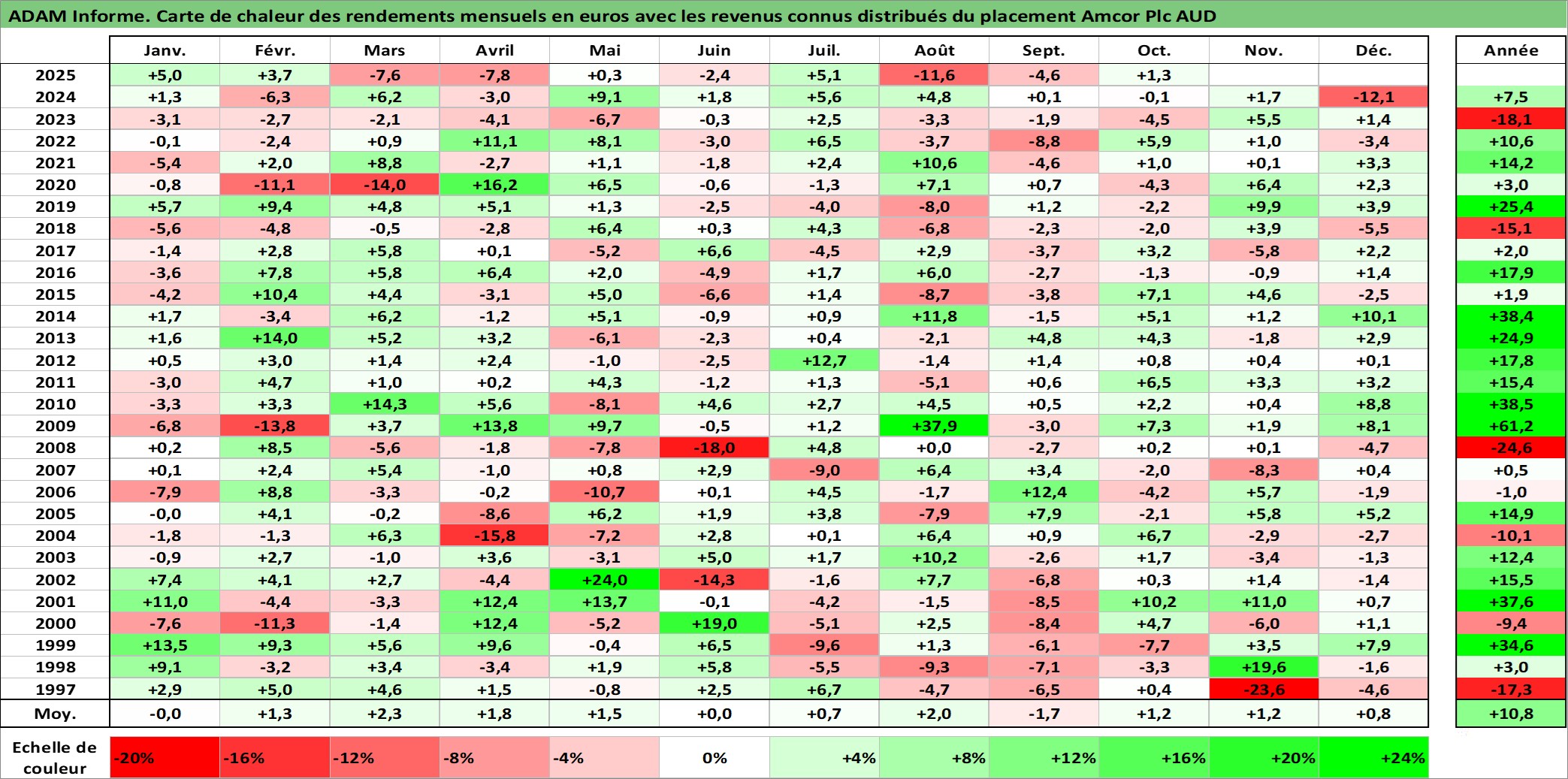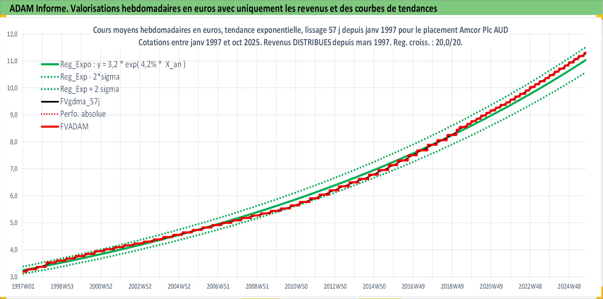 Site dédié aux investisseursPage dédiée sur site financeAnalyse des valorisations hebdomadaires de l'action Amcor Plc AUD. Cet actif est cote en AUD. Les valorisations sont en contrevaleur EURO et couvrent les semaines 1997W01 a 2025W40. Les revenus de cet actif financier sont pris en compte depuis la semaine 1997W12. La note ESG de cet actif n'est pas connue.