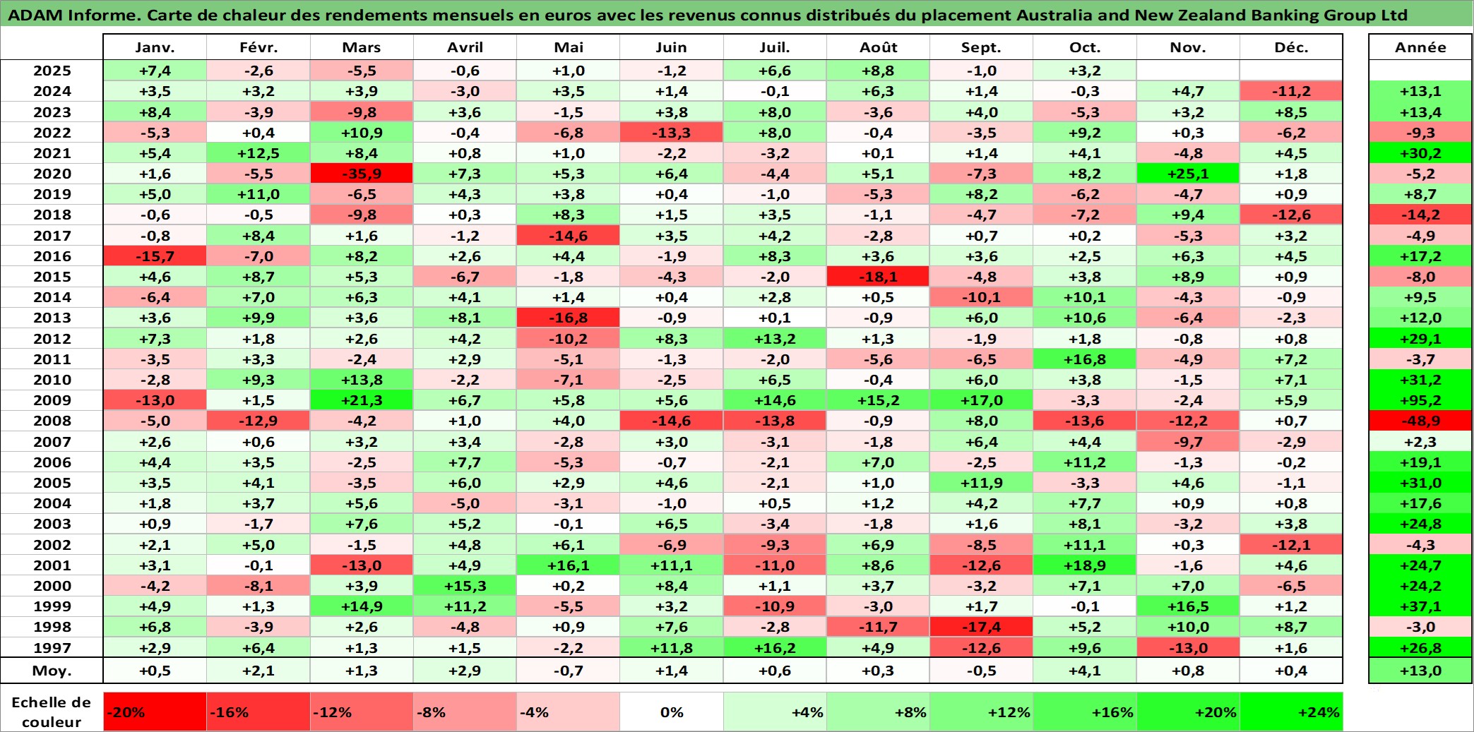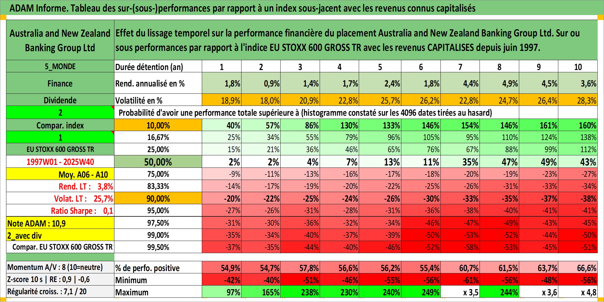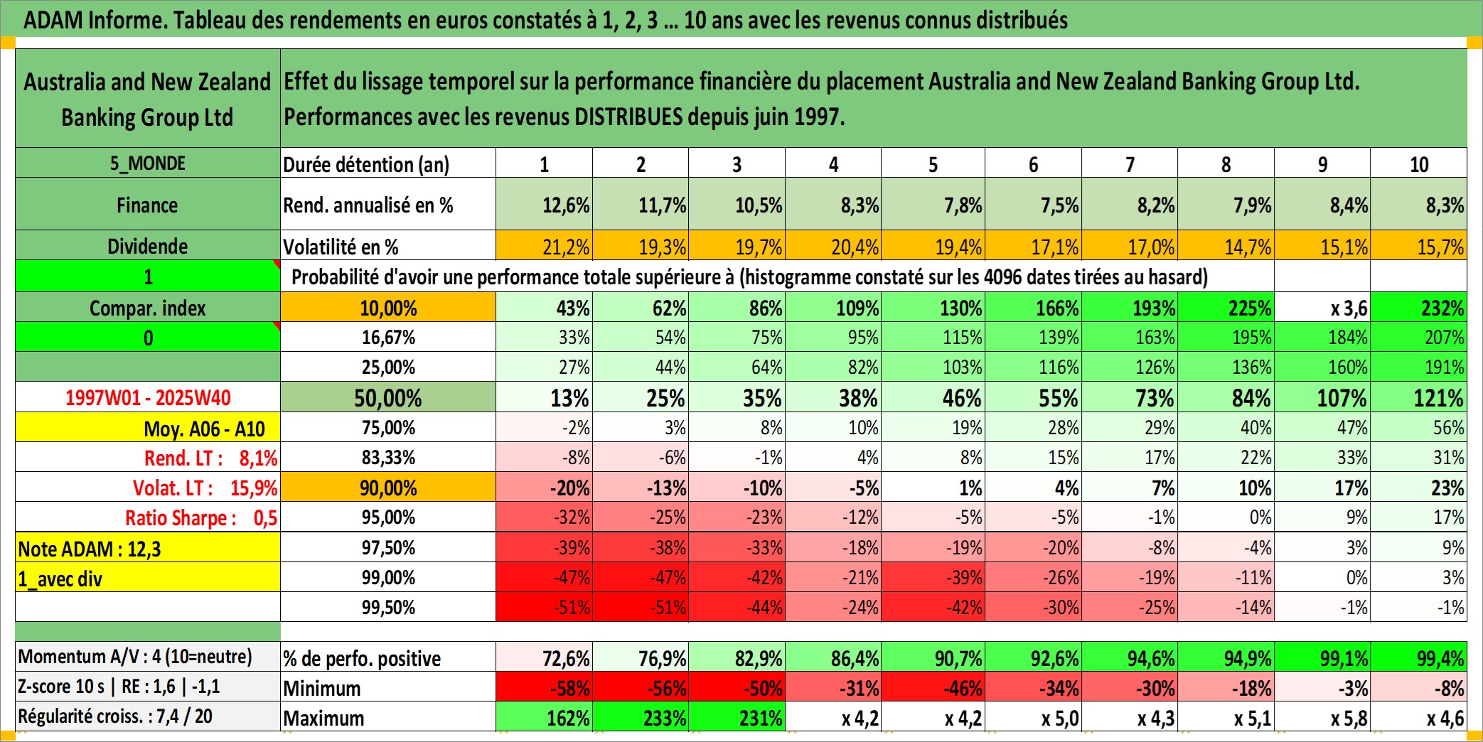Site dédié aux investisseursPage dédiée sur site financeAnalyse des valorisations hebdomadaires de l'action Australia and New Zealand Banking Group Ltd. Cet actif est cote en AUD. Les valorisations sont en contrevaleur EURO et couvrent les semaines 1997W01 a 2025W40. Les revenus de cet actif financier sont pris en compte depuis la semaine 1997W23. La note globale ESG de cet actif est estimee a 11.0 (apres rebasage entre 0 et 20).