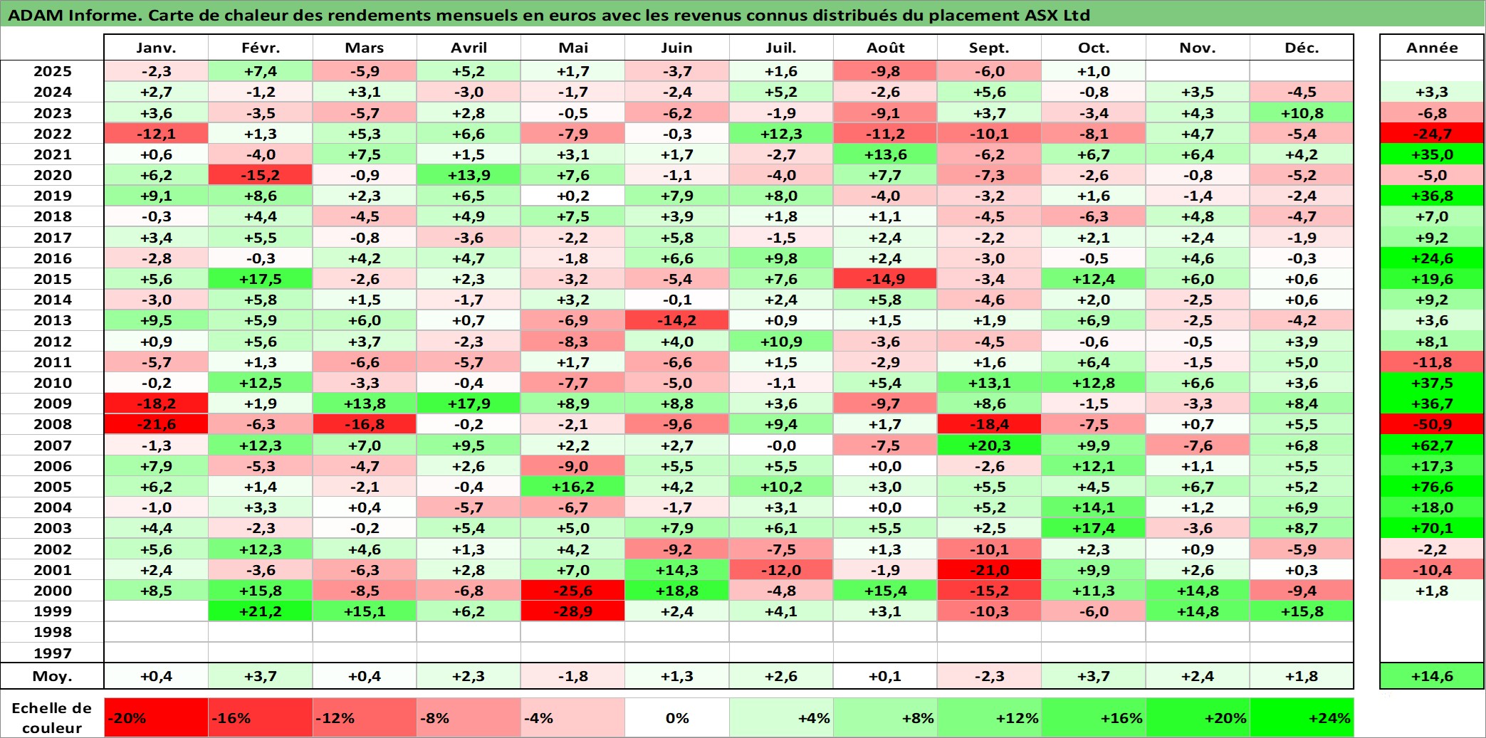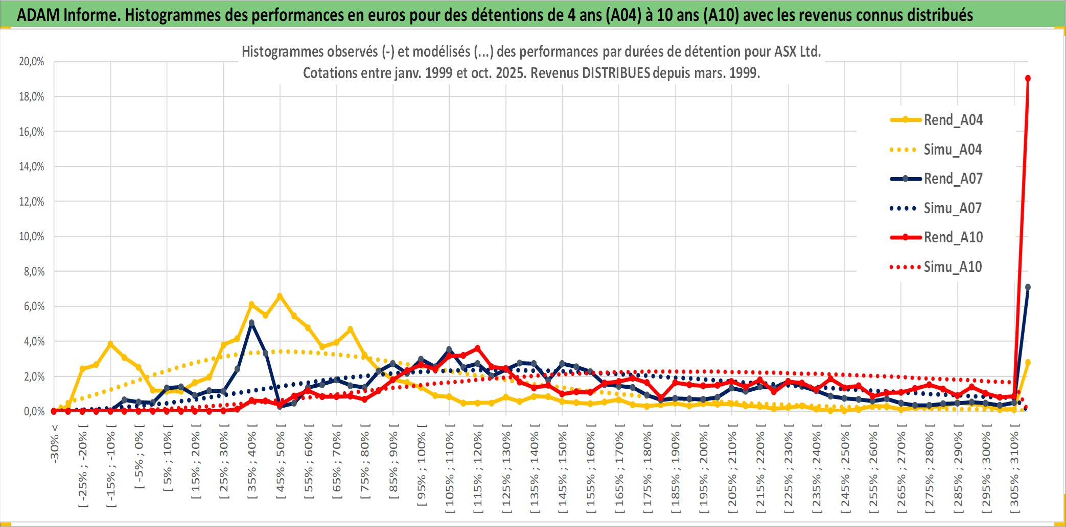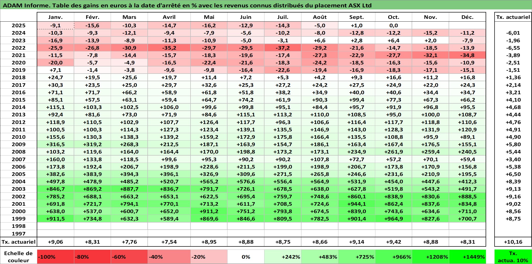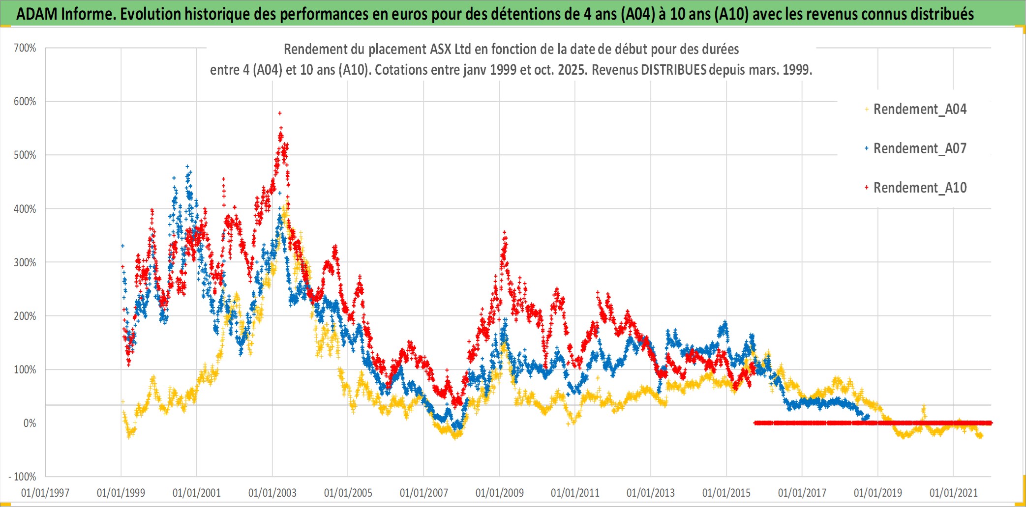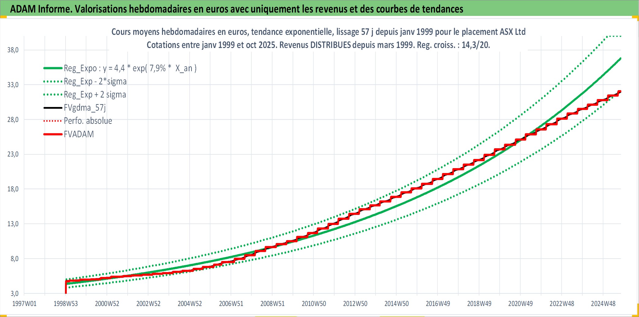 Site dédié aux investisseursPage dédiée sur site financeAnalyse des valorisations hebdomadaires de l'action ASX Ltd. Cet actif est cote en AUD. Les valorisations sont en contrevaleur EURO et couvrent les semaines 1999W01 a 2025W40. Les revenus de cet actif financier sont pris en compte depuis la semaine 1999W10. La note globale ESG de cet actif est estimee a 10.0 (apres rebasage entre 0 et 20).