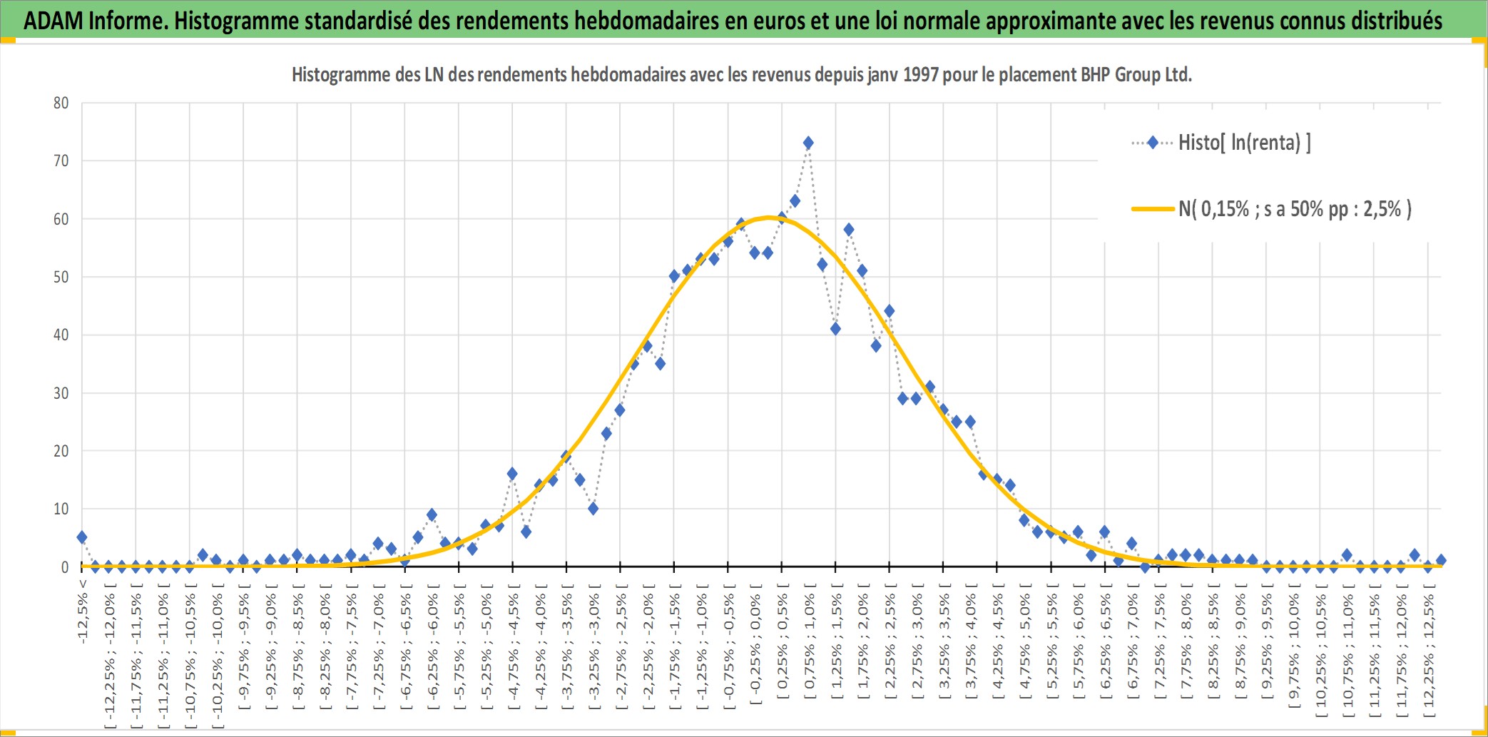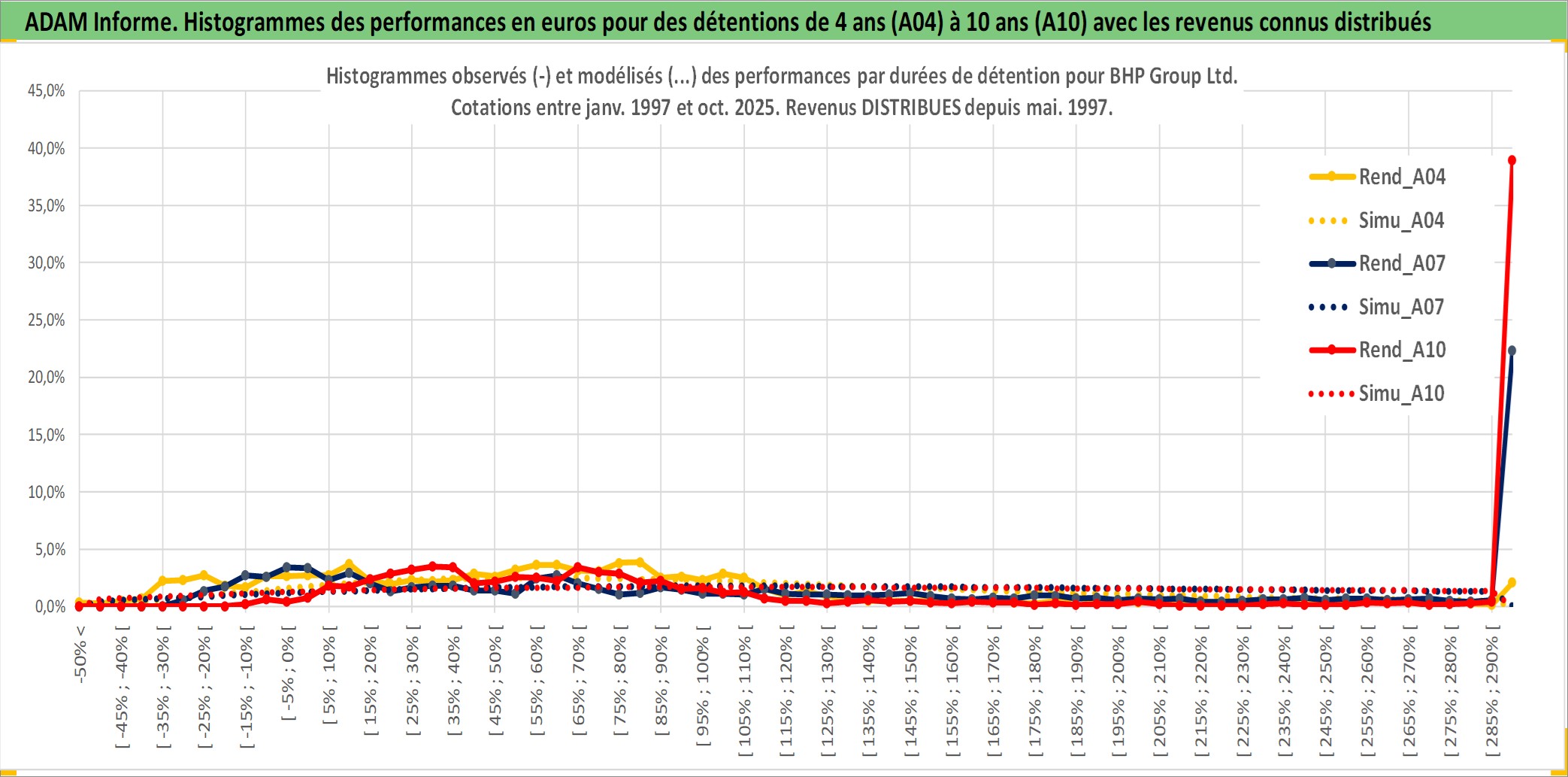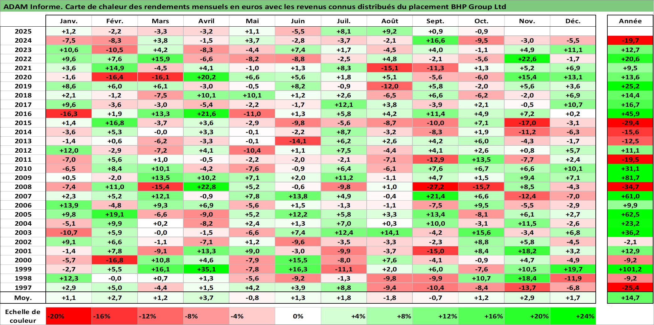 Site dédié aux investisseursPage dédiée sur site financeAnalyse des valorisations hebdomadaires de l'action BHP Group Ltd. Cet actif est cote en AUD. Les valorisations sont en contrevaleur EURO et couvrent les semaines 1997W01 a 2025W40. Les revenus de cet actif financier sont pris en compte depuis la semaine 1997W20. La note globale ESG de cet actif est estimee a 7.0 (apres rebasage entre 0 et 20).