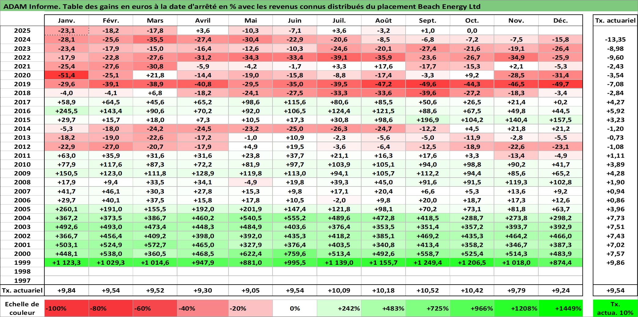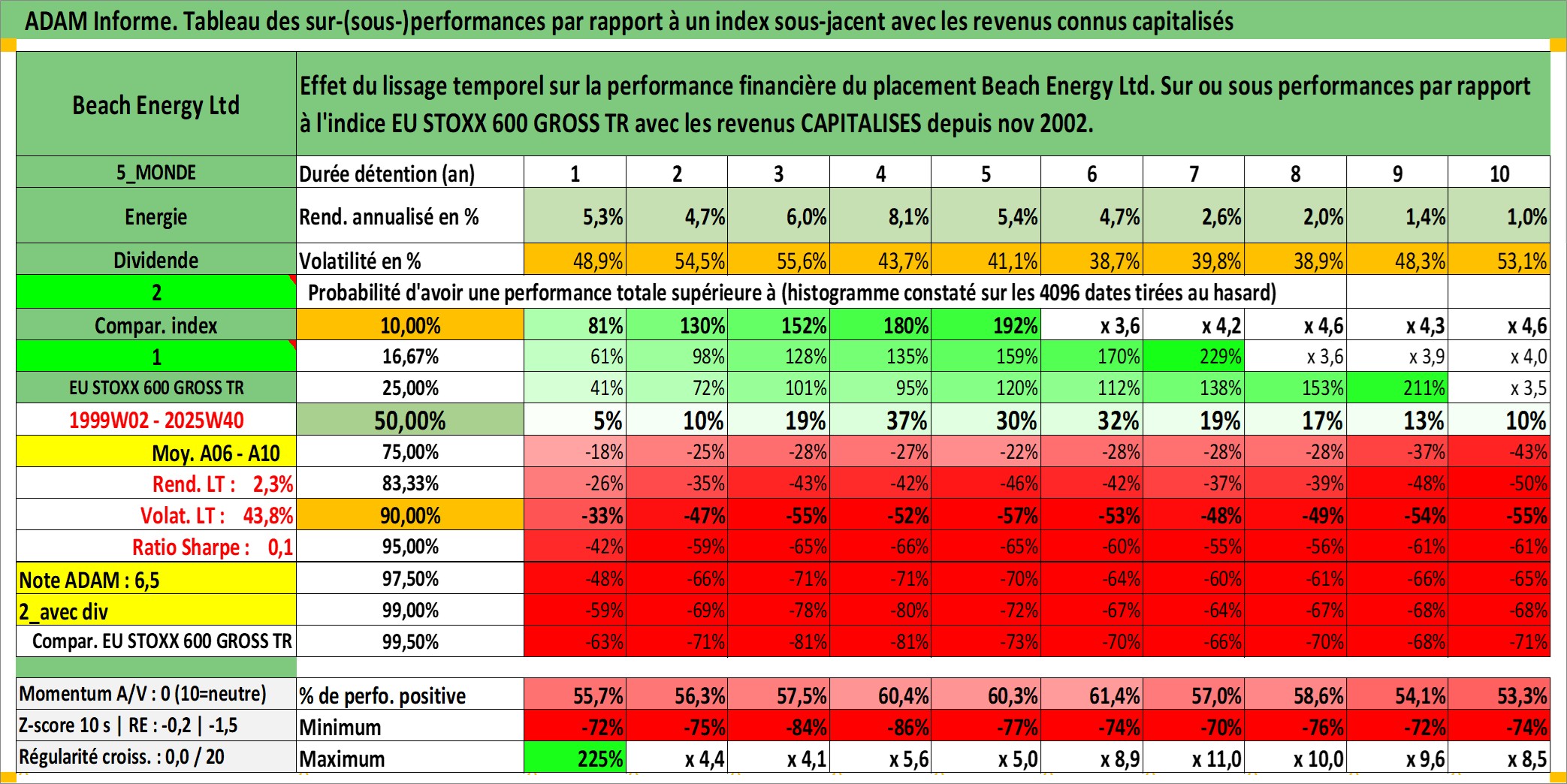 Site dédié aux investisseursPage dédiée sur site financeAnalyse des valorisations hebdomadaires de l'action Beach Energy Ltd. Cet actif est cote en AUD. Les valorisations sont en contrevaleur EURO et couvrent les semaines 1999W02 a 2025W40. Les revenus de cet actif financier sont pris en compte depuis la semaine 2002W46. La note ESG de cet actif n'est pas connue.