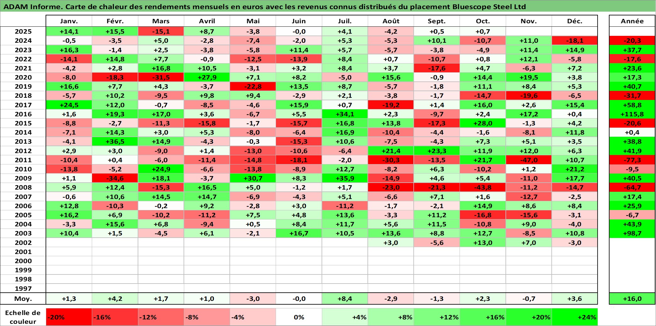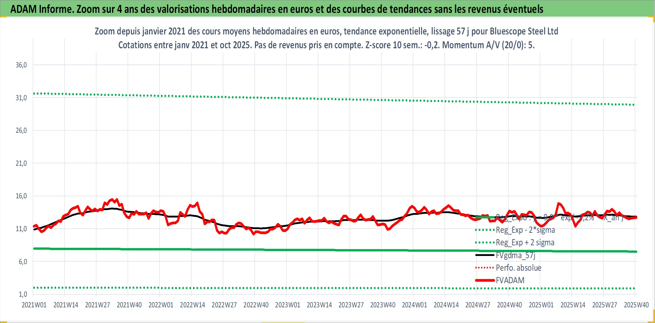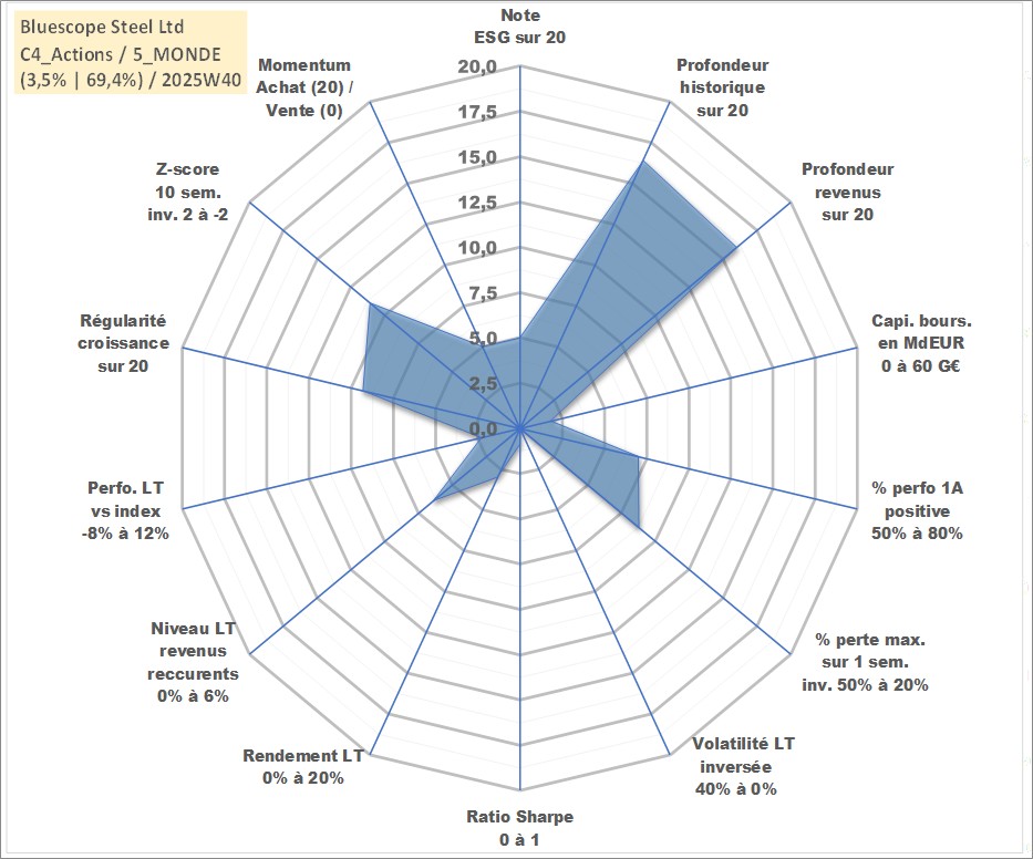 Site dédié aux investisseursPage dédiée sur site financeAnalyse des valorisations hebdomadaires de l'action Bluescope Steel Ltd. Cet actif est cote en AUD. Les valorisations sont en contrevaleur EURO et couvrent les semaines 2002W28 a 2025W40. Les revenus de cet actif financier sont pris en compte depuis la semaine 2003W11. La note globale ESG de cet actif est estimee a 5.0 (apres rebasage entre 0 et 20).