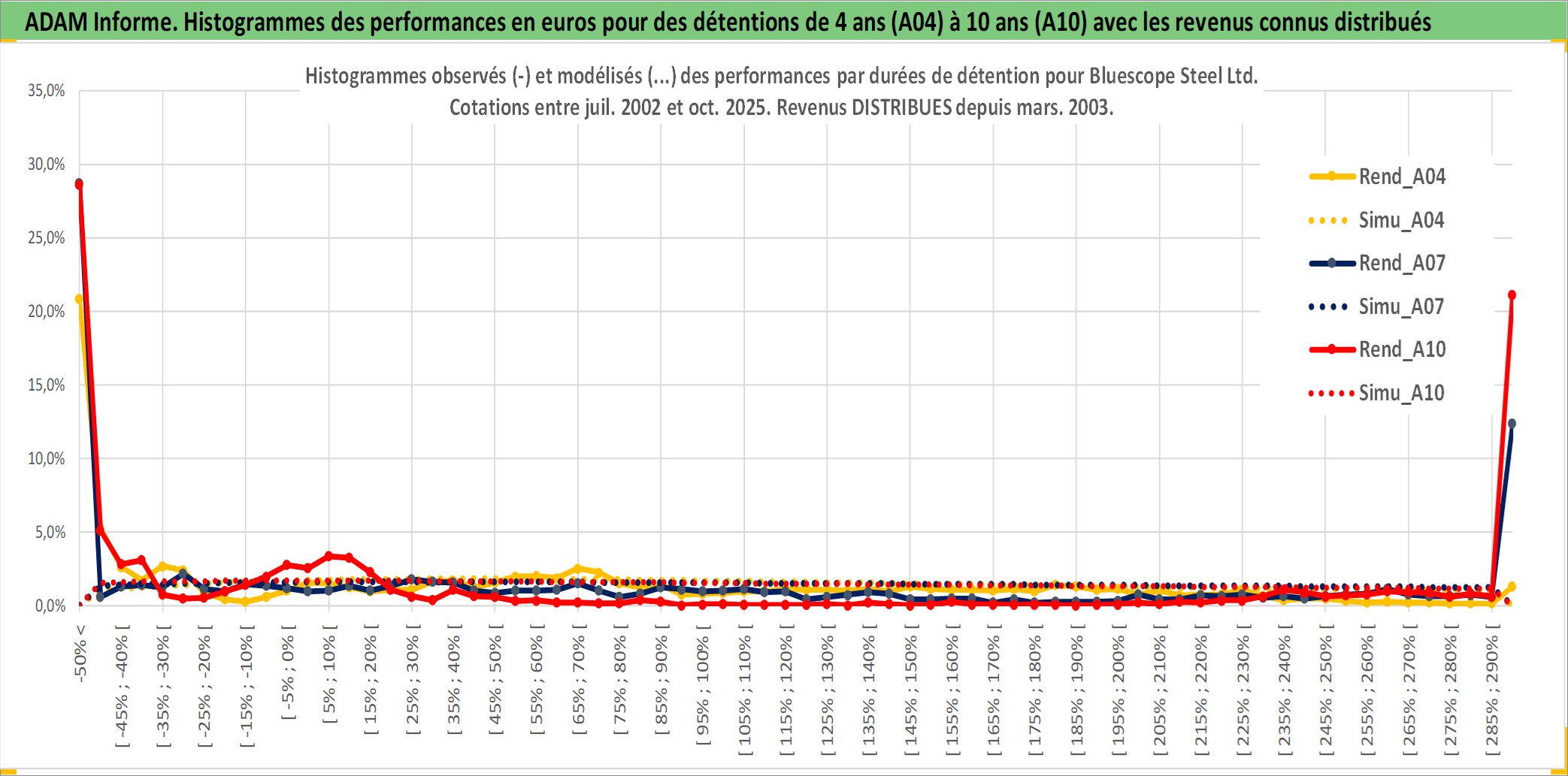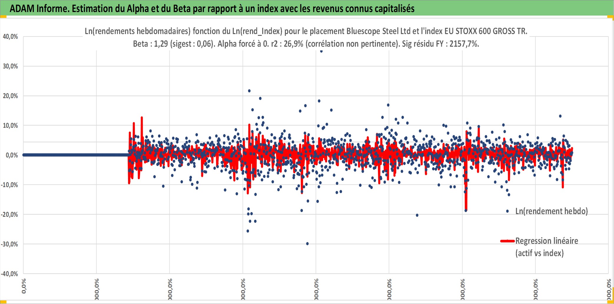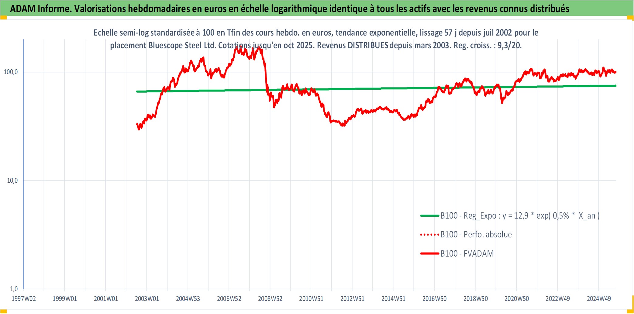 Site dédié aux investisseursPage dédiée sur site financeAnalyse des valorisations hebdomadaires de l'action Bluescope Steel Ltd. Cet actif est cote en AUD. Les valorisations sont en contrevaleur EURO et couvrent les semaines 2002W28 a 2025W40. Les revenus de cet actif financier sont pris en compte depuis la semaine 2003W11. La note globale ESG de cet actif est estimee a 5.0 (apres rebasage entre 0 et 20).