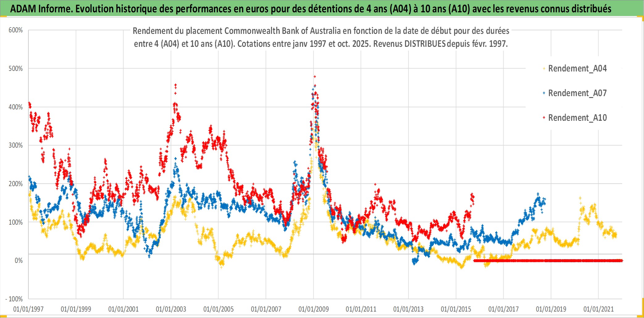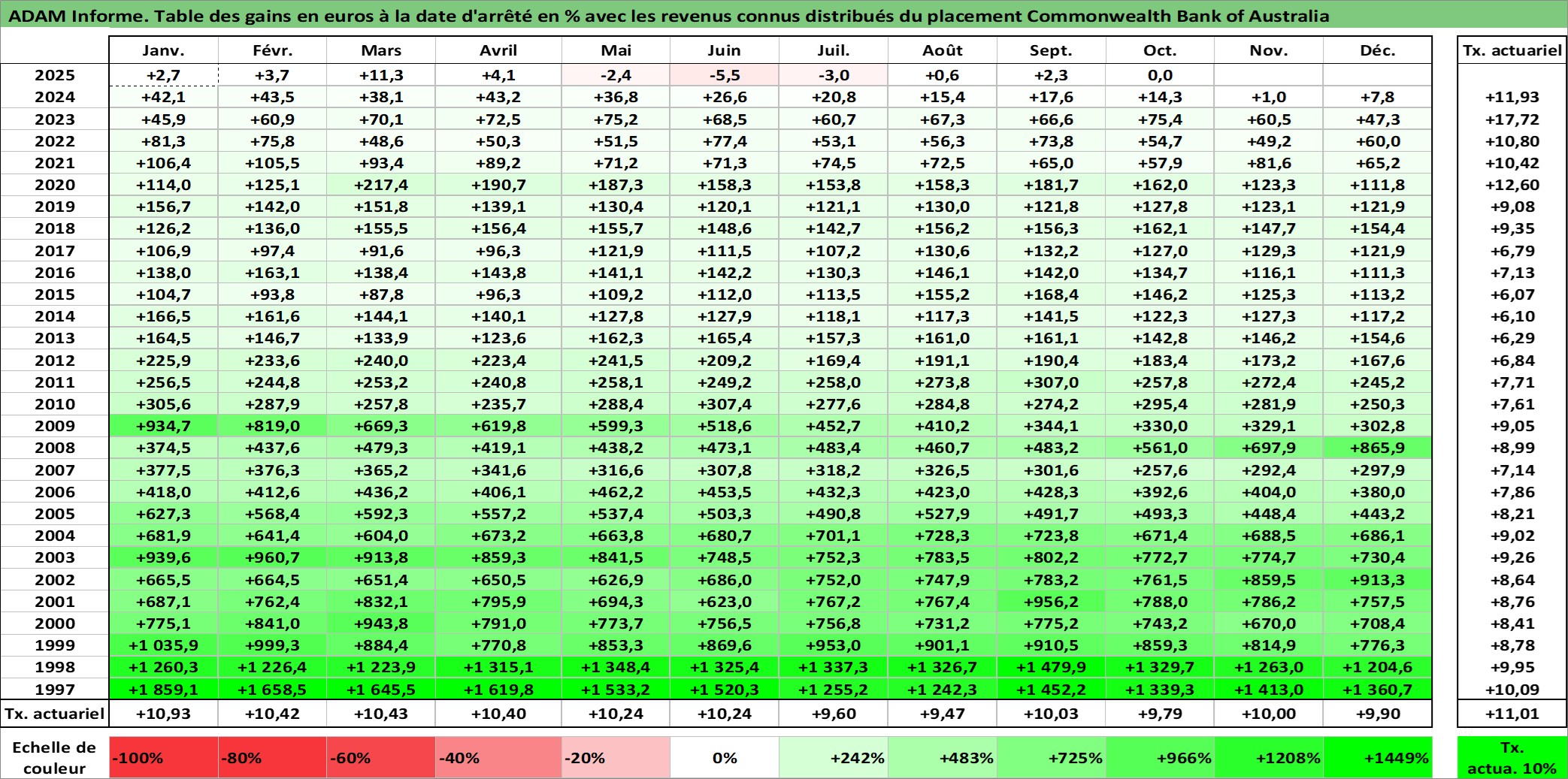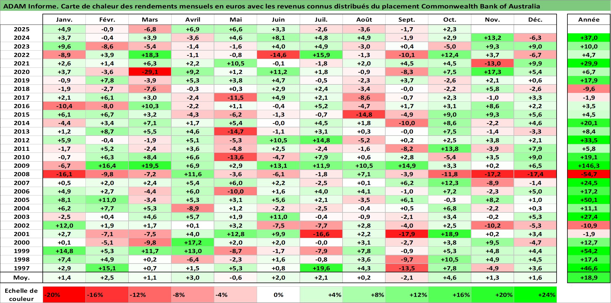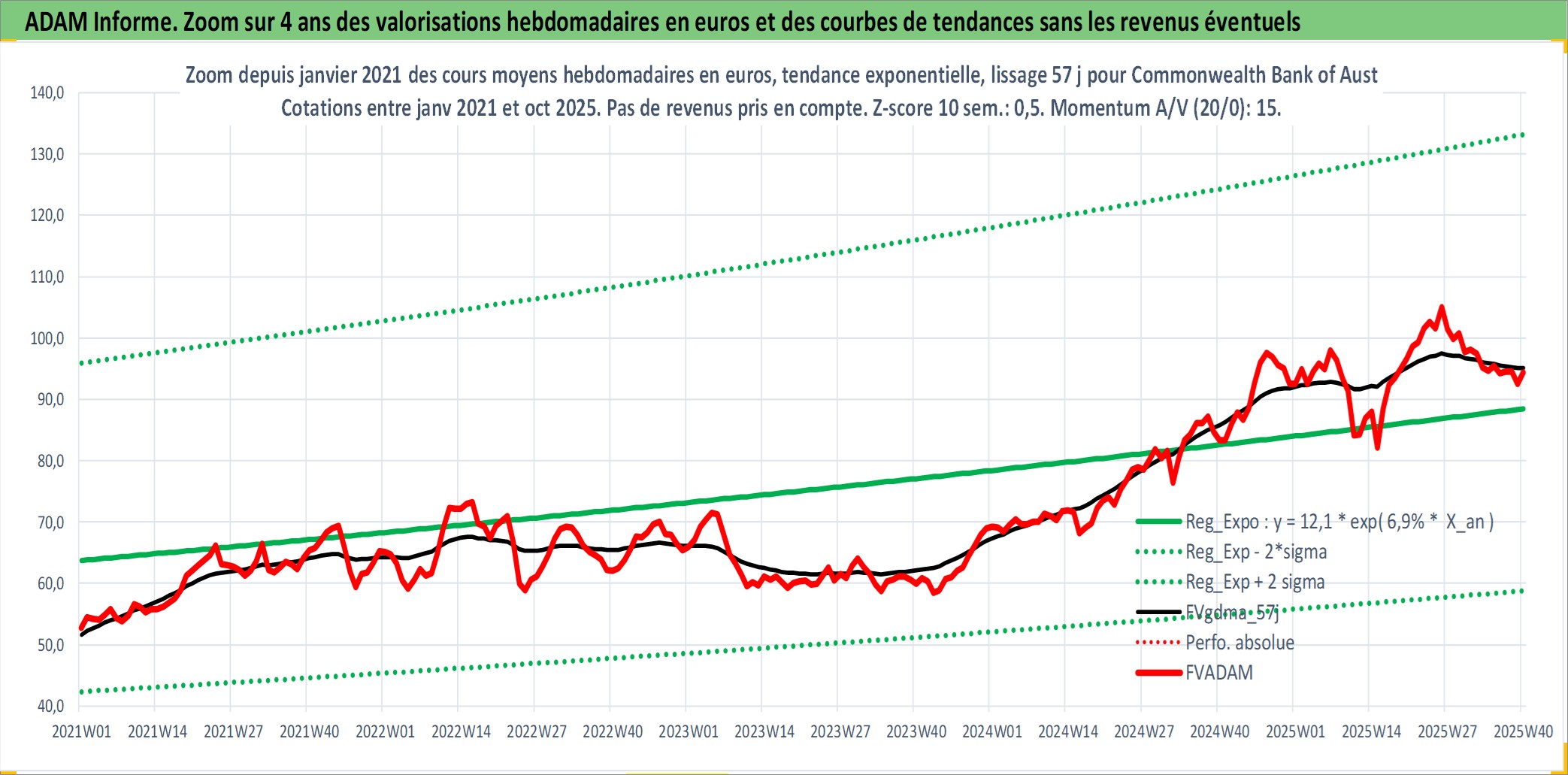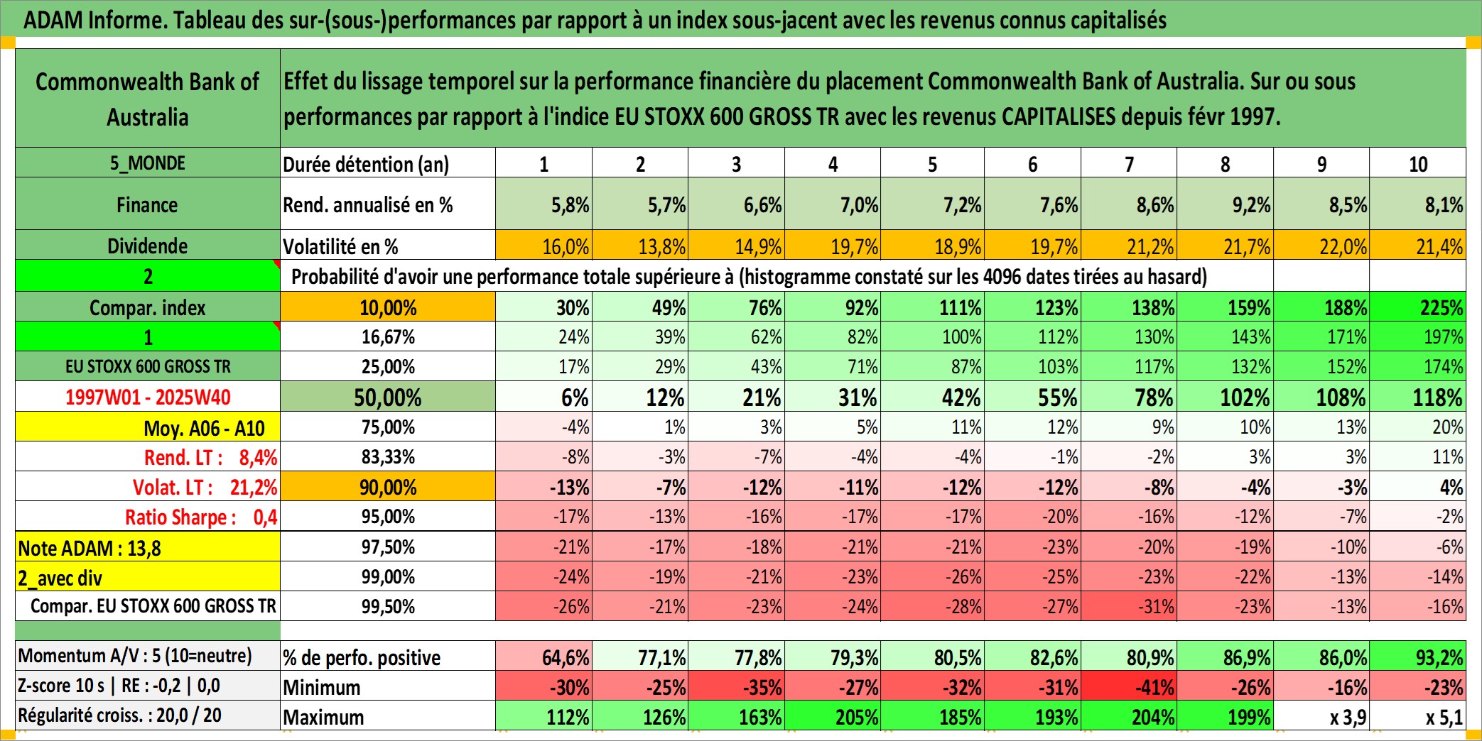 Site dédié aux investisseursPage dédiée sur site financeAnalyse des valorisations hebdomadaires de l'action Commonwealth Bank of Australia. Cet actif est cote en AUD. Les valorisations sont en contrevaleur EURO et couvrent les semaines 1997W01 a 2025W40. Les revenus de cet actif financier sont pris en compte depuis la semaine 1997W08. La note globale ESG de cet actif est estimee a 9.0 (apres rebasage entre 0 et 20).